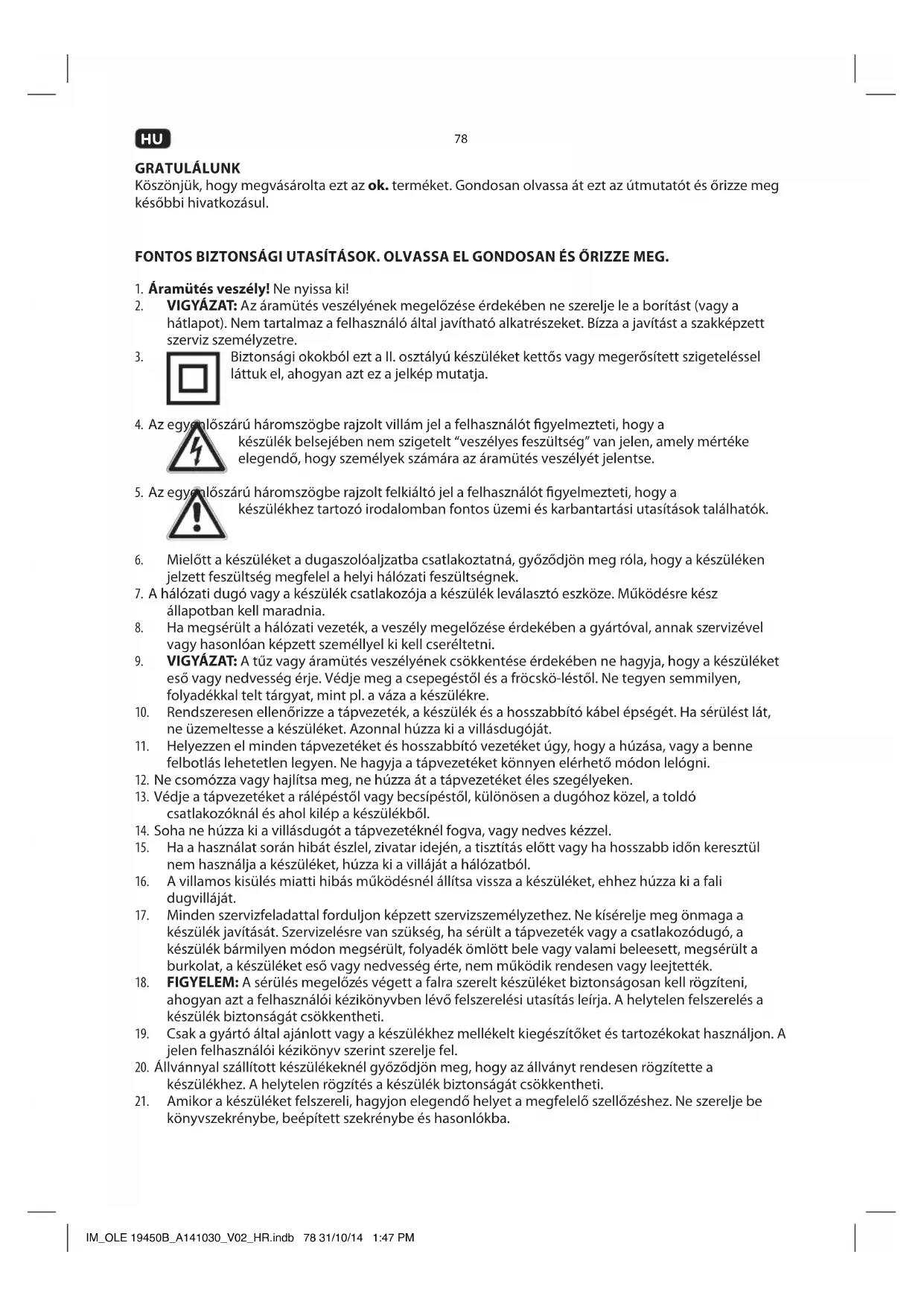 ELHELYEZÉSE A kerekes kuka áthúzott képe jelzi, hogy a villamos és elektronikus készülékeket külön kell gyűjteni (WEEE). A villamos és elektronikus készülékek veszélyes és kockázatos anyagokat tartalmazhatnak. Ne tegye ezt a készüléket a válogatás nélküli kommunális hulladékba. Vigye el a villamos és elektronikus készülékek számára kijelölt WEEE gyűjtőpontba. Ha így tesz, segít megőrizni a természeti erőforrásokat és védi a környezetet. További információért vegye fel a kapcsolatot az értékesítőjével vagy a helyi hatósággal. IM_OLE 19450B_A141030_V02_HR.indb 92 31/10/14 1:47 PM93