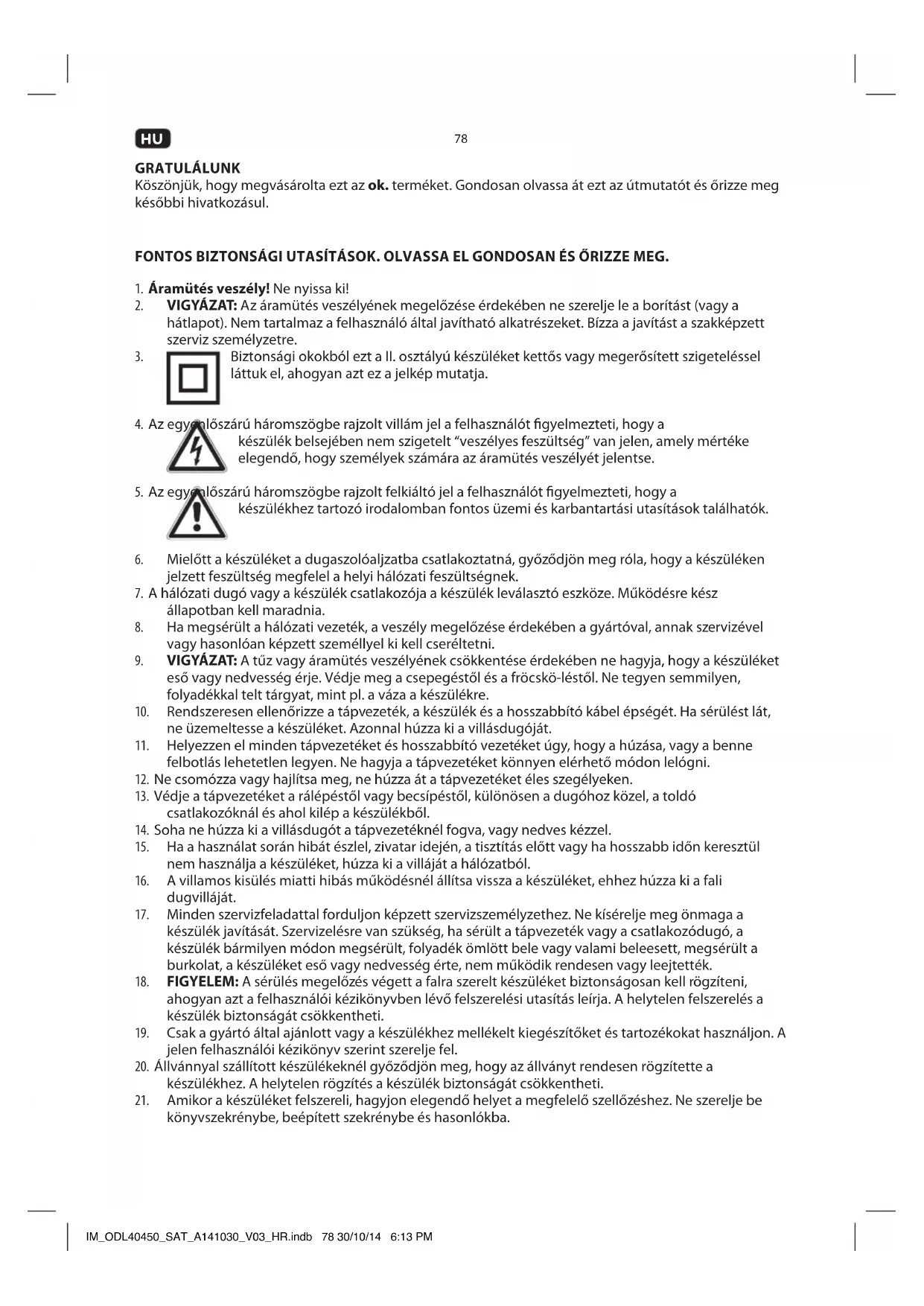 A berendezést audio, video és televíziós jelek fogadására és lejátszására tervezték. Csak a jelen utasításoknak megfelelően használja. A helytelen használat veszélyes, és érvényteleníti a jótállási igényt. Vegye gyelembe a biztonsági utasításokat. IM_ODL40450_SAT_A141030_V03_HR.indb 79 30/10/14 6:13 PM80
