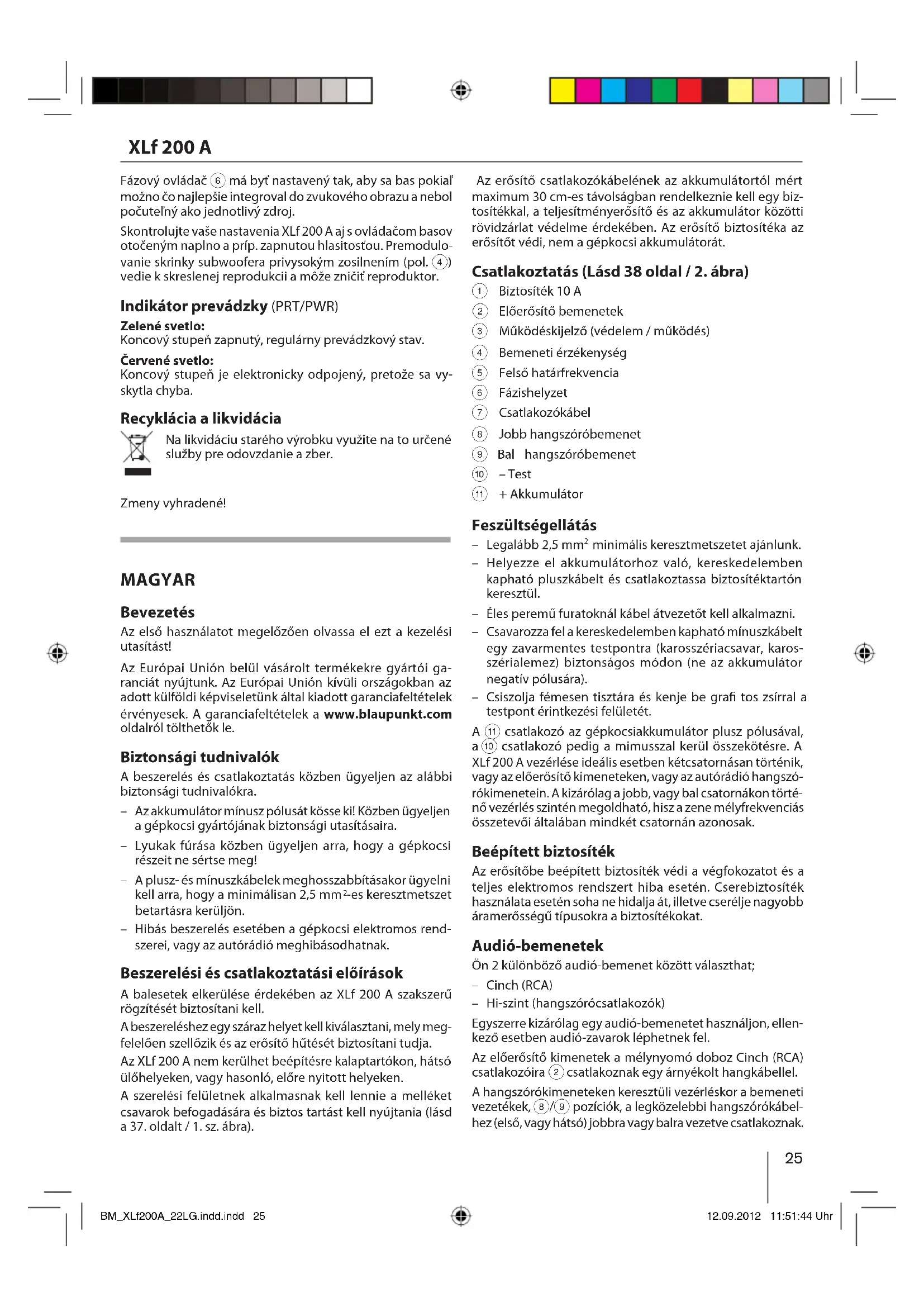 Fázový ovládač 6 má byť nastavený tak, aby sa bas pokiaľ možno čo najlepšie integroval do zvukového obrazu a nebol počuteľný ako jednotlivý zdroj. Skontrolujte vaše nastavenia XLf 200 A aj s ovládačom basov otočeným naplno a príp. zapnutou hlasitosťou. Premodulo- vanie skrinky subwoofera privysokým zosilnením (pol. vedie k skreslenej reprodukcii a môže zničiť reproduktor. Indikátor prevádzky (PRT/PWR) Zelené svetlo: Koncový stupeň zapnutý, regulárny prevádzkový stav. Červené svetlo: Koncový stupeň je elektronicky odpojený, pretože sa vy- skytla chyba. Recyklácia a likvidácia Na likvidáciu starého výrobku využite na to určené služby pre odovzdanie a zber. Zmeny vyhradené! MAGYAR Bevezetés Az első használatot megelőzően olvassa el ezt a kezelési utasítást! Az Európai Unión belül vásárolt termékekre gyártói ga- ranciát nyújtunk. Az Európai Unión kívüli országokban az adott külföldi képviseletünk által kiadott garanciafeltételek érvényesek. A garanciafeltételek a www.blaupunkt.com oldalról tölthetők le. Biztonsági tudnivalók A beszerelés és csatlakoztatás közben ügyeljen az alábbi biztonsági tudnivalókra. Az akkumulátor mínusz pólusát kösse ki! Közben ügyeljen a gépkocsi gyártójának biztonsági utasításaira. Lyukak fúrása közben ügyeljen arra, hogy a gépkocsi részeit ne sértse meg! A plusz- és mínuszkábelek meghosszabbításakor ügyelni kell arra, hogy a minimálisan 2,5 mm