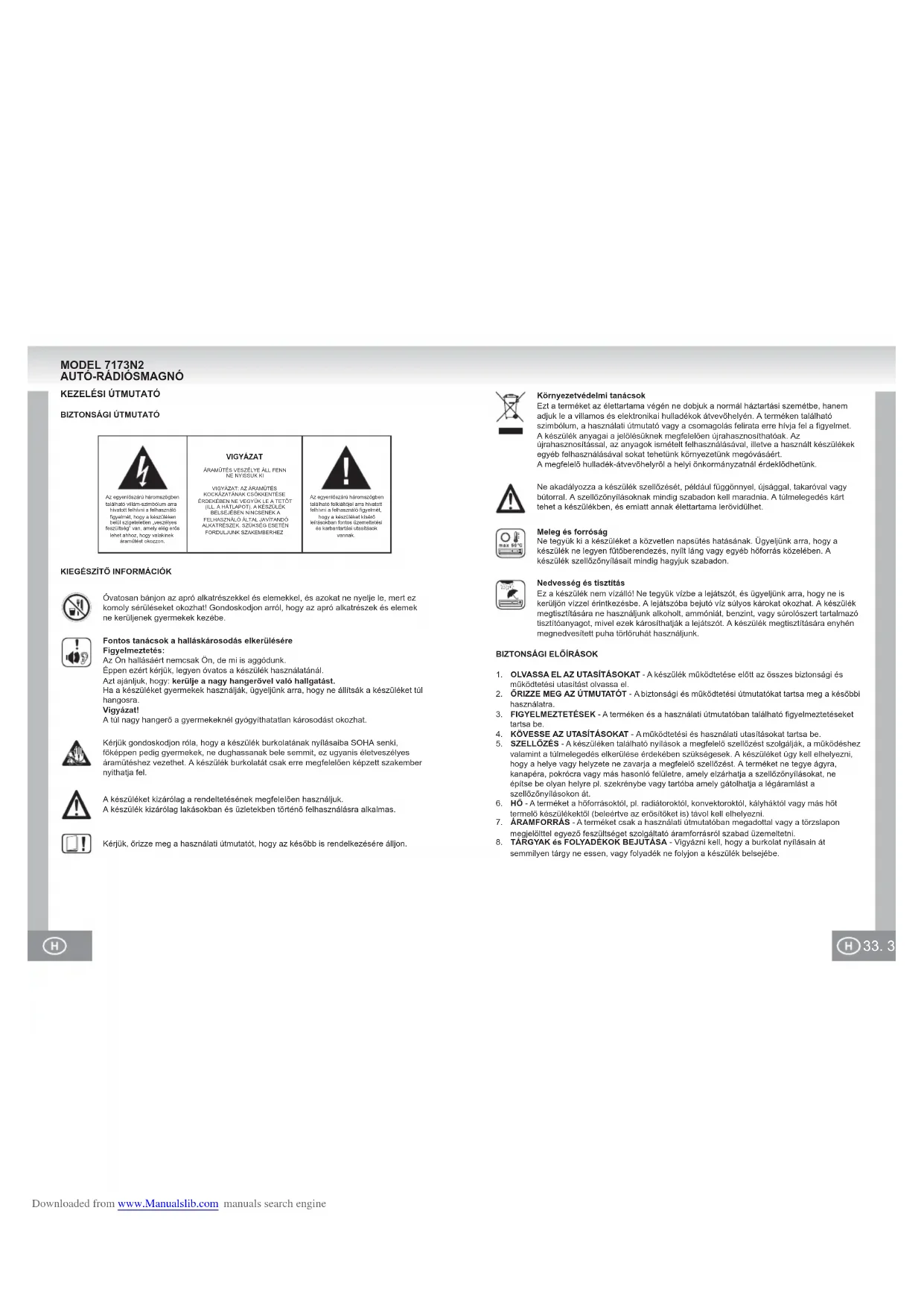 Kérjük, őrizze meg a használati útmutatót, hogy az később is rendelkezésére álljon.Kérjük gondoskodjon róla, hogy a készülék burkolatának nyílásaiba SOHA senki, főképpen pedig gyermekek, ne dughassanak bele semmit, ez ugyanis életveszélyes áramütéshez vezethet. A készülék burkolatát csak erre megfelelően képzett szakember nyithatja fel.Óvatosan bánjon az apró alkatrészekkel és elemekkel, és azokat ne nyelje le, mert ez komoly sérüléseket okozhat! Gondoskodjon arról, hogy az apró alkatrészek és elemek ne kerüljenek gyermekek kezébe.Fontos tanácsok a halláskárosodás elkerüléséreFigyelmeztetés:Az Ön hallásáért nemcsak Ön, de mi is aggódunk.Éppen ezért kérjük, legyen óvatos a készülék használatánál.Azt ajánljuk, hogy: kerülje a nagy hangerővel való hallgatást.Ha a készüléket gyermekek használják, ügyeljünk arra, hogy ne állítsák a készüléket túl hangosra.Vigyázat!A túl nagy hangerő a gyermekeknél gyógyíthatatlan károsodást okozhat.A készüléket kizárólag a rendeltetésének megfelelõen használjuk.A készülék kizárólag lakásokban és üzletekben történõ felhasználásra alkalmas.KEZELÉSI ÚTMUTATÓBIZTONSÁGI ÚTMUTATÓKIEGÉSZÍTŐ INFORMÁCIÓKBIZTONSÁGI ELŐÍRÁSOK
