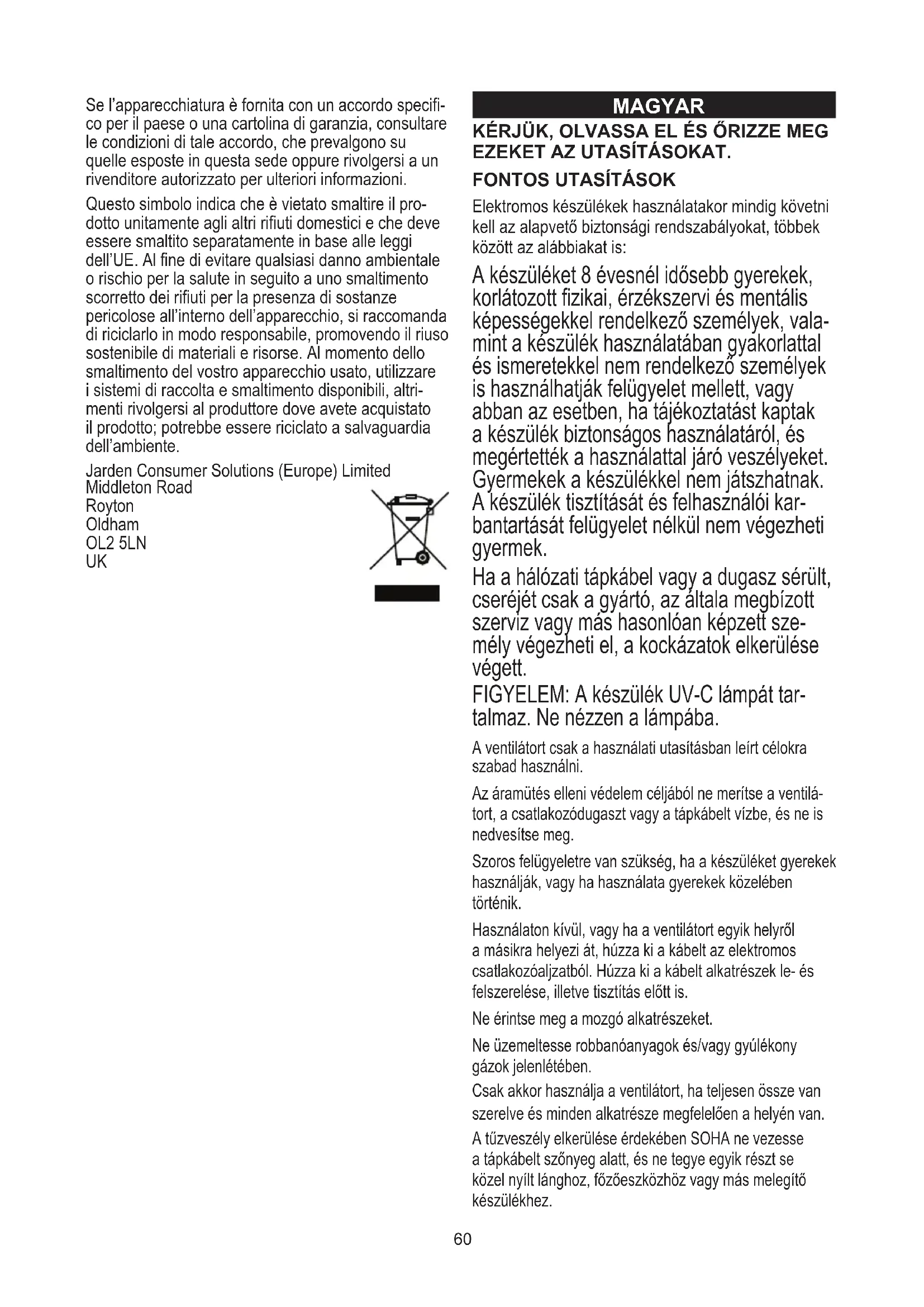Elektromos készülékek használatakor mindig követni kell az alapvető biztonsági rendszabályokat, többek között az alábbiakat is: A készüléket 8 évesnél idősebb gyerekek, korlátozott zikai, érzékszervi és mentális képességekkel rendelkező személyek, vala- mint a készülék használatában gyakorlattal és ismeretekkel nem rendelkező személyek is használhatják felügyelet mellett, vagy abban az esetben, ha tájékoztatást kaptak a készülék biztonságos használatáról, és megértették a használattal járó veszélyeket. Gyermekek a készülékkel nem játszhatnak. A készülék tisztítását és felhasználói kar- bantartását felügyelet nélkül nem végezheti gyermek. Ha a hálózati tápkábel vagy a dugasz sérült, cseréjét csak a gyártó, az általa megbízott szerviz vagy más hasonlóan képzett sze- mély végezheti el, a kockázatok elkerülése végett. FIGYELEM: A készülék UV-C lámpát tar- talmaz. Ne nézzen a lámpába. A ventilátort csak a használati utasításban leírt célokra szabad használni. Az áramütés elleni védelem céljából ne merítse a ventilá- tort, a csatlakozódugaszt vagy a tápkábelt vízbe, és ne is nedvesítse meg. Szoros felügyeletre van szükség, ha a készüléket gyerekek használják, vagy ha használata gyerekek közelében történik. Használaton kívül, vagy ha a ventilátort egyik helyről a másikra helyezi át, húzza ki a kábelt az elektromos csatlakozóaljzatból. Húzza ki a kábelt alkatrészek le- és felszerelése, illetve tisztítás előtt is. Ne érintse meg a mozgó alkatrészeket. Ne üzemeltesse robbanóanyagok és/vagy gyúlékony gázok jelenlétében. Csak akkor használja a ventilátort, ha teljesen össze van szerelve és minden alkatrésze megfelelően a helyén van. A tűzveszély elkerülése érdekében SOHA ne vezesse a tápkábelt szőnyeg alatt, és ne tegye egyik részt se közel nyílt lánghoz, főzőeszközhöz vagy más melegítő készülékhez. Se l’apparecchiatura è fornita con un accordo speci- co per il paese o una cartolina di garanzia, consultare le condizioni di tale accordo, che prevalgono su quelle esposte in questa sede oppure rivolgersi a un rivenditore autorizzato per ulteriori informazioni. Questo simbolo indica che è vietato smaltire il pro- dotto unitamente agli altri riuti domestici e che deve essere smaltito separatamente in base alle leggi dell’UE. Al ne di evitare qualsiasi danno ambientale o rischio per la salute in seguito a uno smaltimento scorretto dei riuti per la presenza di sostanze pericolose all’interno dell’apparecchio, si raccomanda di riciclarlo in modo responsabile, promovendo il riuso sostenibile di materiali e risorse. Al momento dello smaltimento del vostro apparecchio usato, utilizzare i sistemi di raccolta e smaltimento disponibili, altri- menti rivolgersi al produttore dove avete acquistato il prodotto; potrebbe essere riciclato a salvaguardia dell’ambiente. Jarden Consumer Solutions (Europe) Limited Middleton Road Royton Oldham OL2 5LN UK61 A védőrács eltávolítása előtt feltétlenül kapcsolja le a ventilátort a táphálózatról. Semmilyen készüléket ne üzemeltessen sérült tápkábellel, csatlakozódugóval, meghibásodás esetén, vagy ha leejtet- ték, illetve bármilyen más módon károsodott. Nem a készülék gyártója által ajánlott vagy forgalmazott tartozékok veszélyesek lehetnek. Ne használja a szabadban. Ne engedje, hogy a tápkábel lelógjon az asztalról vagy munkapultról. A kábel ne érjen forró felületekhez. Mindig száraz, sima felületre helyezze. Ne használja, ha a ventilátor rácsai nincsenek a helyükön. Ezen terméket CSAK háztartási használatra tervezték, nem üzleti vagy ipari alkalmazásokra. Ha a fűtőtest nem működik, először ellenőrizze, hogy a dugaszban lévő biztosíték (csak az Egyesült Királyságban) vagy az elosztótáblán lévő biztosíték/ árammegszakító működik-e, és csak azután lépjen kapcsolatba a gyártóval vagy a szervizzel. MEGNEVEZÉSEK (LÁSD AZ 1) A Szűrő visszaállítása gomb B LCD-kijelző C Időzítő választógombja D UV/ionizálás módválasztó gomb E Ventilátor fordulatszáma választógomb F Be/ki gomb G UV aktív ikon H Ventilátor fordulatszám-kijelző I Ionizálás aktív ikon J Időzítő aktív ikon K Szűrő szervizelés jelzőikon L Bekapcsolás jelzőlámpa M Világító csík N Légkimeneti rács O Hordozófogantyú P Hátsó rács retesze Q Hátsó rács R Tápkábel