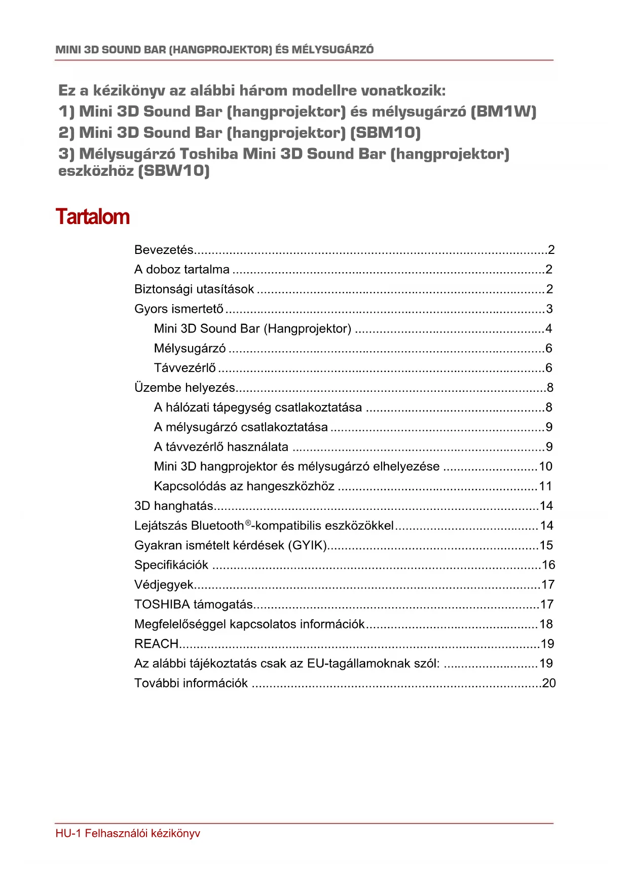 eszközhöz (SBW10)Felhasználói kézikönyv HU-2 MINI 3D SOUND BAR (HANGPROJEKTOR) ÉS MÉLYSUGÁRZÓ Bevezetés Üdvözöljük, és köszönjük, hogy TOSHIBA terméket vásárolt. Javasoljuk, hogy figyelmesen olvassa el ezt a kézikönyvet és őrizze meg a későbbiekre a termék dokumentációjával együtt. A doboz tartalma Ellenőrizze, hogy a doboz tartalmazza-e az itt felsorolt tételek mindegyikét: Biztonsági utasítások Az eszköz hibás működésének vagy sérülésének megelőzése érdekében tartsa szem előtt az alábbi óvintézkedéseket. ■ Tiltások ■ Ne nyissa fel a burkolatot és a terméket. ■ Ne szerelje szét a terméket és alkatrészeit. ■ Ne helyezzen folyadékot a termékre vagy annak közelébe, mert az kárt tehet a termékben, személyi sérülést okozhat, illetve áramütéshez vagy tűzhöz vezethet. ■ Ne ütögesse, ejtse le vagy rázza a terméket. Ez a kézikönyv foglalkozik mind a Mini 3D Sound Bar (hangprojektor), mind pedig a mélysugárzó használatával. A Mini 3D hangprojektort és mélysugárzót igény szerint készletként illetve külön-külön egyenként is megvásárolhatja. Ez a kézikönyv a „hangprojektor” kifejezést a Mini 3D Sound Bar rövid megnevezéseként használja. MEGJEGYZÉS User’s Manual Mini 3D Sound Bar (Hangprojektor) Mélysugárzó (ha van ilyen) Hálózati tápegység 3,5mm-es RCA hangkábel Távirányító elemmel Felhasználói Kézikönyv és GarancialevélHU-3 Felhasználói kézikönyv MINI 3D SOUND BAR (HANGPROJEKTOR) ÉS MÉLYSUGÁRZÓ ■ Ne mozgassa a terméket működés közben, mert megsérülhetnek az adatok. ■ Ne használjon az eszközhöz kapottól eltérő hálózati tápegységet, mert kár keletkezhet az eszközben. ■ Ne válassza le a kábeleket működés közben. ■ Ne tegye ki a terméket az 5–35 °C-os (üzemeléskor), illetve a -20– 60 °C-os (kikapcsolva) tartományon kívül eső hőmérséklet hatásának. ■ Ne tegye ki a terméket nedves vagy nyirkos környezet hatásának. ■ Ne takarja le a terméket működés közben, mert túlmelegedhet. ■ Ne helyezze a terméket forró berendezés közelébe. ■ Ne dobja tűzbe a távvezérlőhöz tartozó elemet (melyet a Mini 3D hangprojektorhoz mellékelve talál meg), mert ez az elem felrobbanásához vezethet. ■ Ne hagyja a távvezérlőhöz tartozó elemet gyermekek által elérhető helyen, mert a gyermekek lenyelhetik a gombelemet. ■ Azonnal válassza le a terméket, ha ■ füst vagy szokatlan szag száll ki a burkolata alól; ■ víz jutott a burkolata alá, vagy nedves lett a termék; ■ valamilyen tárgy került a termék burkolata alá; ■ a kábel megsérült (ilyen esetben cserélje ki a kábelt egy újra). ■ A Mini 3D Sound Bar (hangprojektor) a hangszórókhoz tartozó mágneseket tartalmaz. A mágnesek adatvesztést okozhatnak a mágneses adattároló eszközökön, mint például a videószalagokon, merevlemezeken és bankkártyákon. Emiatt kérjük tartsa távol a hangprojektort ezektől a termékektől. Ha az eszköz nem az elvárható módon viselkedik, vagy ha kétségei vannak az elektromos biztonságot illetően, akkor azonnal hívja a TOSHIBA forródrótjának számát, vagy forduljon a cég hivatalos viszonteladójához. Gyors ismertető Ez a fejezet a Mini 3D Sound Bar (hangprojektor) különböző részeit mutatja be. Az egyes részek leírását az ábrák alatti táblázatokban találja. A vásárolt terméktől függően lehet, hogy nem rendelkezik a Mini 3D Sound Bar (hangprojektor) vagy a mélysugárzó egyikével. MEGJEGYZÉSFelhasználói kézikönyv HU-4 MINI 3D SOUND BAR (HANGPROJEKTOR) ÉS MÉLYSUGÁRZÓ Mini 3D Sound Bar (Hangprojektor) Elölnézet (Mintaábra) A Mini 3D Sound Bar (Hangprojektor) elölnézete Elem Komponens Leírás 1 BEMENET Kiválasztja a forrást (a következő sorozatból: Aux-in, Line-in, Optical, Coaxial majd újra Aux-in). A hangprojektor az alapértelmezett beállítás szerint Aux-in módban van.