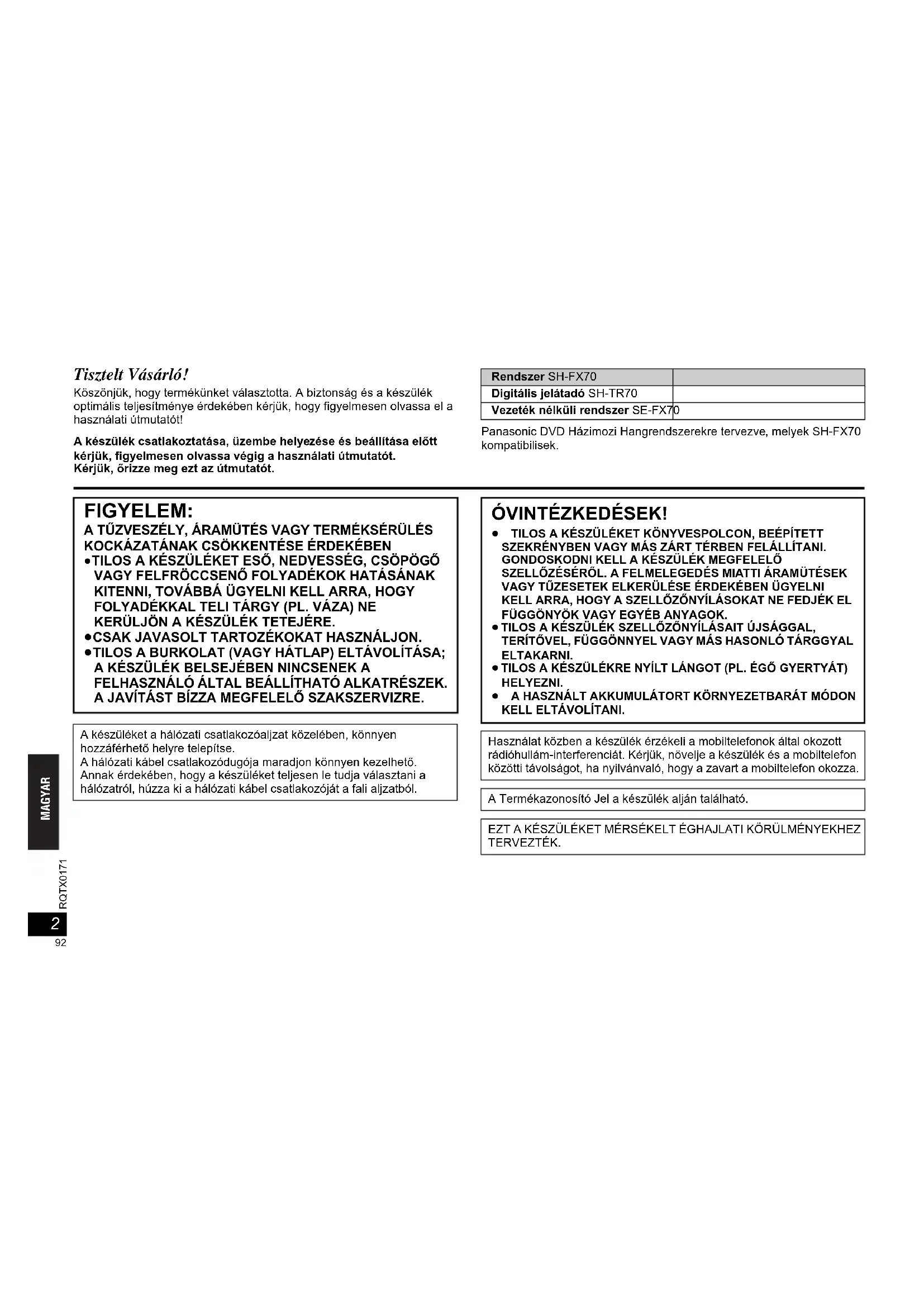 RQTX0171 MAGYAR Tisztelt Vásárló! Köszönjük, hogy termékünket választotta. A biztonság és a készülék optimális teljesítménye érdekében kérjük, hogy figyelmesen olvassa el a használati útmutatót! A készülék csatlakoztatása, üzembe helyezése és beállítása előtt kérjük, figyelmesen olvassa végig a használati útmutatót.Kérjük, őrizze meg ezt az útmutatót. Panasonic DVD Házimozi Hangrendszerekre tervezve, melyek SH-FX70 kompatibilisek.Rendszer SH-FX70Digitális jelátadó SH-TR70Vezeték nélküli rendszer SE-FX70 FIGYELEM: A TŰZVESZÉLY, ÁRAMÜTÉS VAGY TERMÉKSÉRÜLÉS KOCKÁZATÁNAK CSÖKKENTÉSE ÉRDEKÉBEN ≥TILOS A KÉSZÜLÉKET ESŐ, NEDVESSÉG, CSÖPÖGŐ VAGY FELFRÖCCSENŐ FOLYADÉKOK HATÁSÁNAK KITENNI, TOVÁBBÁ ÜGYELNI KELL ARRA, HOGY FOLYADÉKKAL TELI TÁRGY (PL. VÁZA) NE KERÜLJÖN A KÉSZÜLÉK TETEJÉRE. ≥CSAK JAVASOLT TARTOZÉKOKAT HASZNÁLJON. ≥TILOS A BURKOLAT (VAGY HÁTLAP) ELTÁVOLÍTÁSA; A KÉSZÜLÉK BELSEJÉBEN NINCSENEK A FELHASZNÁLÓ ÁLTAL BEÁLLÍTHATÓ ALKATRÉSZEK. A JAVÍTÁST BÍZZA MEGFELELŐ SZAKSZERVIZRE. A készüléket a hálózati csatlakozóaljzat közelében, könnyen hozzáférhető helyre telepítse.A hálózati kábel csatlakozódugója maradjon könnyen kezelhető.Annak érdekében, hogy a készüléket teljesen le tudja választani a hálózatról, húzza ki a hálózati kábel csatlakozóját a fali aljzatból. ÓVINTÉZKEDÉSEK! ≥ TILOS A KÉSZÜLÉKET KÖNYVESPOLCON, BEÉPÍTETT SZEKRÉNYBEN VAGY MÁS ZÁRT TÉRBEN FELÁLLÍTANI. GONDOSKODNI KELL A KÉSZÜLÉK MEGFELELŐ SZELLŐZÉSÉRŐL. A FELMELEGEDÉS MIATTI ÁRAMÜTÉSEK VAGY TŰZESETEK ELKERÜLÉSE ÉRDEKÉBEN ÜGYELNI KELL ARRA, HOGY A SZELLŐZŐNYÍLÁSOKAT NE FEDJÉK EL FÜGGÖNYÖK VAGY EGYÉB ANYAGOK. ≥ TILOS A KÉSZÜLÉK SZELLŐZŐNYÍLÁSAIT ÚJSÁGGAL, TERÍTŐVEL, FÜGGÖNNYEL VAGY MÁS HASONLÓ TÁRGGYAL ELTAKARNI. ≥ TILOS A KÉSZÜLÉKRE NYÍLT LÁNGOT (PL. ÉGŐ GYERTYÁT) HELYEZNI.≥ A HASZNÁLT AKKUMULÁTORT KÖRNYEZETBARÁT MÓDON KELL ELTÁVOLÍTANI.Használat közben a készülék érzékeli a mobiltelefonok által okozott rádióhullám-interferenciát. Kérjük, növelje a készülék és a mobiltelefon közötti távolságot, ha nyilvánvaló, hogy a zavart a mobiltelefon okozza.A Termékazonosító Jel a készülék alján található.EZT A KÉSZÜLÉKET MÉRSÉKELT ÉGHAJLATI KÖRÜLMÉNYEKHEZ TERVEZTÉK.