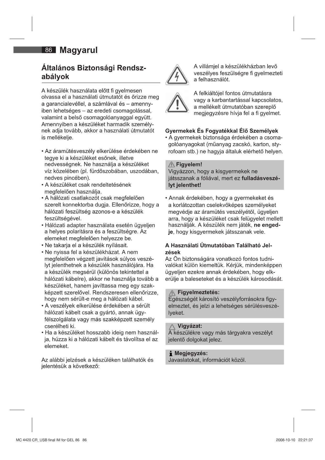 - Zárja be az elemtartót. Ha készüléket hosszabb ideig nem használja, vegye ki az elemeket a készülékből, nehogy megfolyjanak. MC 4420 CR_USB final IM for GEL 87 87MC 4420 CR_USB final IM for GEL 87 87 2008-10-10 22:21:392008-10-10 22:21:3988 Figyelem: Az elemek nem a háztartási hulladékba valók. A lemerült elemeket vigye a megfelelő gűjtőpontba vagy vissza a forgalmazóhoz. Figyelmeztetés: