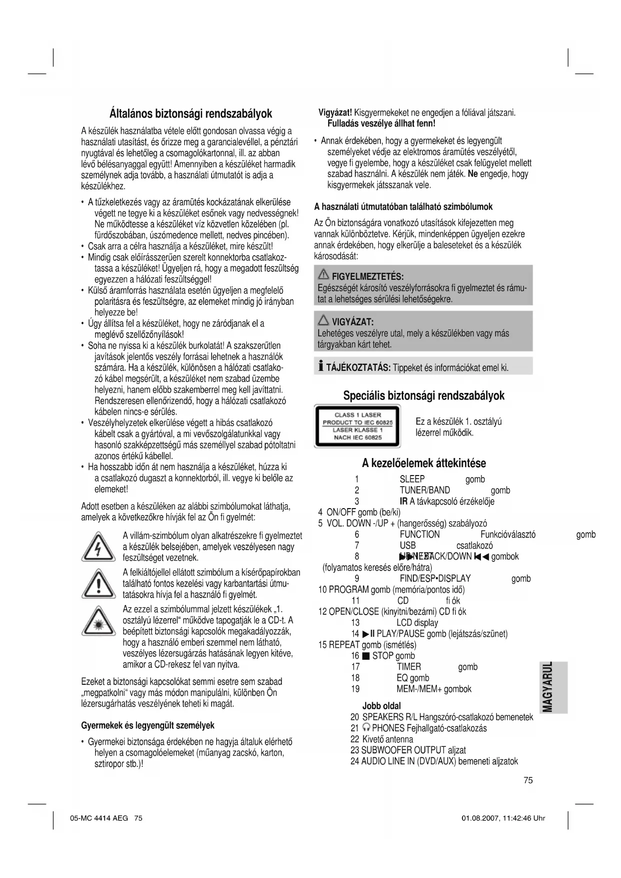 Az ezzel a szimbólummal jelzett keszülékek.1 osztályu lézerrel' muködve tapogatják le a CD-t. A beepített biztonságí kapcsolók megakadályozzák, hogy a használo embari szemmel nem látható, veszélyes lézersugárzs hatásanak legyen kiteve, amikor a CD-rekesz fel van nyitva.