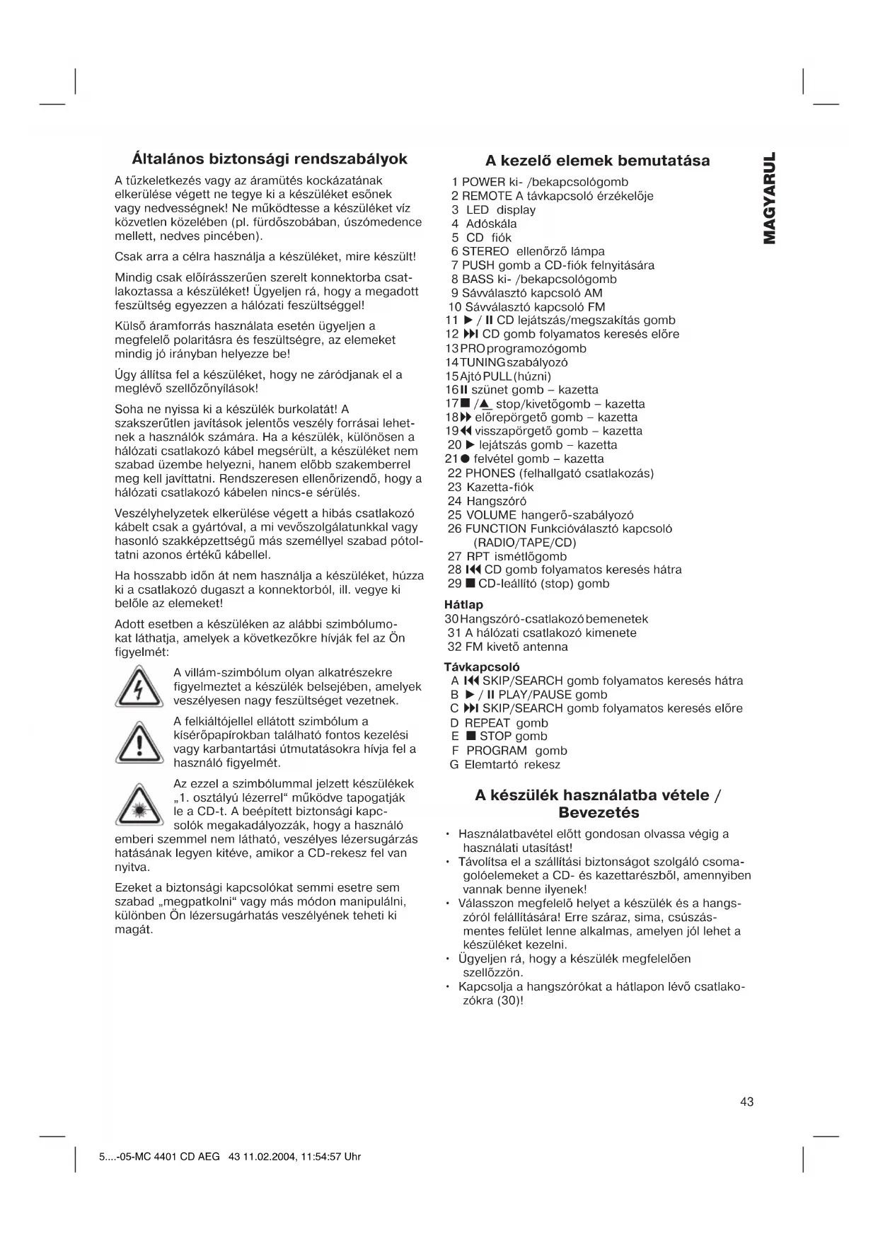 ESKY ovládání, náhradní zubní kartáčky, pilové listy atd.), tak i na čištění, údržbu nebo výměnu dílů podléhajících rychlému opotřebení se záruka nevztahuje a je proto nutno je uhradit! Záruka zaniká v případě, že dojde k zásahu neautorizo- vanou osobou. Po uplynutí záruky Po uplynutí záruční doby je možno za úplatu provést opravy v příslušném odborném obchodě nebo opravně. 5....-05-MC 4401 CD AEG 42 11.02.2004, 11:54:57 Uhr43 MAGYARUL Általános biztonsági rendszabályok A tűzkeletkezés vagy az áramütés kockázatának elkerülése végett ne tegye ki a készüléket esőnek vagy nedvességnek! Ne működtesse a készüléket víz közvetlen közelében (pl. fürdőszobában, úszómedence mellett, nedves pincében). Csak arra a célra használja a készüléket, mire készült! Mindig csak előírásszerűen szerelt konnektorba csat- lakoztassa a készüléket! Ügyeljen rá, hogy a megadott feszültség egyezzen a hálózati feszültséggel! Külső áramforrás használata esetén ügyeljen a megfelelő polaritásra és feszültségre, az elemeket mindig jó irányban helyezze be! Úgy állítsa fel a készüléket, hogy ne záródjanak el a meglévő szellőzőnyílások! Soha ne nyissa ki a készülék burkolatát! A szakszerűtlen javítások jelentős veszély forrásai lehet- nek a használók számára. Ha a készülék, különösen a hálózati csatlakozó kábel megsérült, a készüléket nem szabad üzembe helyezni, hanem előbb szakemberrel meg kell javíttatni. Rendszeresen ellenőrizendő, hogy a hálózati csatlakozó kábelen nincs-e sérülés. Veszélyhelyzetek elkerülése végett a hibás csatlakozó kábelt csak a gyártóval, a mi vevőszolgálatunkkal vagy hasonló szakképzettségű más személlyel szabad pótol- tatni azonos értékű kábellel. Ha hosszabb időn át nem használja a készüléket, húzza ki a csatlakozó dugaszt a konnektorból, ill. vegye ki belőle az elemeket! Adott esetben a készüléken az alábbi szimbólumo- kat láthatja, amelyek a következőkre hívják fel az Ön figyelmét: A villám-szimbólum olyan alkatrészekre figyelmeztet a készülék belsejében, amelyek veszélyesen nagy feszültséget vezetnek. A felkiáltójellel ellátott szimbólum a kísérőpapírokban található fontos kezelési vagy karbantartási útmutatásokra hívja fel a használó figyelmét. Az ezzel a szimbólummal jelzett készülékek „1. osztályú lézerrel“ működve tapogatják le a CD-t. A beépített biztonsági kapc- solók megakadályozzák, hogy a használó emberi szemmel nem látható, veszélyes lézersugárzás hatásának legyen kitéve, amikor a CD-rekesz fel van nyitva. Ezeket a biztonsági kapcsolókat semmi esetre sem szabad „megpatkolni“ vagy más módon manipulálni, különben Ön lézersugárhatás veszélyének teheti ki magát. A kezelő elemek bemutatása 1 POWER ki- /bekapcsológomb 2 REMOTE A távkapcsoló érzékelője 3 LED display 4 Adóskála 5 CD fiók 6 STEREO ellenőrző lámpa 7 PUSH gomb a CD-fiók felnyitására 8 BASS ki- /bekapcsológomb 9 Sávválasztó kapcsoló AM 10 Sávválasztó kapcsoló FM 11 / II CD lejátszás/megszakítás gomb 12 I CD gomb folyamatos keresés előre 13 PRO programozógomb 14 TUNING szabályozó 15 Ajtó PULL (húzni) 16 II szünet gomb – kazetta 17 / stop/kivetőgomb – kazetta 18 előrepörgető gomb – kazetta 19 visszapörgető gomb – kazetta 20 lejátszás gomb – kazetta 21 felvétel gomb – kazetta 22 PHONES (felhallgató csatlakozás) 23 Kazetta-fiók 24 Hangszóró 25 VOLUME hangerő-szabályozó 26 FUNCTION Funkcióválasztó kapcsoló (RADIO/TAPE/CD) 27 RPT ismétlőgomb 28 I CD gomb folyamatos keresés hátra 29 CD-leállító (stop) gomb Hátlap 30 Hangszóró-csatlakozó bemenetek 31 A hálózati csatlakozó kimenete 32 FM kivető antenna Távkapcsoló A I SKIP/SEARCH gomb folyamatos keresés hátra B / II PLAY/PAUSE gomb C I SKIP/SEARCH gomb folyamatos keresés előre D REPEAT gomb E STOP gomb F PROGRAM gomb G Elemtartó rekesz A készülék használatba vétele / Bevezetés