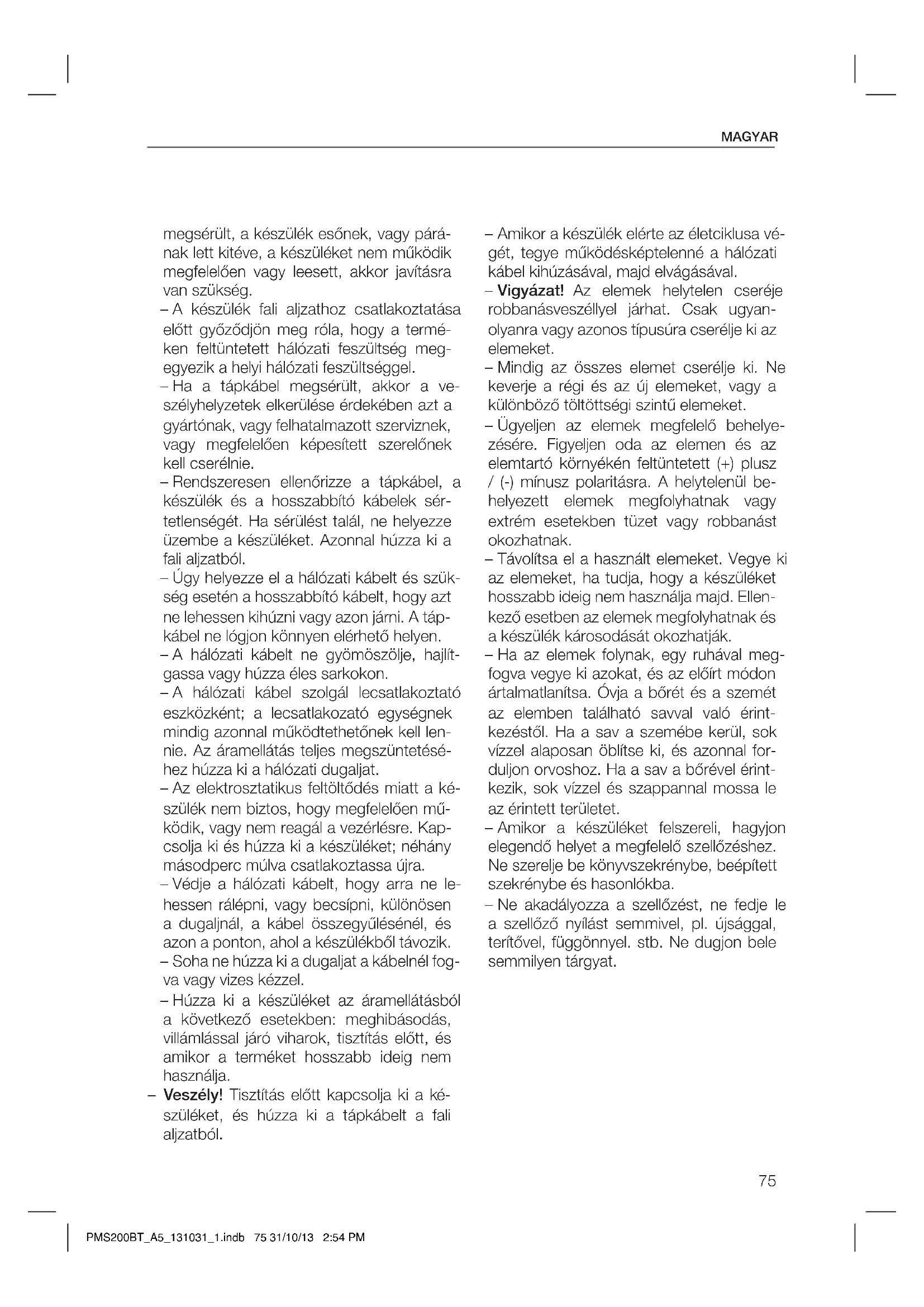 2 x 10W RMS Plat/classique/pop/rock/jazz plat/classique/pop/rock/jazz 250 à 280 mV à 32 Ohms (1K 0dB) environ 220 x 244 x 118 mm environ 138 x 200 x 226 mm environ 5,54 kg REMARQUE: Ce produit ne prend pas en charge les fichiers WMA protégés par DRM. Caractéristiques techniques PMS200BT_A5_131031_1.indb 73 31/10/13 2:54 PM75 MAGYAR megsérült, a készülék esőnek, vagy párá- nak lett kitéve, a készüléket nem működik megfelelően vagy leesett, akkor javításra van szükség. – A készülék fali aljzathoz csatlakoztatása előtt győződjön meg róla, hogy a termé- ken feltüntetett hálózati feszültség meg- egyezik a helyi hálózati feszültséggel. – Ha a tápkábel megsérült, akkor a ve- szélyhelyzetek elkerülése érdekében azt a gyártónak, vagy felhatalmazott szerviznek, vagy megfelelően képesített szerelőnek kell cserélnie. – Rendszeresen ellenőrizze a tápkábel, a készülék és a hosszabbító kábelek sér- tetlenségét. Ha sérülést talál, ne helyezze üzembe a készüléket. Azonnal húzza ki a fali aljzatból. – Úgy helyezze el a hálózati kábelt és szük- ség esetén a hosszabbító kábelt, hogy azt ne lehessen kihúzni vagy azon járni. A táp- kábel ne lógjon könnyen elérhető helyen. – A hálózati kábelt ne gyömöszölje, hajlít- gassa vagy húzza éles sarkokon. – A hálózati kábel szolgál lecsatlakoztató eszközként; a lecsatlakozató egységnek mindig azonnal működtethetőnek kell len- nie. Az áramellátás teljes megszüntetésé- hez húzza ki a hálózati dugaljat. – Az elektrosztatikus feltöltődés miatt a ké- szülék nem biztos, hogy megfelelően mű- ködik, vagy nem reagál a vezérlésre. Kap- csolja ki és húzza ki a készüléket; néhány másodperc múlva csatlakoztassa újra. – Védje a hálózati kábelt, hogy arra ne le- hessen rálépni, vagy becsípni, különösen a dugaljnál, a kábel összegyűlésénél, és azon a ponton, ahol a készülékből távozik. – Soha ne húzza ki a dugaljat a kábelnél fog- va vagy vizes kézzel. – Húzza ki a készüléket az áramellátásból a következő esetekben: meghibásodás, villámlással járó viharok, tisztítás előtt, és amikor a terméket hosszabb ideig nem használja. – Veszély! Tisztítás előtt kapcsolja ki a ké- szüléket, és húzza ki a tápkábelt a fali aljzatból. – Amikor a készülék elérte az életciklusa vé- gét, tegye működésképtelenné a hálózati kábel kihúzásával, majd elvágásával. – Vigyázat! Az elemek helytelen cseréje robbanásveszéllyel járhat. Csak ugyan- olyanra vagy azonos típusúra cserélje ki az elemeket. – Mindig az összes elemet cserélje ki. Ne keverje a régi és az új elemeket, vagy a különböző töltöttségi szintű elemeket. – Ügyeljen az elemek megfelelő behelye- zésére. Figyeljen oda az elemen és az elemtartó környékén feltüntetett (+) plusz / (-) mínusz polaritásra. A helytelenül be- helyezett elemek megfolyhatnak vagy extrém esetekben tüzet vagy robbanást okozhatnak. – Távolítsa el a használt elemeket. Vegye ki az elemeket, ha tudja, hogy a készüléket hosszabb ideig nem használja majd. Ellen- kező esetben az elemek megfolyhatnak és a készülék károsodását okozhatják. – Ha az elemek folynak, egy ruhával meg- fogva vegye ki azokat, és az előírt módon ártalmatlanítsa. Óvja a bőrét és a szemét az elemben található savval való érint- kezéstől. Ha a sav a szemébe kerül, sok vízzel alaposan öblítse ki, és azonnal for- duljon orvoshoz. Ha a sav a bőrével érint- kezik, sok vízzel és szappannal mossa le az érintett területet. – Amikor a készüléket felszereli, hagyjon elegendő helyet a megfelelő szellőzéshez. Ne szerelje be könyvszekrénybe, beépített szekrénybe és hasonlókba. – Ne akadályozza a szellőzést, ne fedje le a szellőző nyílást semmivel, pl. újsággal, terítővel, függönnyel. stb. Ne dugjon bele semmilyen tárgyat. PMS200BT_A5_131031_1.indb 75 31/10/13 2:54 PMMAGYAR