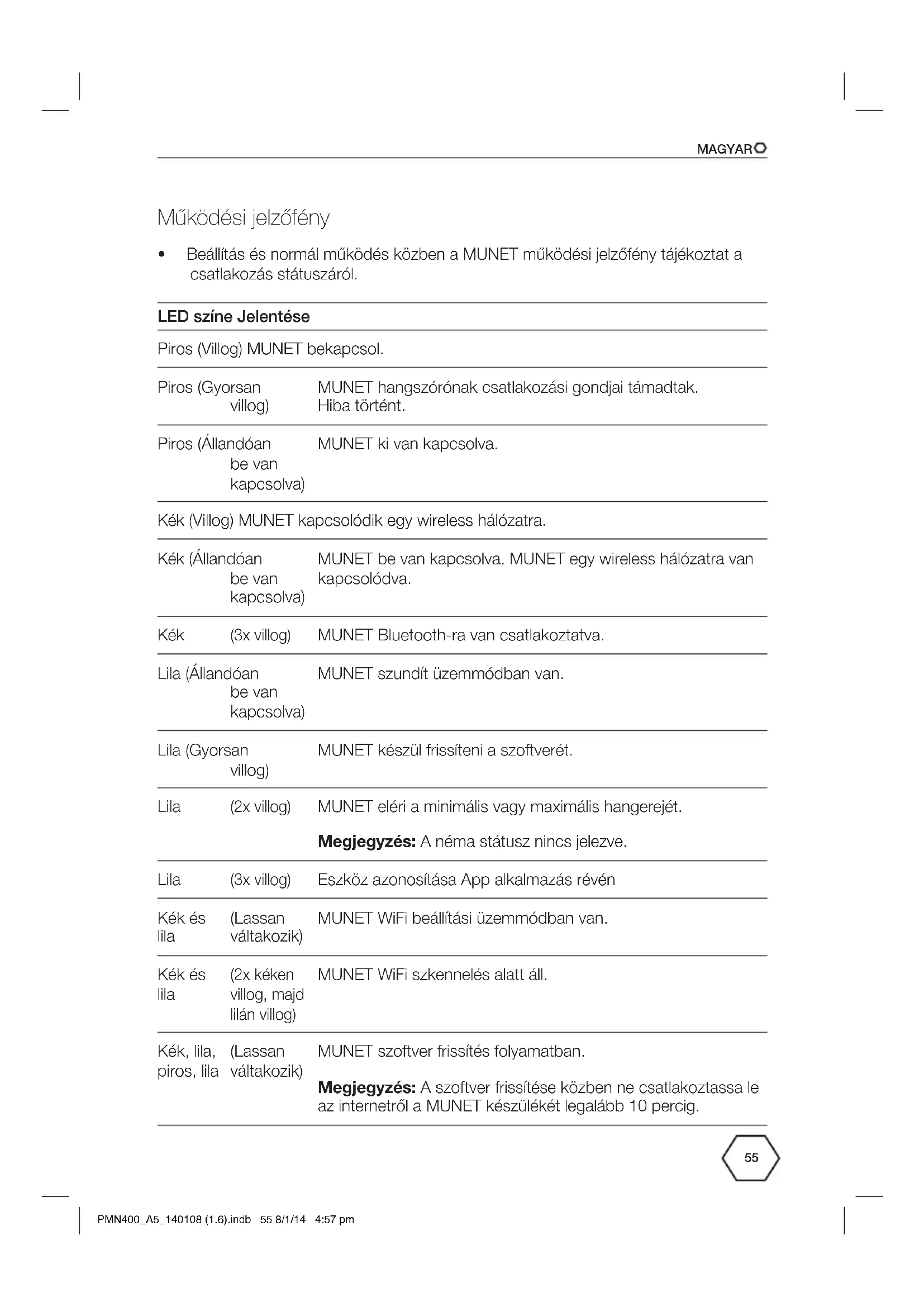 - Beállítás és normál működés közben a MUNET működési jelzőfény tájékoztat a csatlakozás státuszáról. LED színe Jelentése Piros (Villog) MUNET bekapcsol. Piros (Gyorsan villog) MUNET hangszórónak csatlakozási gondjai támadtak. Hiba történt. Piros (Állandóan be van kapcsolva) MUNET ki van kapcsolva. Kék (Villog) MUNET kapcsolódik egy wireless hálózatra. Kék (Állandóan be van kapcsolva) MUNET be van kapcsolva. MUNET egy wireless hálózatra van kapcsolódva. Kék (3x villog) MUNET Bluetooth-ra van csatlakoztatva. Lila (Állandóan be van kapcsolva) MUNET szundít üzemmódban van. Lila (Gyorsan villog) MUNET készül frissíteni a szoftverét. Lila (2x villog) MUNET eléri a minimális vagy maximális hangerejét. Megjegyzés: A néma státusz nincs jelezve. Lila (3x villog) Eszköz azonosítása App alkalmazás révén Kék és lila (Lassan váltakozik) MUNET WiFi beállítási üzemmódban van. Kék és lila (2x kéken villog, majd lilán villog) MUNET WiFi szkennelés alatt áll. Kék, lila, piros, lila (Lassan váltakozik) MUNET szoftver frissítés folyamatban. Megjegyzés: A szoftver frissítése közben ne csatlakoztassa le az internetről a MUNET készülékét legalább 10 percig. PMN400_A5_140108 (1.6).indb 55 8/1/14 4:57 pmMAGYAR