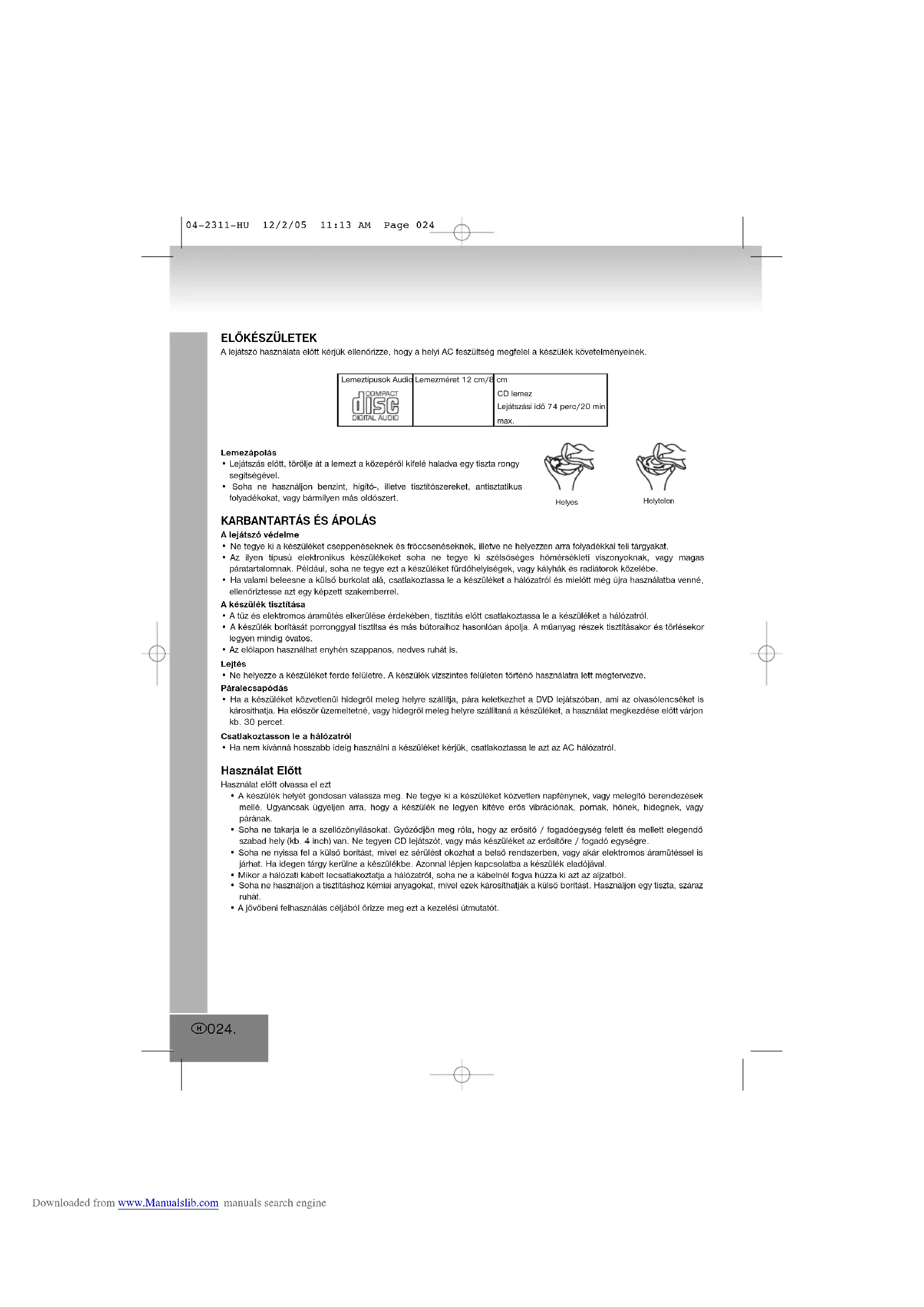 04-2311-HU 12/2/05 11:13 AM Page 023 Downloaded from www.Manualslib.com manuals search engineELŐKÉSZÜLETEK A lejátszó használata előtt kérjük ellenőrizze, hogy a helyi AC feszültség megfelel a készülék követelményeinek.Lemezápolás• Lejátszás előtt, törölje át a lemezt a közepéről kifelé haladva egy tiszta rongysegítségével.• Soha ne használjon benzint, hígító-, illetve tisztítószereket, antisztatikusfolyadékokat, vagy bármilyen más oldószert.
