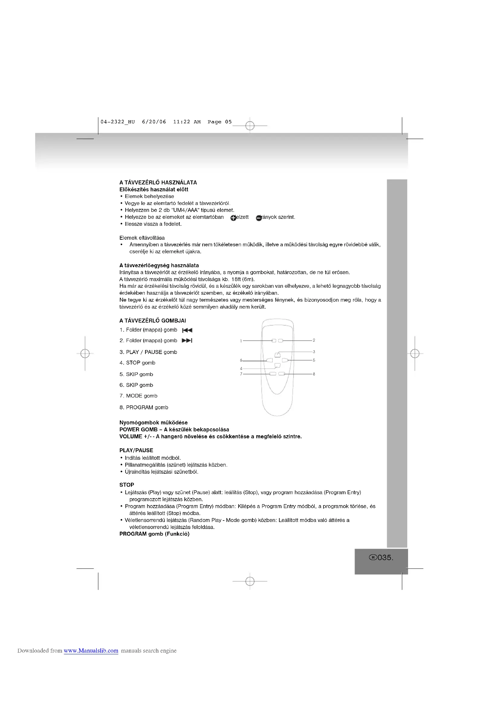 04-2322_HU 6/20/06 11:22 AM Page 04 Downloaded from www.Manualslib.com manuals search engineA TÁVVEZÉRLŐ HASZNÁLATAElőkészítés használat előtt• Elemek behelyezése • Vegye le az elemtartó fedelét a távvezérlőről.• Helyezzen be 2 db “UM4/AAA“ típusú elemet.• Helyezze be az elemeket az elemtartóban jelzett irányok szerint.• Illessze vissza a fedelet.Elemek eltávolítása