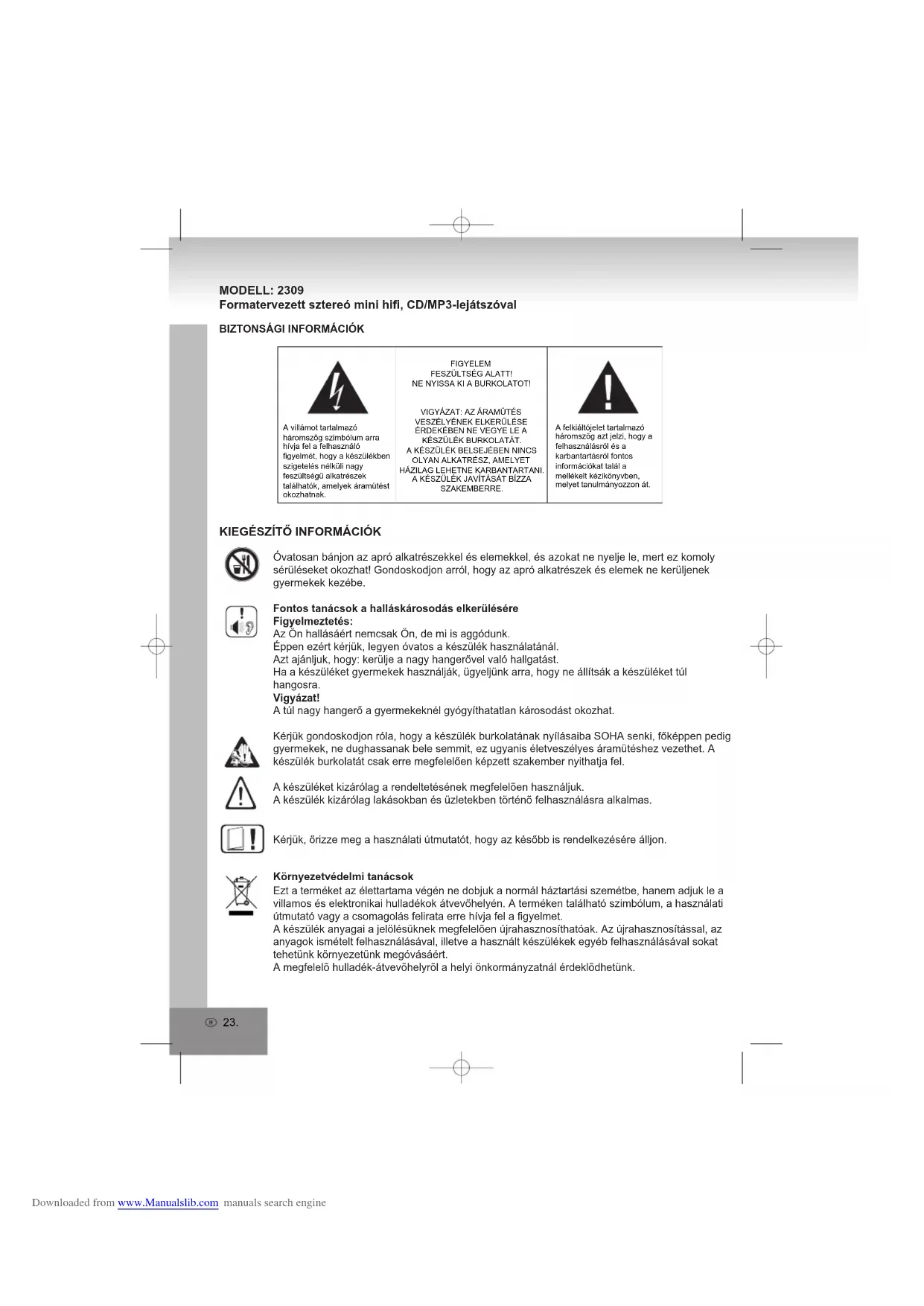 PROGRAMMATIONIl est possible de programmer jusqu’à 20 chansons pour une lecture aléatoire.Veillez à appuyer sur le bouton “STOP” avant utilisation.1. Appuyez sur le bouton “PROGRAM” de la télécommande, l’écran affiche “P01” et clignote.2. Sélect la chanson désirée en appuyant sur le bouton “SKIP +” ou sur le bouton “SKIP -”. (Vous pouvez sélectionner l’album désiré en appuyant sur le bouton “ALBUM”.)3. Appuyez à nouveau sur le bouton “PROGRAM” de la télécommande pour confirmer la chanson désirée dans la programmation de la mémoire.4. Répétez les étapes 2 et 3 pour entrer des chansons supplémentaires dans la programmation de la mémoire.5. Lorsque toutes chansons désirées ont été programmées, appuyez sur le bouton “PLAY / PAUSE / USB” pour lire le disque dans l’ordre que vous avez programmé.6. Appuyez sur le bouton “STOP” deux fois pour terminer la lecture. MODE Appuyez sur le bouton “MODE” avant ou après la lecture du disque CD / MP3 / WMA. A chaque fois que vous appuyez, le mode fonction apparait comme suit:1 - REPEAT 12 - REPEAT ALBUM (*SEULMENT POUR LES MP3 / WMA )3 - REPEAT ALL4 - RANDOM5 - NORMAL PLAYBACKREPEAT 1 REP REP ALBUM REP ALL REPEATALBUMREPEAT ALL NORMALPLAYBACK RAND RANDOM SPECIFICATIONS CARACTERISTIQUESAlimentation : AC 230V ~ 50HzFréquences : AM 525 - 1615kHz FM 87.5 - 108MHz(Les caractéristiques peuvent être modifiées sans préavis.) Downloaded from www.Manualslib.com manuals search engine23. MODELL: 2309 Formatervezett sztereó mini hifi, CD/MP3-lejátszóval BIZTONSÁGI INFORMÁCIÓKFIGYELEMFESZÜLTSÉG ALATT!NE NYISSA KI A BURKOLATOT!VIGYÁZAT: AZ ÁRAMÜTÉS VESZÉLYÉNEK ELKERÜLÉSE ÉRDEKÉBEN NE VEGYE LE A KÉSZÜLÉK BURKOLATÁT.A KÉSZÜLÉK BELSEJÉBEN NINCS OLYAN ALKATRÉSZ, AMELYET HÁZILAG LEHETNE KARBANTARTANI.A KÉSZÜLÉK JAVÍTÁSÁT BÍZZA SZAKEMBERRE.A felkiáltójelet tartalmazó háromszög azt jelzi, hogy a felhasználásról és a karbantartásról fontos információkat talál a mellékelt kézikönyvben, melyet tanulmányozzon át.A villámot tartalmazó háromszög szimbólum arra hívja fel a felhasználó figyelmét, hogy a készülékben szigetelés nélküli nagy feszültségű alkatrészek találhatók, amelyek áramütést okozhatnak.Óvatosan bánjon az apró alkatrészekkel és elemekkel, és azokat ne nyelje le, mert ez komoly sérüléseket okozhat! Gondoskodjon arról, hogy az apró alkatrészek és elemek ne kerüljenek gyermekek kezébe.Fontos tanácsok a halláskárosodás elkerüléséreFigyelmeztetés:Az Ön hallásáért nemcsak Ön, de mi is aggódunk.Éppen ezért kérjük, legyen óvatos a készülék használatánál.Azt ajánljuk, hogy: kerülje a nagy hangerővel való hallgatást.Ha a készüléket gyermekek használják, ügyeljünk arra, hogy ne állítsák a készüléket túl hangosra.Vigyázat!A túl nagy hangerő a gyermekeknél gyógyíthatatlan károsodást okozhat.Kérjük gondoskodjon róla, hogy a készülék burkolatának nyílásaiba SOHA senki, főképpen pedig gyermekek, ne dughassanak bele semmit, ez ugyanis életveszélyes áramütéshez vezethet. A készülék burkolatát csak erre megfelelően képzett szakember nyithatja fel.A készüléket kizárólag a rendeltetésének megfelelõen használjuk.A készülék kizárólag lakásokban és üzletekben történõ felhasználásra alkalmas.Kérjük, őrizze meg a használati útmutatót, hogy az később is rendelkezésére álljon.Környezetvédelmi tanácsokEzt a terméket az élettartama végén ne dobjuk a normál háztartási szemétbe, hanem adjuk le a villamos és elektronikai hulladékok átvevőhelyén. A terméken található szimbólum, a használati útmutató vagy a csomagolás felirata erre hívja fel a figyelmet.A készülék anyagai a jelölésüknek megfelelõen újrahasznosíthatóak. Az újrahasznosítással, az anyagok ismételt felhasználásával, illetve a használt készülékek egyéb felhasználásával sokat tehetünk környezetünk megóvásáért.A megfelelõ hulladék-átvevõhelyrõl a helyi önkormányzatnál érdeklõdhetünk.