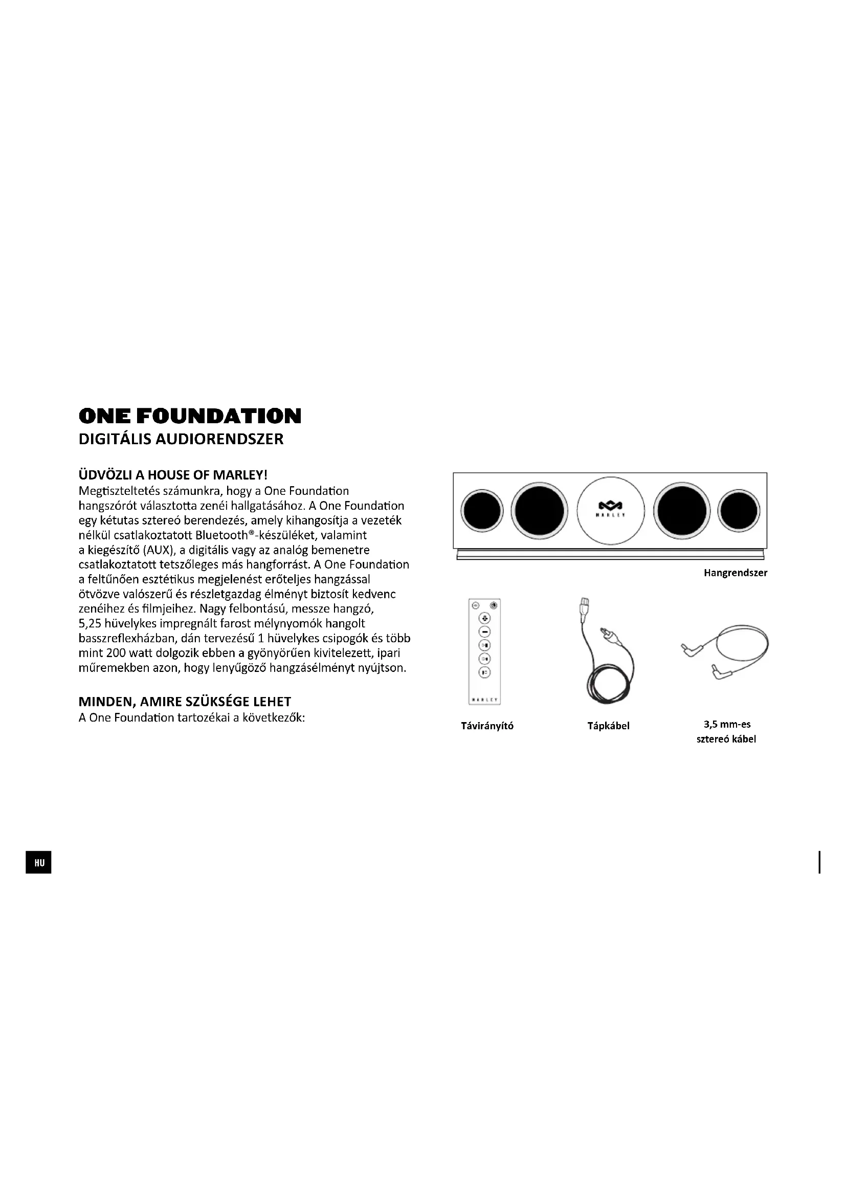 ÜDVÖZLI A HOUSE OF MARLEY! Megszteltetés számunkra, hogy a One Foundaon hangszórót választoa zenéi hallgatásához. A One Foundaon egy kétutas sztereó berendezés, amely kihangosítja a vezeték nélkül csatlakoztato Bluetooth®-készüléket, valamint a kiegészítő (AUX), a digitális vagy az analóg bemenetre csatlakoztato tetszőleges más hangforrást. A One Foundaon a feltűnően esztékus megjelenést erőteljes hangzással ötvözve valószerű és részletgazdag élményt biztosít kedvenc zenéihez és lmjeihez. Nagy felbontású, messze hangzó, 5,25 hüvelykes impregnált farost mélynyomók hangolt basszreexházban, dán tervezésű 1 hüvelykes csipogók és több mint 200 wa dolgozik ebben a gyönyörűen kiviteleze, ipari műremekben azon, hogy lenyűgöző hangzásélményt nyújtson.