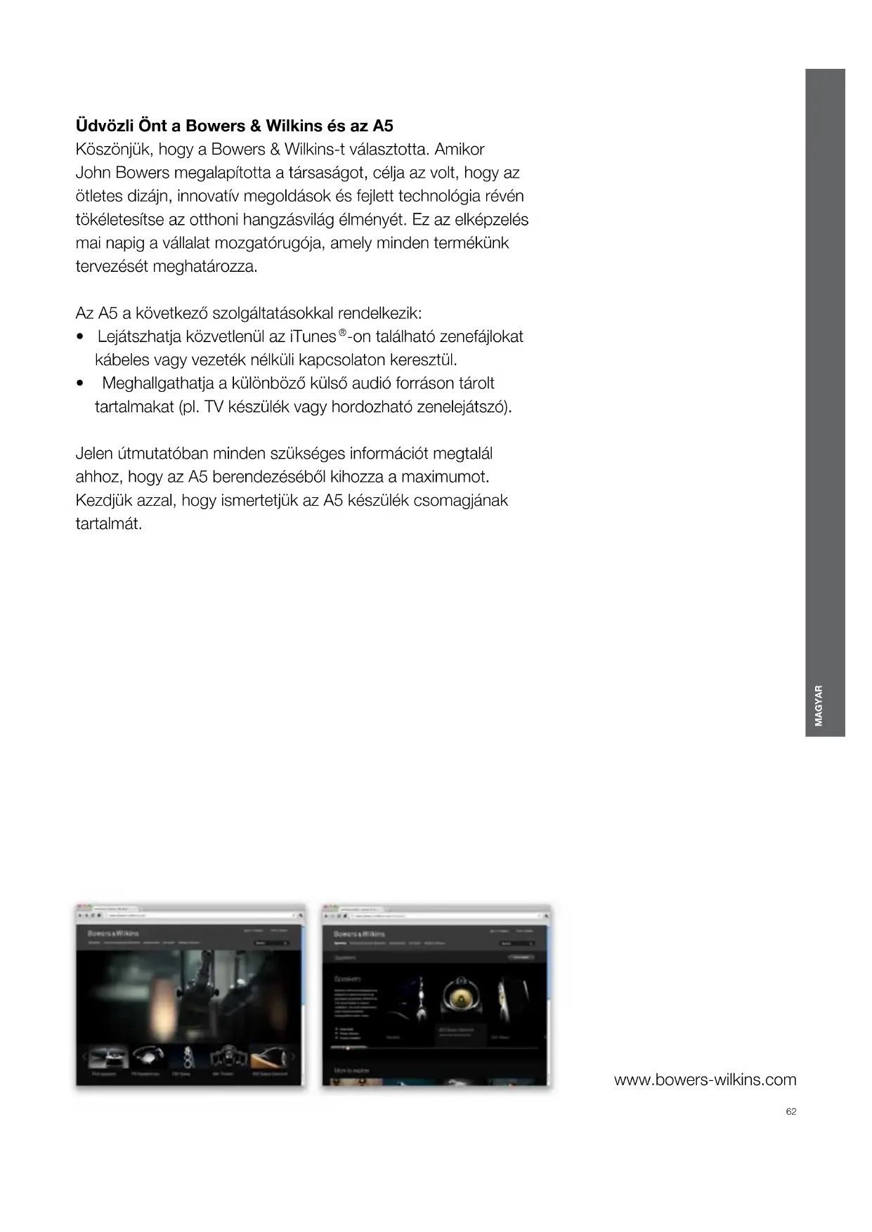 MAGYAR www.bowers-wilkins.com Üdvözli Önt a Bowers & Wilkins és az A5 Köszönjük, hogy a Bowers & Wilkins-t választotta. Amikor John Bowers megalapította a társaságot, célja az volt, hogy az ötletes dizájn, innovatív megoldások és fejlett technológia révén tökéletesítse az otthoni hangzásvilág élményét. Ez az elképzelés mai napig a vállalat mozgatórugója, amely minden termékünk tervezését meghatározza. Az A5 a következő szolgáltatásokkal rendelkezik: