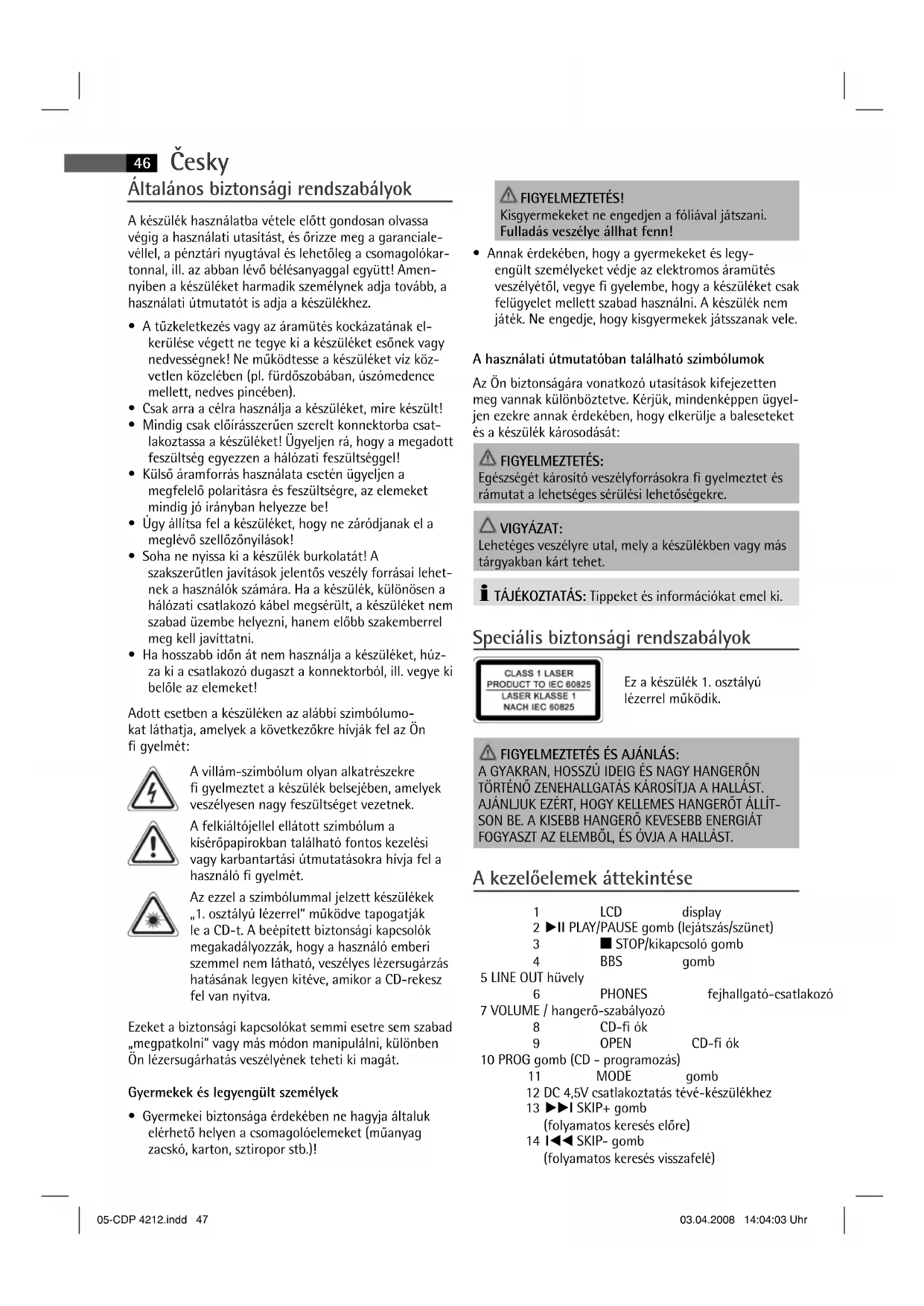 - Annak érdekében, hogy a gyermekeket és legy- engült személyeket védje az elektromos áramütés veszélyétől, vegye gyelembe, hogy a készüléket csak felügyelet mellett szabad használni. A készülék nem játék. Ne engedje, hogy kisgyermekek játsszanak vele. A használati útmutatóban található szimbólumok Az Ön biztonságára vonatkozó utasítások kifejezetten meg vannak különböztetve. Kérjük, mindenképpen ügyel- jen ezekre annak érdekében, hogy elkerülje a baleseteket és a készülék károsodását: FIGYELMEZTETÉS: Egészségét károsító veszélyforrásokra gyelmeztet és rámutat a lehetséges sérülési lehetőségekre. VIGYÁZAT: Lehetéges veszélyre utal, mely a készülékben vagy más tárgyakban kárt tehet. 쫵 TÁJÉKOZTATÁS: Tippeket és információkat emel ki. Speciális biztonsági rendszabályok Ez a készülék 1. osztályú lézerrel működik. FIGYELMEZTETÉS ÉS AJÁNLÁS: A GYAKRAN, HOSSZÚ IDEIG ÉS NAGY HANGERŐN TÖRTÉNŐ ZENEHALLGATÁS KÁROSÍTJA A HALLÁST. AJÁNLJUK EZÉRT, HOGY KELLEMES HANGERŐT ÁLLÍT- SON BE. A KISEBB HANGERŐ KEVESEBB ENERGIÁT FOGYASZT AZ ELEMBŐL, ÉS ÓVJA A HALLÁST. A kezelőelemek áttekintése 1 LCD display 2 왘II PLAY/PAUSE gomb (lejátszás/szünet) 3 왎 STOP/kikapcsoló gomb 4 BBS gomb 5 LINE OUT hüvely 6 PHONES fejhallgató-csatlakozó 7 VOLUME / hangerő-szabályozó 8 CD- ók 9 OPEN CD- ók 10 PROG gomb (CD - programozás) 11 MODE gomb 12 DC 4,5V csatlakoztatás tévé-készülékhez 13 왘왘I SKIP+ gomb (folyamatos keresés előre) 14 I왗왗 SKIP- gomb (folyamatos keresés visszafelé) 46Magyarul 05-CDP 4212.indd 05-CDP 4212.indd 47 03.04.2008 14:04:03 Uhr03.04.2008 14:04:03 Uhr 15 ESP/DIR gomb 16 HOLD billentyűzár 17 Elemtartó rekesz Rendeltetésszerű használat A készülék az alábbi felhasználási célokra készült:
