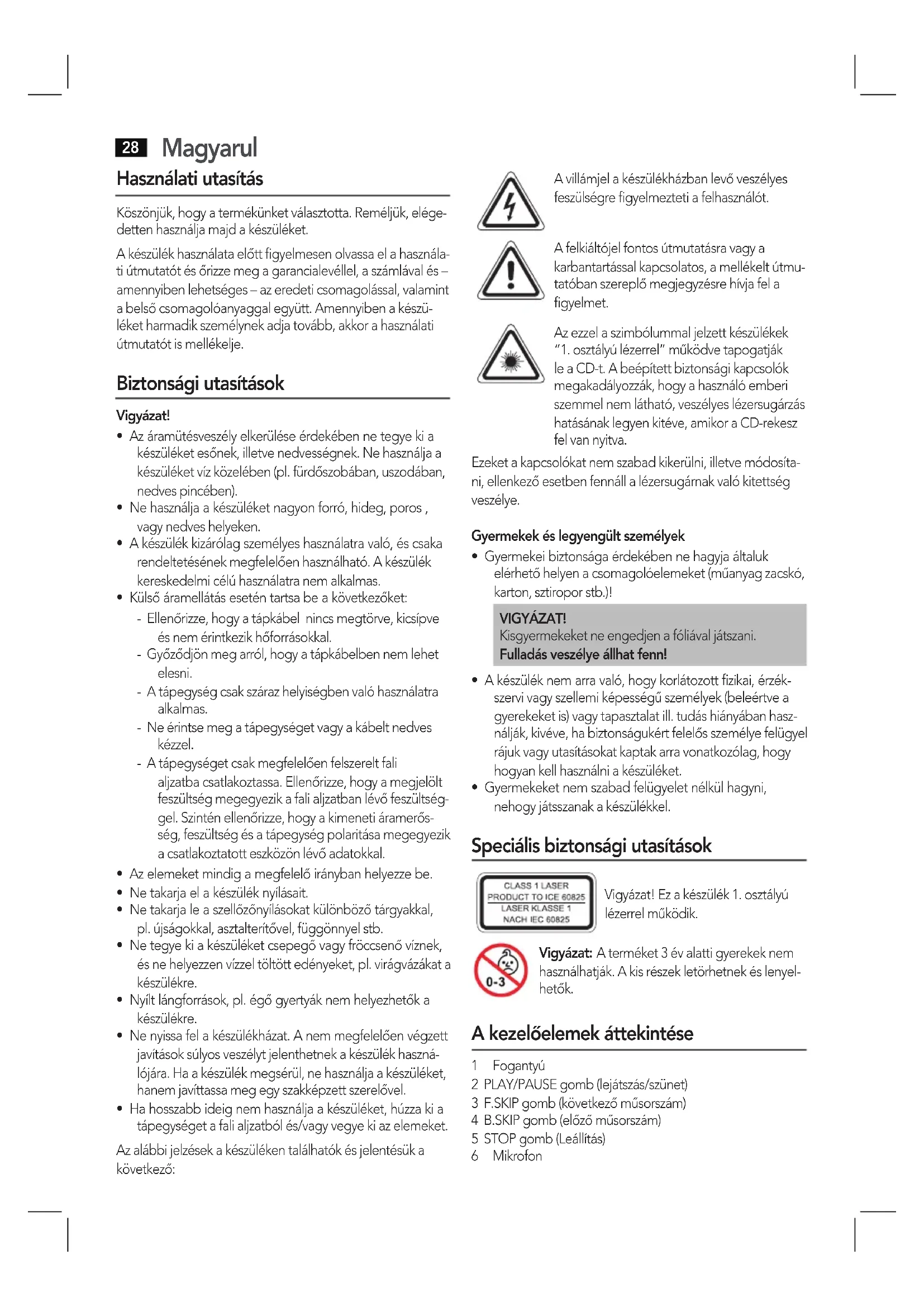 - Gyermekeket nem szabad felügyelet nélkül hagyni, nehogy játsszanak a készülékkel. Speciális biztonsági utasítások Vigyázat! Ez a készülék 1. osztályú lézerrel működik. Vigyázat: A terméket 3 év alatti gyerekek nem használhatják. A kis részek letörhetnek és lenyel- hetők. A kezelőelemek áttekintése 1 Fogantyú 2 PLAY/PAUSE gomb (lejátszás/szünet) 3 F.SKIP gomb (következő műsorszám) 4 B.SKIP gomb (előző műsorszám) 5 STOP gomb (Leállítás) 6 MikrofonMagyarul