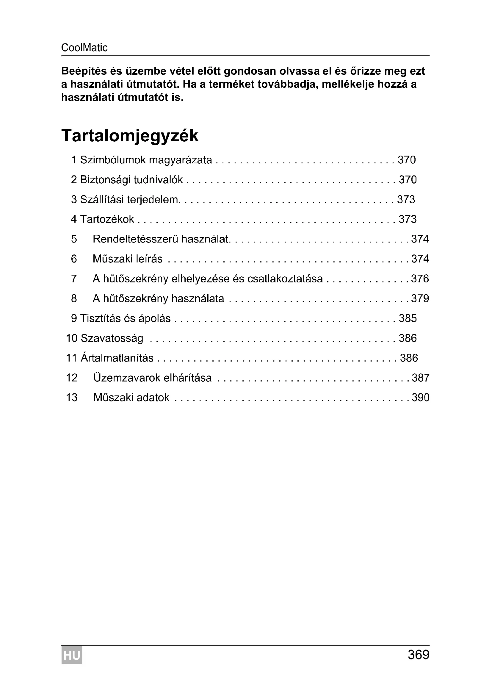 - 13 Műszaki adatok HU Szimbólumok magyarázata CoolMatic p. 390