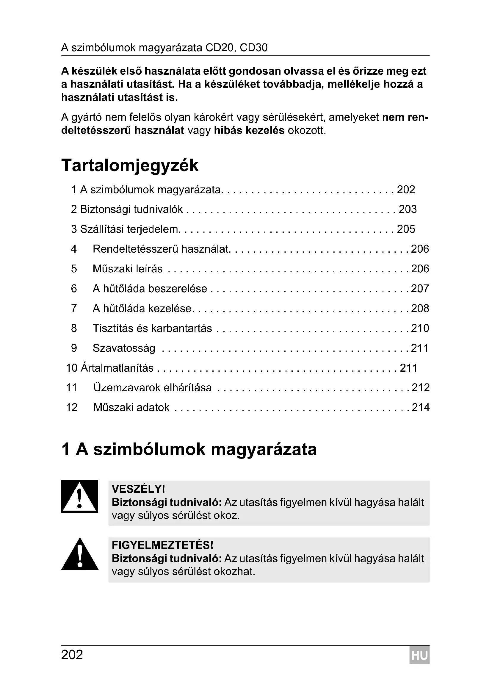 VESZÉLY! Biztonsági tudnivaló: Az utasítás figyelmen kívül hagyása halált vagy súlyos sérülést okoz. FIGYELMEZTETÉS! Biztonsági tudnivaló: Az utasítás figyelmen kívül hagyása halált vagy súlyos sérülést okozhat.HU CD20, CD30 Biztonsági tudnivalók