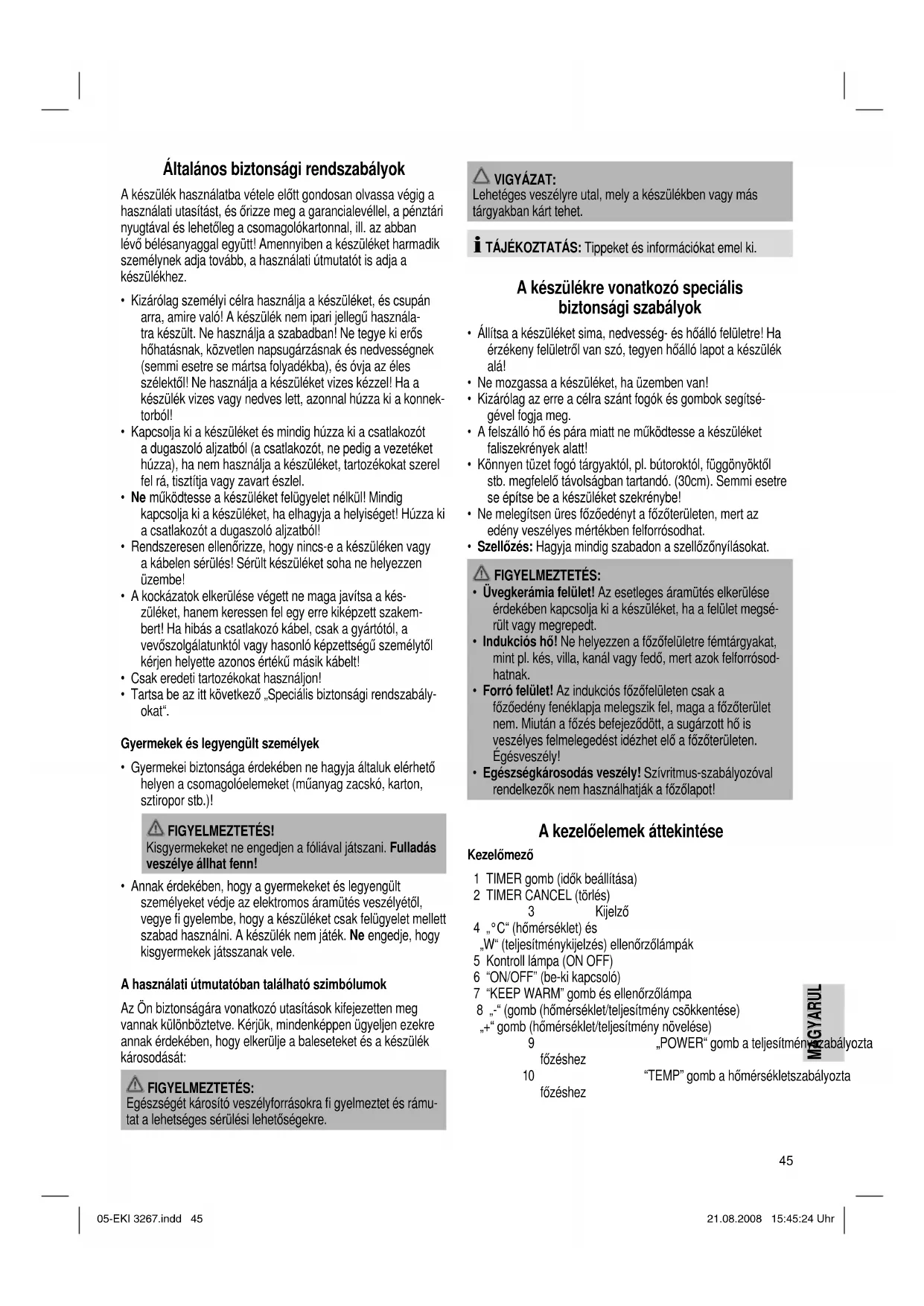 - Egészségkárosodás veszély! Szívritmus-szabályozóval rendelkezők nem használhatják a főzőlapot! A kezelőelemek áttekintése Kezelőmező 1 TIMER gomb (idők beállítása) 2 TIMER CANCEL (törlés) 3 Kijelző 4 „°C“ (hőmérséklet) és „W“ (teljesítménykijelzés) ellenőrzőlámpák 5 Kontroll lámpa (ON OFF) 6 “ON/OFF” (be-ki kapcsoló) 7 “KEEP WARM” gomb és ellenőrzőlámpa 8 „-“ (gomb (hőmérséklet/teljesítmény csökkentése) „+“ gomb (hőmérséklet/teljesítmény növelése) 9 „POWER“ gomb a teljesítményszabályozta főzéshez 10 “TEMP” gomb a hőmérsékletszabályozta főzéshez 05-EKI 3267.indd 4505-EKI 3267.indd 45 21.08.2008 15:45:24 Uhr21.08.2008 15:45:24 Uhr46 MAGYARUL MAGYARUL Általános tudnivalók Az indukciós főzésről Az indukciós főzésnél mágneses erők hozzák létre a főzéshez szükséges hőt, de csak akkor, ha egy mágnesezhető fenéklap- pal rendelkező edényt vagy serpenyőt helyeznek a bekapcsolt főzőterületre. Ilyenkor a főzőedénynek csak a fenéklapja melegszik fel, maga a főzőterület nem. Az üvegkerámia alatt található az indukciós tekercs. Ha a tekercs áram alá kerül, mágneses tér keletkezik, amely az edény aljában örvénylést idéz elő. Ez az örvény a fenéklap felmelegedéséhez vezet. Ez- zel energiát takarítunk meg, mivel a hő kizárólag ott keletkezik, ahol szükség van rá. Milyen főzőedényt használhatok? Az indukciós főzőlapokhoz mágnesezhető anyagból készült ill. mágnesezhető fenéklappal rendelkező edény használható. Az ilyen főzőedényen fel szokták tüntetni, hogy indukciós tűzhelyen használható. Tulajdonképpen minden vastartalmú főzőedény használható, azt pedig hogy az edény ténylegesen mágnesezhető is, egyszerű próbával lehet meghatározni: Helyezze az edényt a főzőterületre. Ha a főzőfunkció kiválasztá- sa és a készülék bekapcsolása után megszólal egy hangjelzés, az edény nem használható indukciós főzésre. TÁJÉKOZTATÁS: A készülék biztonsági okokból néhány másodperc után kés- zenléti állapotba kapcsol. A következő anyagok nem használhatók főzőedényként: Agyag, üveg vagy alumínium. A következő edények nem használhatók: Gömbölyű fenekű edények. Olyan edények, me- lyek fenékátmérője 12 cm-nél kisebb. Lábakon álló edények. Elektromos csatlakozás Csatlakozási érték A főzőlap együttesen felvett teljesítménye elérheti az 2000 W-ot. Ennél a teljesítményértéknél ajánlatos külön kábelt használni, amely 16 A-es háztartási megszakítóval van biztosítva. FIGYELMEZTETÉS, TÚLTERHELÉS! A készülék nagy teljesítményfelvétele miatt ne használjon hosszabbító kábelt vagy csatlakozó elosztót! Csatlakoztatás