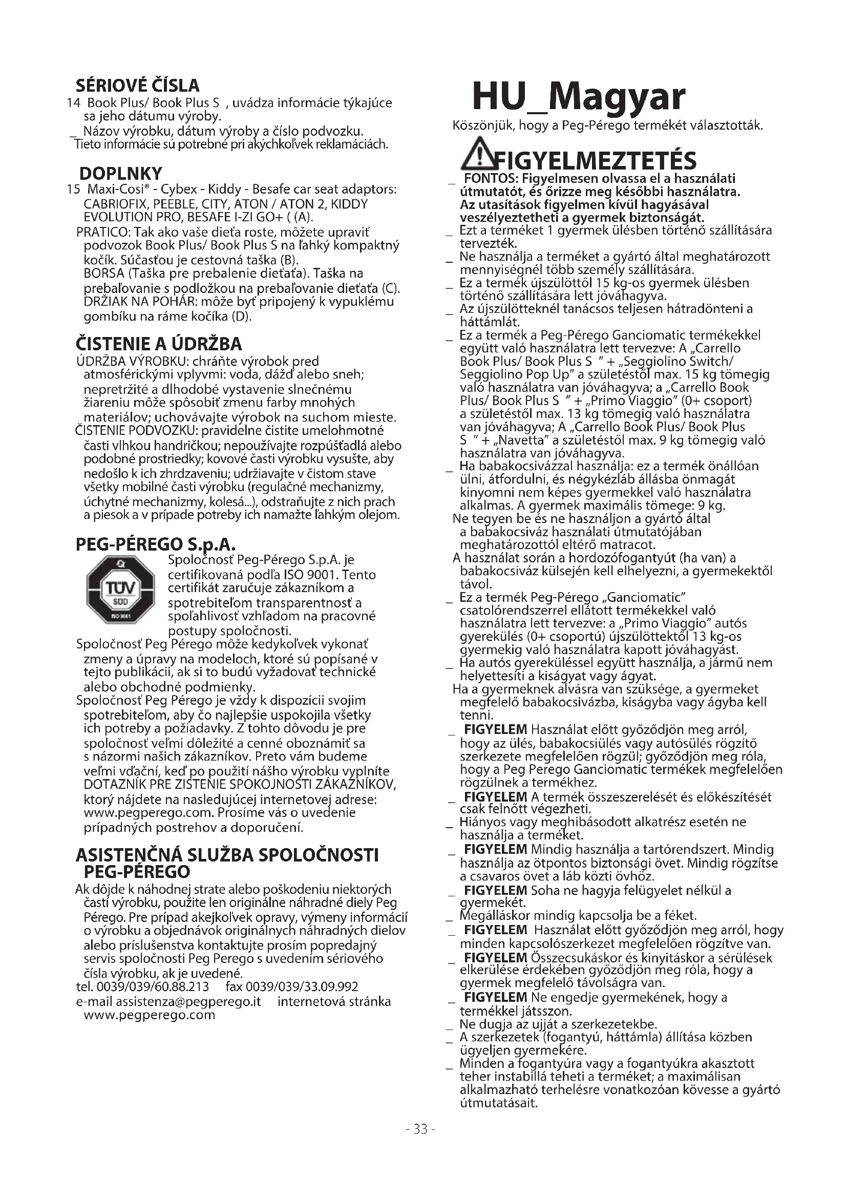 PEG-PÉREGO Ak dôjde k náhodnej strate alebo poškodeniu niektorých častí výrobku, použite len originálne náhradné diely Peg Pérego. Pre prípad akejkoľvek opravy, výmeny informácií o výrobku a objednávok originálnych náhradných dielov alebo príslušenstva kontaktujte prosím popredajný servis spoločnosti Peg Perego s uvedením sériového čísla výrobku, ak je uvedené. tel. 0039/039/60.88.213 fax 0039/039/33.09.992 e-mail assistenza@pegperego.it internetová stránka www.pegperego.com HU_Magyar Köszönjük, hogy a Peg-Pérego termékét választották. FIGYELMEZTETÉS _ FONTOS: Figyelmesen olvassa el a használati útmutatót, és őrizze meg későbbi használatra. Az utasítások figyelmen kívül hagyásával veszélyeztetheti a gyermek biztonságát. _ Ezt a terméket 1 gyermek ülésben történő szállítására tervezték. _ Ne használja a terméket a gyártó által meghatározott mennyiségnél több személy szállítására. _ Ez a termék újszülöttől 15 kg-os gyermek ülésben történő szállítására lett jóváhagyva. _ Az újszülötteknél tanácsos teljesen hátradönteni a háttámlát. _ Ez a termék a Peg-Pérego Ganciomatic termékekkel együtt való használatra lett tervezve: A „Carrello Book Plus/ Book Plus S ” + „Seggiolino Switch/ Seggiolino Pop Up” a születéstől max. 15 kg tömegig való használatra van jóváhagyva; a „Carrello Book Plus/ Book Plus S ” + „Primo Viaggio” (0+ csoport) a születéstől max. 13 kg tömegig való használatra van jóváhagyva; A „Carrello Book Plus/ Book Plus S ” + „Navetta” a születéstől max. 9 kg tömegig való használatra van jóváhagyva. _ Ha babakocsivázzal használja: ez a termék önállóan ülni, átfordulni, és négykézláb állásba önmagát kinyomni nem képes gyermekkel való használatra alkalmas. A gyermek maximális tömege: 9 kg. Ne tegyen be és ne használjon a gyártó által a babakocsiváz használati útmutatójában meghatározottól eltérő matracot. A használat során a hordozófogantyút (ha van) a babakocsiváz külsején kell elhelyezni, a gyermekektől távol. _ Ez a termék Peg-Pérego „Ganciomatic” csatolórendszerrel ellátott termékekkel való használatra lett tervezve: a „Primo Viaggio” autós gyerekülés (0+ csoportú) újszülöttektől 13 kg-os gyermekig való használatra kapott jóváhagyást. _ Ha autós gyereküléssel együtt használja, a jármű nem helyettesíti a kiságyat vagy ágyat. Ha a gyermeknek alvásra van szüksége, a gyermeket megfelelő babakocsivázba, kiságyba vagy ágyba kell tenni. _ FIGYELEM Használat előtt győződjön meg arról, hogy az ülés, babakocsiülés vagy autósülés rögzítő szerkezete megfelelően rögzül; győződjön meg róla, hogy a Peg Perego Ganciomatic termékek megfelelően rögzülnek a termékhez. _ FIGYELEM A termék összeszerelését és előkészítését csak felnőtt végezheti. _ Hiányos vagy meghibásodott alkatrész esetén ne használja a terméket. _ FIGYELEM Mindig használja a tartórendszert. Mindig használja az ötpontos biztonsági övet. Mindig rögzítse a csavaros övet a láb közti övhöz. _ FIGYELEM Soha ne hagyja felügyelet nélkül a gyermekét. _ Megálláskor mindig kapcsolja be a féket. _ FIGYELEM Használat előtt győződjön meg arról, hogy minden kapcsolószerkezet megfelelően rögzítve van. _ FIGYELEM Összecsukáskor és kinyitáskor a sérülések elkerülése érdekében győződjön meg róla, hogy a gyermek megfelelő távolságra van. _ FIGYELEM Ne engedje gyermekének, hogy a termékkel játsszon. _ Ne dugja az ujját a szerkezetekbe. _ A szerkezetek (fogantyú, háttámla) állítása közben ügyeljen gyermekére. _ Minden a fogantyúra vagy a fogantyúkra akasztott teher instabillá teheti a terméket; a maximálisan alkalmazható terhelésre vonatkozóan kövesse a gyártó útmutatásait.- 34 - _ Az előtámaszt nem a gyermek súlyának a megtartására tervezték; az előtámaszt nem a gyermek az ülésben tartására tervezték, és nem helyettesíti a biztonsági övet. _ Ne helyezzen a kosárba 5 kg-nál nehezebb súlyt. Ne tegyen az italtartóba az italtartóban meghatározottnál nehezebb súlyokat, és soha ne tegyen bele meleg italt. Ne helyezzen a tető zsebeibe (ha van) 0,2 kg-nál nehezebb súlyt. _ Ne használja a terméket lépcső vagy lépcsőfokok közelében; ne használja olyan helyen, ahol a gyermek kezének a közelében hőforrás, szabad lángok vagy veszélyes tárgyak találhatóak. _ Csak a gyártó/forgalmazó által forgalmazott vagy ajánlott cserealkatrészek használhatók. _ FIGYELEM Ne használja az esővédőt (ha van) zárt környezetben, és mindig ellenőrizze, hogy a gyermek nincs-e túlmelegedve; soha ne tegye hőforrás közelébe, és ügyeljen a cigarettára. Ne használja az esővédőt azt megtartani képes tetőrész vagy napellenző nélküli babakocsin. Az esővédőt kizárólag felnőtt felügyelete mellett használja. Győződjön meg róla, hogy a babakocsi mozgásakor az esővédő semmilyen szerkezetbe nem akad be; a babakocsi bezárása előtt mindig vegye le az esővédőt. _ FIGYELEM Ez a termék nem használható kocogás vagy görkorcsolyázás közben. _ A gyermek kiszedése vagy berakása alatt mindig kapcsolja be a féket. _ FIGYELEM Ne tegyen bele matracot.