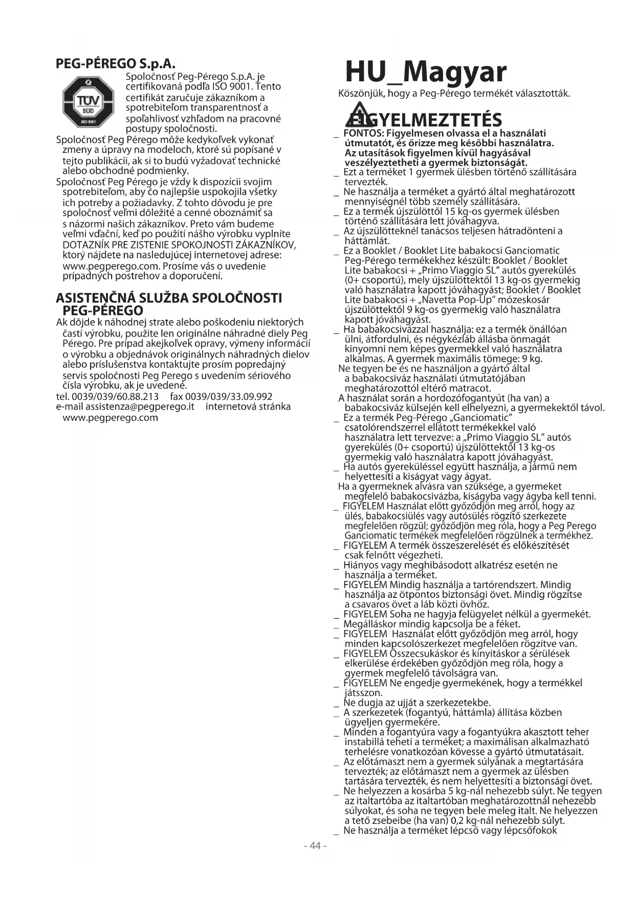 ÚDRŽBA VÝROBKU: chráňte výrobok pred atmosférickými vplyvmi: voda, dážď alebo sneh; nepretržité a dlhodobé vystavenie slnečnému žiareniu môže spôsobiť zmenu farby mnohých materiálov; uchovávajte výrobok na suchom mieste. Pravidelne vykonávajte kontroly a údržbu na hlavných častiach výrobku. ČISTENIE PODVOZKU: pravidelne čistite umelohmotné časti vlhkou handričkou; nepoužívajte rozpúšťadlá alebo podobné prostriedky; kovové časti výrobku vysušte, aby nedošlo k ich zhrdzaveniu; udržiavajte v čistom stave všetky mobilné časti výrobku (regulačné mechanizmy, úchytné mechanizmy, kolesá...), odstraňujte z nich prach a piesok a v prípade potreby ich namažte ľahkým olejom. ČISTENIE PLÁŠŤA: umývajte pomocou špongie a mydlovej vody, nepoužívajte pracie prostriedky. ČISTENIE TEXTILNÝCH ČASTÍ: textilné časti výrobku pravidelne vykefujte, čím odstránite prach a perte v rukách pri maximálnej teplote 30°; nežmýkajte; nepoužívajte prostriedky obsahujúce chlór; nežehlite; nečistite chemicky; na odstraňovanie škvŕn nepoužívajte rozpúšťadlá a nesušte v sušičke s otáčajúcim sa bubnom.- 44 - HU_Magyar Köszönjük, hogy a Peg-Pérego termékét választották. FIGYELMEZTETÉS _ FONTOS: Figyelmesen olvassa el a használati útmutatót, és őrizze meg későbbi használatra. Az utasítások figyelmen kívül hagyásával veszélyeztetheti a gyermek biztonságát. _ Ezt a terméket 1 gyermek ülésben történő szállítására tervezték. _ Ne használja a terméket a gyártó által meghatározott mennyiségnél több személy szállítására. _ Ez a termék újszülöttől 15 kg-os gyermek ülésben történő szállítására lett jóváhagyva. _ Az újszülötteknél tanácsos teljesen hátradönteni a háttámlát. _ Ez a Booklet / Booklet Lite babakocsi Ganciomatic Peg-Pérego termékekhez készült: Booklet / Booklet Lite babakocsi + „Primo Viaggio SL” autós gyerekülés (0+ csoportú), mely újszülöttektől 13 kg-os gyermekig való használatra kapott jóváhagyást; Booklet / Booklet Lite babakocsi + „Navetta Pop-Up” mózeskosár újszülöttektől 9 kg-os gyermekig való használatra kapott jóváhagyást. _ Ha babakocsivázzal használja: ez a termék önállóan ülni, átfordulni, és négykézláb állásba önmagát kinyomni nem képes gyermekkel való használatra alkalmas. A gyermek maximális tömege: 9 kg. Ne tegyen be és ne használjon a gyártó által a babakocsiváz használati útmutatójában meghatározottól eltérő matracot. A használat során a hordozófogantyút (ha van) a babakocsiváz külsején kell elhelyezni, a gyermekektől távol. _ Ez a termék Peg-Pérego „Ganciomatic” csatolórendszerrel ellátott termékekkel való használatra lett tervezve: a „Primo Viaggio SL” autós gyerekülés (0+ csoportú) újszülöttektől 13 kg-os gyermekig való használatra kapott jóváhagyást. _ Ha autós gyereküléssel együtt használja, a jármű nem helyettesíti a kiságyat vagy ágyat. Ha a gyermeknek alvásra van szüksége, a gyermeket megfelelő babakocsivázba, kiságyba vagy ágyba kell tenni. _ FIGYELEM Használat előtt győződjön meg arról, hogy az ülés, babakocsiülés vagy autósülés rögzítő szerkezete megfelelően rögzül; győződjön meg róla, hogy a Peg Perego Ganciomatic termékek megfelelően rögzülnek a termékhez. _ FIGYELEM A termék összeszerelését és előkészítését csak felnőtt végezheti. _ Hiányos vagy meghibásodott alkatrész esetén ne használja a terméket. _ FIGYELEM Mindig használja a tartórendszert. Mindig használja az ötpontos biztonsági övet. Mindig rögzítse a csavaros övet a láb közti övhöz. _ FIGYELEM Soha ne hagyja felügyelet nélkül a gyermekét. _ Megálláskor mindig kapcsolja be a féket. _ FIGYELEM Használat előtt győződjön meg arról, hogy minden kapcsolószerkezet megfelelően rögzítve van. _ FIGYELEM Összecsukáskor és kinyitáskor a sérülések elkerülése érdekében győződjön meg róla, hogy a gyermek megfelelő távolságra van. _ FIGYELEM Ne engedje gyermekének, hogy a termékkel játsszon. _ Ne dugja az ujját a szerkezetekbe. _ A szerkezetek (fogantyú, háttámla) állítása közben ügyeljen gyermekére. _ Minden a fogantyúra vagy a fogantyúkra akasztott teher instabillá teheti a terméket; a maximálisan alkalmazható terhelésre vonatkozóan kövesse a gyártó útmutatásait. _ Az előtámaszt nem a gyermek súlyának a megtartására tervezték; az előtámaszt nem a gyermek az ülésben tartására tervezték, és nem helyettesíti a biztonsági övet. _ Ne helyezzen a kosárba 5 kg-nál nehezebb súlyt. Ne tegyen az italtartóba az italtartóban meghatározottnál nehezebb súlyokat, és soha ne tegyen bele meleg italt. Ne helyezzen a tető zsebeibe (ha van) 0,2 kg-nál nehezebb súlyt. _ Ne használja a terméket lépcső vagy lépcsőfokok PEG-PÉREGO S.p.A. Spoločnosť Peg-Pérego S.p.A. je certifikovaná podľa ISO 9001. Tento certifikát zaručuje zákazníkom a spotrebiteľom transparentnosť a spoľahlivosť vzhľadom na pracovné postupy spoločnosti. Spoločnosť Peg Pérego môže kedykoľvek vykonať zmeny a úpravy na modeloch, ktoré sú popísané v tejto publikácii, ak si to budú vyžadovať technické alebo obchodné podmienky. Spoločnosť Peg Pérego je vždy k dispozícii svojim spotrebiteľom, aby čo najlepšie uspokojila všetky ich potreby a požiadavky. Z tohto dôvodu je pre spoločnosť veľmi dôležité a cenné oboznámiť sa s názormi našich zákazníkov. Preto vám budeme veľmi vďační, keď po použití nášho výrobku vyplníte DOTAZNÍK PRE ZISTENIE SPOKOJNOSTI ZÁKAZNÍKOV, ktorý nájdete na nasledujúcej internetovej adrese: www.pegperego.com. Prosíme vás o uvedenie prípadných postrehov a doporučení.