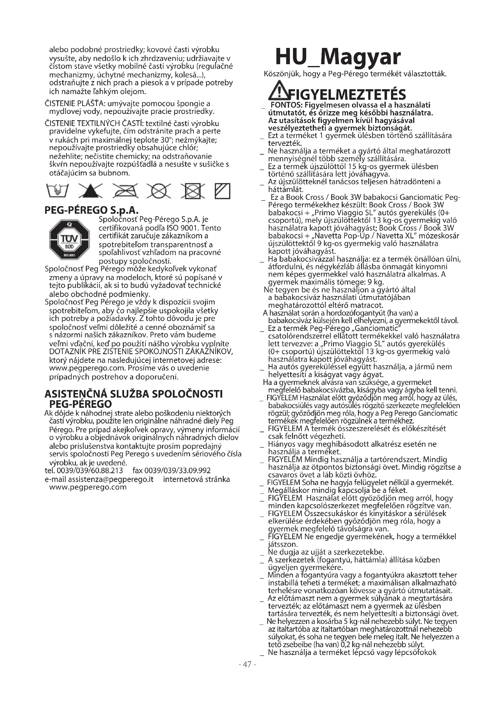 PEG-PÉREGO Ak dôjde k náhodnej strate alebo poškodeniu niektorých častí výrobku, použite len originálne náhradné diely Peg Pérego. Pre prípad akejkoľvek opravy, výmeny informácií o výrobku a objednávok originálnych náhradných dielov alebo príslušenstva kontaktujte prosím popredajný servis spoločnosti Peg Perego s uvedením sériového čísla výrobku, ak je uvedené. tel. 0039/039/60.88.213 fax 0039/039/33.09.992 e-mail assistenza@pegperego.it internetová stránka www.pegperego.com HU_Magyar Köszönjük, hogy a Peg-Pérego termékét választották. FIGYELMEZTETÉS _ FONTOS: Figyelmesen olvassa el a használati útmutatót, és őrizze meg későbbi használatra. Az utasítások figyelmen kívül hagyásával veszélyeztetheti a gyermek biztonságát. _ Ezt a terméket 1 gyermek ülésben történő szállítására tervezték. _ Ne használja a terméket a gyártó által meghatározott mennyiségnél több személy szállítására. _ Ez a termék újszülöttől 15 kg-os gyermek ülésben történő szállítására lett jóváhagyva. _ Az újszülötteknél tanácsos teljesen hátradönteni a háttámlát. _ Ez a Book Cross / Book 3W babakocsi Ganciomatic Peg- Pérego termékekhez készült: Book Cross / Book 3W babakocsi + „Primo Viaggio SL” autós gyerekülés (0+ csoportú), mely újszülöttektől 13 kg-os gyermekig való használatra kapott jóváhagyást; Book Cross / Book 3W babakocsi + „Navetta Pop-Up / Navetta XL” mózeskosár újszülöttektől 9 kg-os gyermekig való használatra kapott jóváhagyást. _ Ha babakocsivázzal használja: ez a termék önállóan ülni, átfordulni, és négykézláb állásba önmagát kinyomni nem képes gyermekkel való használatra alkalmas. A gyermek maximális tömege: 9 kg. Ne tegyen be és ne használjon a gyártó által a babakocsiváz használati útmutatójában meghatározottól eltérő matracot. A használat során a hordozófogantyút (ha van) a babakocsiváz külsején kell elhelyezni, a gyermekektől távol. _ Ez a termék Peg-Pérego „Ganciomatic” csatolórendszerrel ellátott termékekkel való használatra lett tervezve: a „Primo Viaggio SL” autós gyerekülés (0+ csoportú) újszülöttektől 13 kg-os gyermekig való használatra kapott jóváhagyást. _ Ha autós gyereküléssel együtt használja, a jármű nem helyettesíti a kiságyat vagy ágyat. Ha a gyermeknek alvásra van szüksége, a gyermeket megfelelő babakocsivázba, kiságyba vagy ágyba kell tenni. _ FIGYELEM Használat előtt győződjön meg arról, hogy az ülés, babakocsiülés vagy autósülés rögzítő szerkezete megfelelően rögzül; győződjön meg róla, hogy a Peg Perego Ganciomatic termékek megfelelően rögzülnek a termékhez. _ FIGYELEM A termék összeszerelését és előkészítését csak felnőtt végezheti. _ Hiányos vagy meghibásodott alkatrész esetén ne használja a terméket. _ FIGYELEM Mindig használja a tartórendszert. Mindig használja az ötpontos biztonsági övet. Mindig rögzítse a csavaros övet a láb közti övhöz. _ FIGYELEM Soha ne hagyja felügyelet nélkül a gyermekét. _ Megálláskor mindig kapcsolja be a féket. _ FIGYELEM Használat előtt győződjön meg arról, hogy minden kapcsolószerkezet megfelelően rögzítve van. _ FIGYELEM Összecsukáskor és kinyitáskor a sérülések elkerülése érdekében győződjön meg róla, hogy a gyermek megfelelő távolságra van. _ FIGYELEM Ne engedje gyermekének, hogy a termékkel játsszon. _ Ne dugja az ujját a szerkezetekbe. _ A szerkezetek (fogantyú, háttámla) állítása közben ügyeljen gyermekére. _ Minden a fogantyúra vagy a fogantyúkra akasztott teher instabillá teheti a terméket; a maximálisan alkalmazható terhelésre vonatkozóan kövesse a gyártó útmutatásait. _ Az előtámaszt nem a gyermek súlyának a megtartására tervezték; az előtámaszt nem a gyermek az ülésben tartására tervezték, és nem helyettesíti a biztonsági övet. _ Ne helyezzen a kosárba 5 kg-nál nehezebb súlyt. Ne tegyen az italtartóba az italtartóban meghatározottnál nehezebb súlyokat, és soha ne tegyen bele meleg italt. Ne helyezzen a tető zsebeibe (ha van) 0,2 kg-nál nehezebb súlyt. _ Ne használja a terméket lépcső vagy lépcsőfokok - 47 -közelében; ne használja olyan helyen, ahol a gyermek kezének a közelében hőforrás, szabad lángok vagy veszélyes tárgyak találhatóak. _ Csak a gyártó/forgalmazó által forgalmazott vagy ajánlott cserealkatrészek használhatók. _ FIGYELEM Ne használja az esővédőt (ha van) zárt környezetben, és mindig ellenőrizze, hogy a gyermek nincs-e túlmelegedve; soha ne tegye hőforrás közelébe, és ügyeljen a cigarettára. Ne használja az esővédőt azt megtartani képes tetőrész vagy napellenző nélküli babakocsin. Az esővédőt kizárólag felnőtt felügyelete mellett használja. Győződjön meg róla, hogy a babakocsi mozgásakor az esővédő semmilyen szerkezetbe nem akad be; a babakocsi bezárása előtt mindig vegye le az esővédőt. _ FIGYELEM Ez a termék nem használható kocogás vagy görkorcsolyázás közben. _ A gyermek kiszedése vagy berakása alatt mindig kapcsolja be a féket. _ FIGYELEM Ne rakjon be olyan matracot, melyet a gyártó nem hagyott jóvá. _ Ne használjon olyan kiegészítőket, amelyeket nem hagyott jóvá a gyártó.0