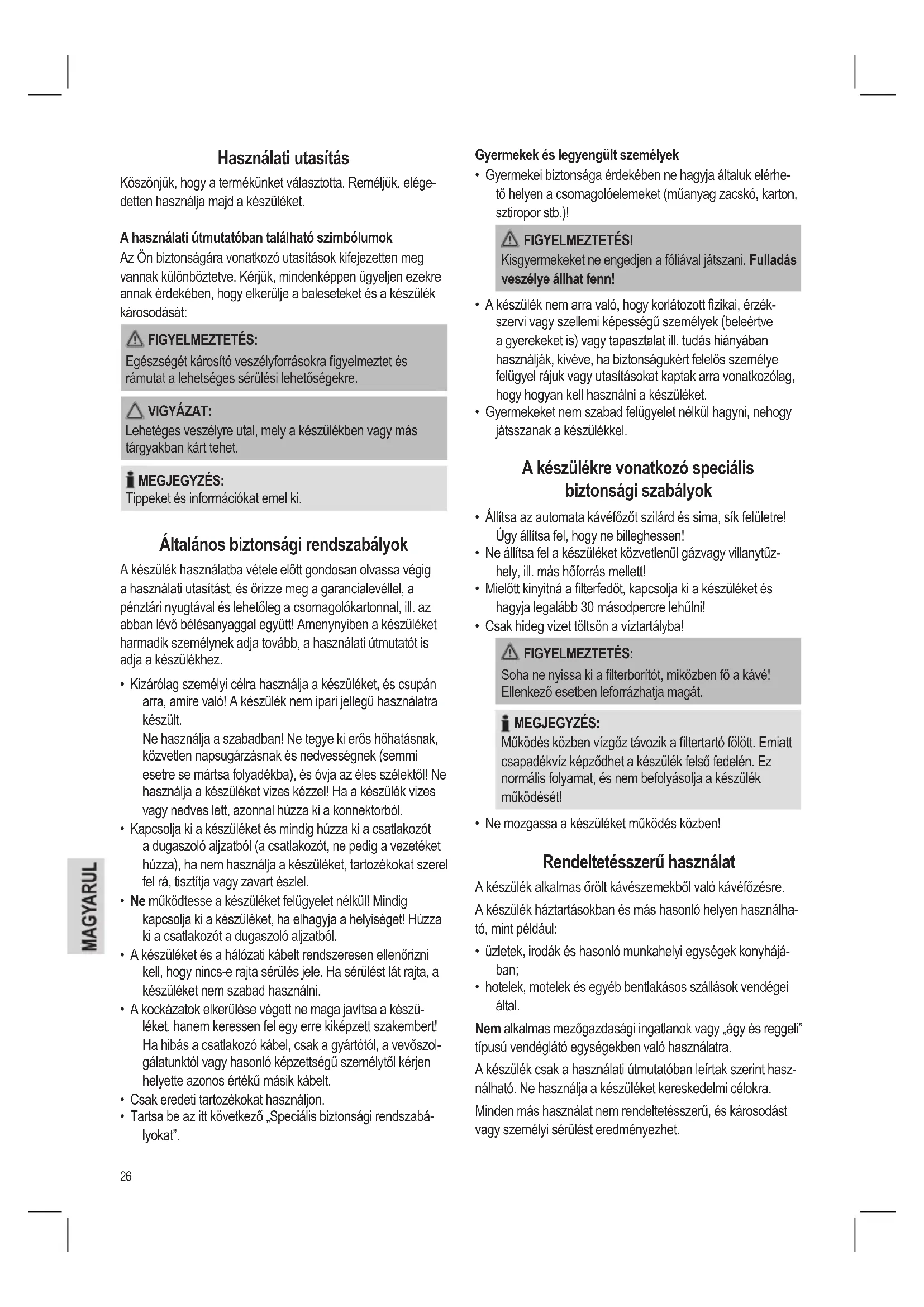 - Ne mozgassa a készüléket működés közben! Rendeltetésszerű használat A készülék alkalmas őrölt kávészemekből való kávéfőzésre. A készülék háztartásokban és más hasonló helyen használha- tó, mint például: