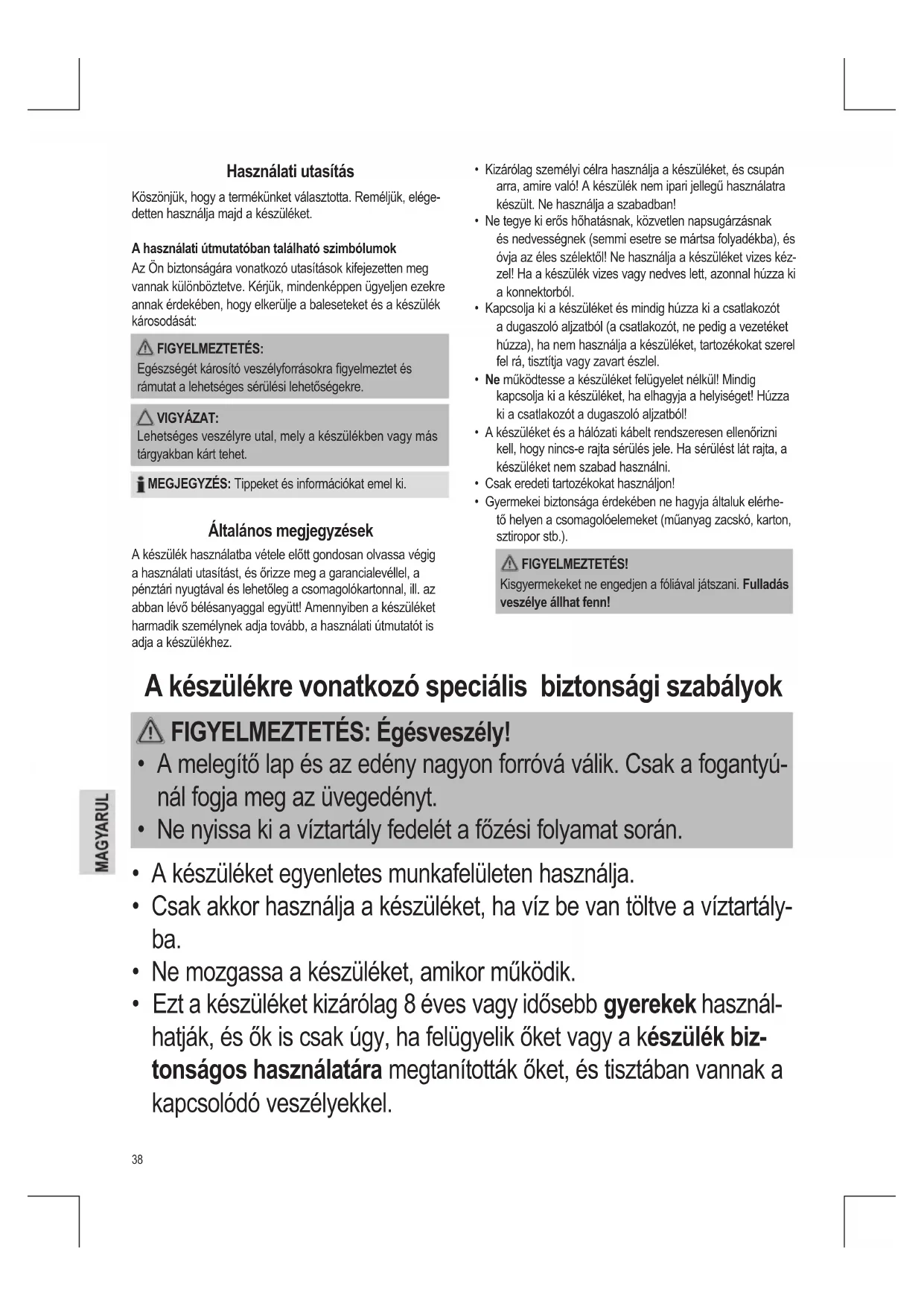 - Ezt a készüléket kizárólag 8 éves vagy idősebb gyerekek használ- hatják, és ők is csak úgy, ha felügyelik őket vagy a készülék biz- tonságos használatára megtanították őket, és tisztában vannak a kapcsolódó veszélyekkel.39