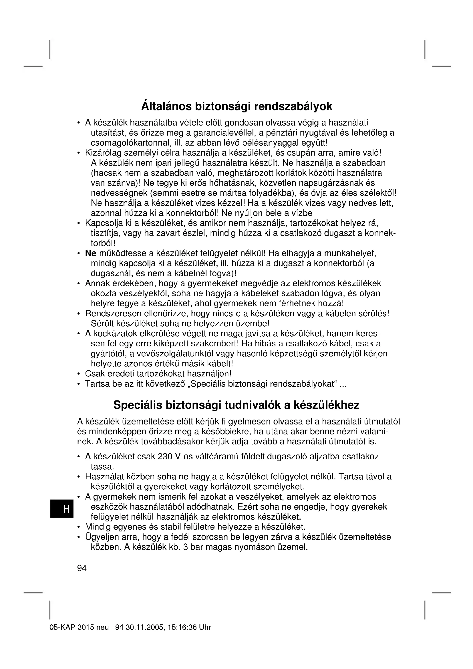 - Ügyeljen arra, hogy a fedél szorosan be legyen zárva a készülék üzemeltetése közben. A készülék kb. 3 bar magas nyomáson üzemel. 05-KAP 3015 neu 94 30.11.2005, 15:16:36 UhrH