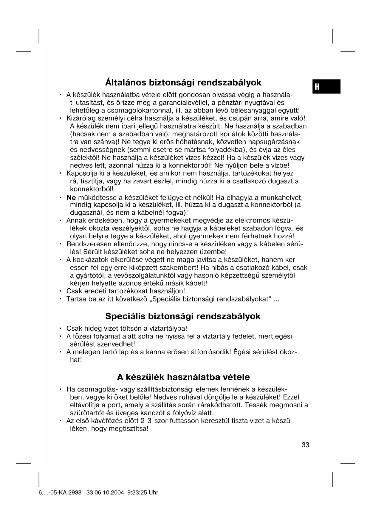 - Az első kávéfőzés előtt 2-3-szor futtasson keresztül tiszta vizet a készü- léken, hogy megtisztítsa! 6....-05-KA 2938 33 06.10.2004, 9:33:25 UhrH