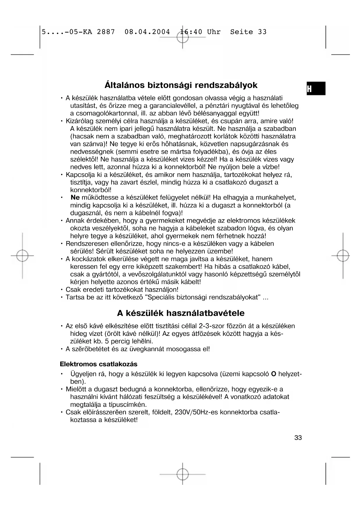 5....-05-KA 2887 08.04.2004 16:40 Uhr Seite 34Ezt a készüléket az Európa Tanács minden vonatkozó aktuális irányelve szerint (pl. elektromágnesesség-elviselő képesség vagy kisfeszültség-elviselő képes- ség) ellenőriztük, és a legújabb biztonságtechnikai előírások szerint készült. Megjegyezzük az esetleges müszaki változásokat! Garancia Az általunk forgalmazott készülékre a vétel időpontjától (pénztári nyugta) számított 24 havi garanciát vállalunk. A garanciális időn belül saját mérlegelésünk szerint javítással vagy cserével díjtalanul megszüntetjük a készülék vagy a tartozék *) olyan hiányosságait, ame- lyek anyaghibára vagy gyártási hibára vezethetők vissza. A garanciális szolgál- tatások sem a garanciális idő meghosszabbítását nem eredményezik, sem nem alapoznak meg újabb garanciára való igényt! A garancia igazolására a pénztári nyugta szolgál. E nélkül az igazolás nélkül sem díjmentes csere, sem díjtalan javítás nem végezhető. Garanciális esetben szíveskedjék az alapkészüléket eredeti csomagolásában a pénztári nyugtával együtt átadni a kereskedőjének! *) A tartozékok a jogszabályban előírt szavatossági kötelezettség (6 hónap) hatálya alá tartoznak, és nem vezetnek az egész készülék díjtalan cseréjére. Ilyen esetben ne a készüléket küldje be, ill. rendelje meg, hanem vevőszolgálatunkkal egyeztetve csak a hibás tartozékot! Az üvegtörés okozta hibák mindig térítéskötelesek! Sem az elhasználódó tartozékokban, ill. kopó alkatrészekben (pl. szénkefe, dagasztóhorog, hajtószíj, póttávvezérlő, pótfogkefe, fűrészlap stb.) bekövetkező hibák, sem a tisztítás, karbantartás vagy a kopó alkatrészek cseréje nem esik a garancia hatálya alá, következésképp térítésköteles. Illetéktelen beavatkozás a garancia megszűnését eredményezi. A garanciális idő után A garanciális idő eltelte után a megfelelő szakkereskedésben vagy javítószol- gálatnál végeztethet térítésköteles javításokat.