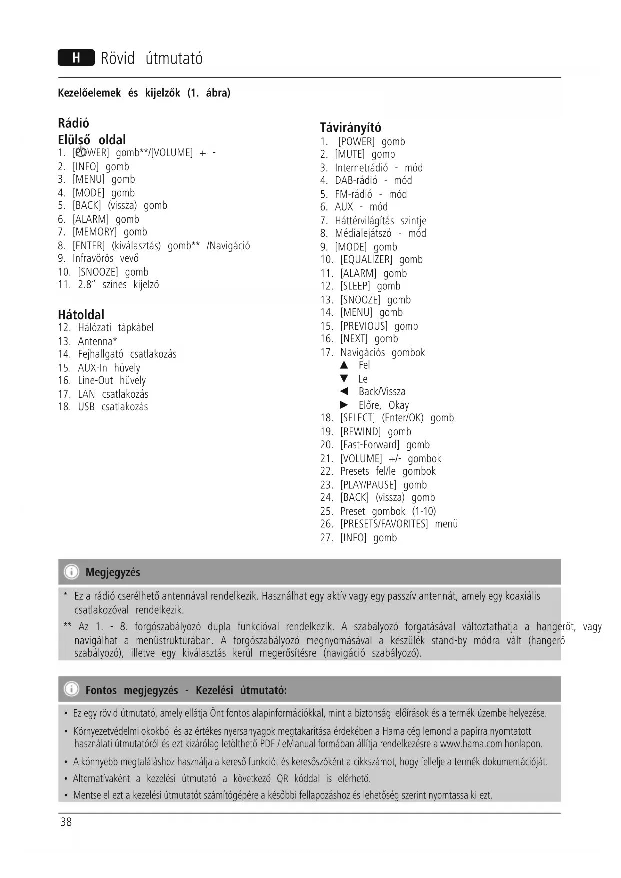 Töltse le az útmutatót a következőhöz Rádió PDF formátumban ingyenesen! Találja meg kézikönyvét DIR3100 - HAMA és vegye vissza elektronikus eszközét a kezébe. Ezen az oldalon közzé van téve az eszköze használatához szükséges összes dokumentum. DIR3100 márka HAMA.