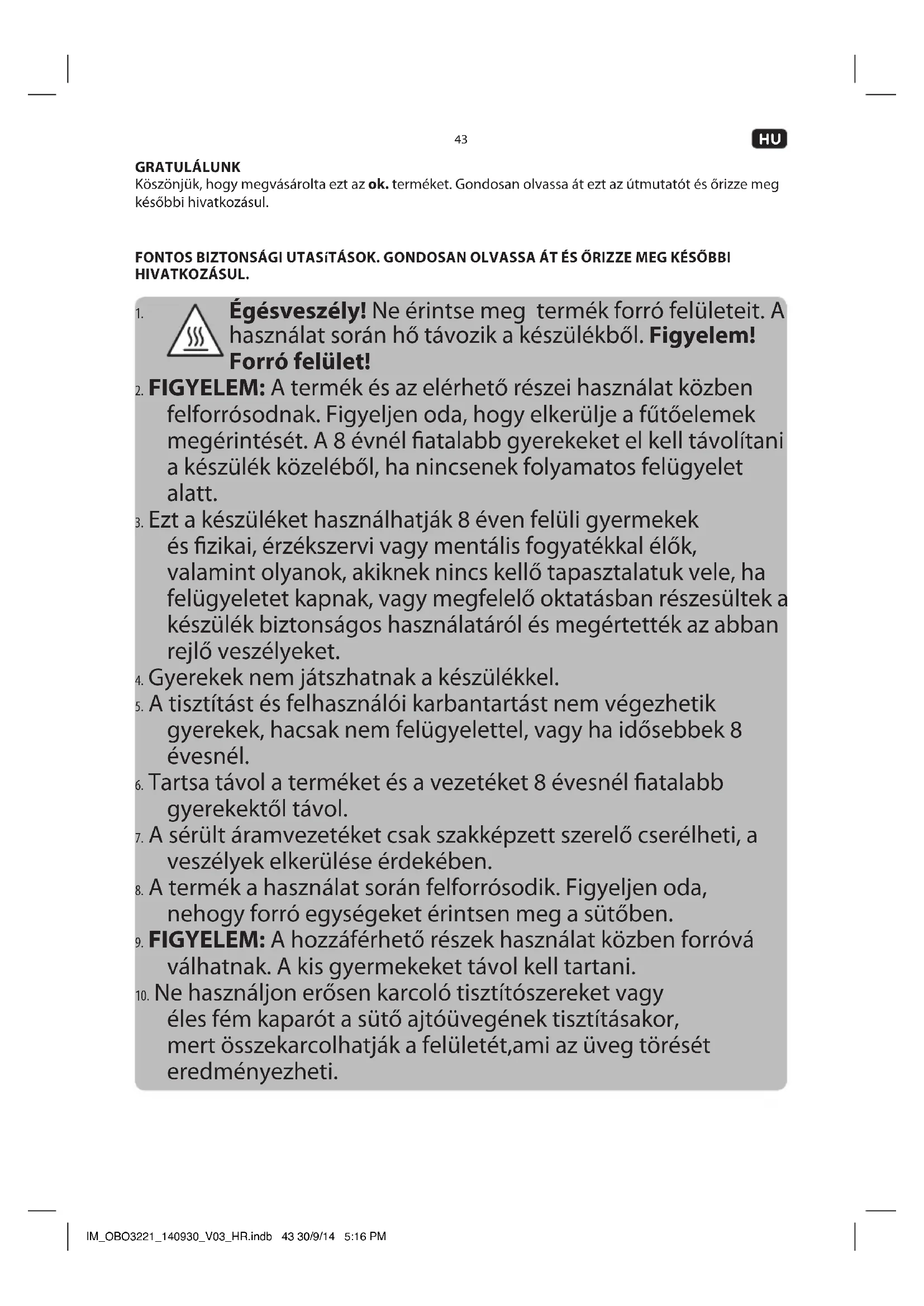 éles fém kaparót a sütő ajtóüvegének tisztításakor, mert összekarcolhatják a felületét,ami az üveg törését eredményezheti. IM_OBO3221_140930_V03_HR.indb 43 30/9/14 5:16 PM44