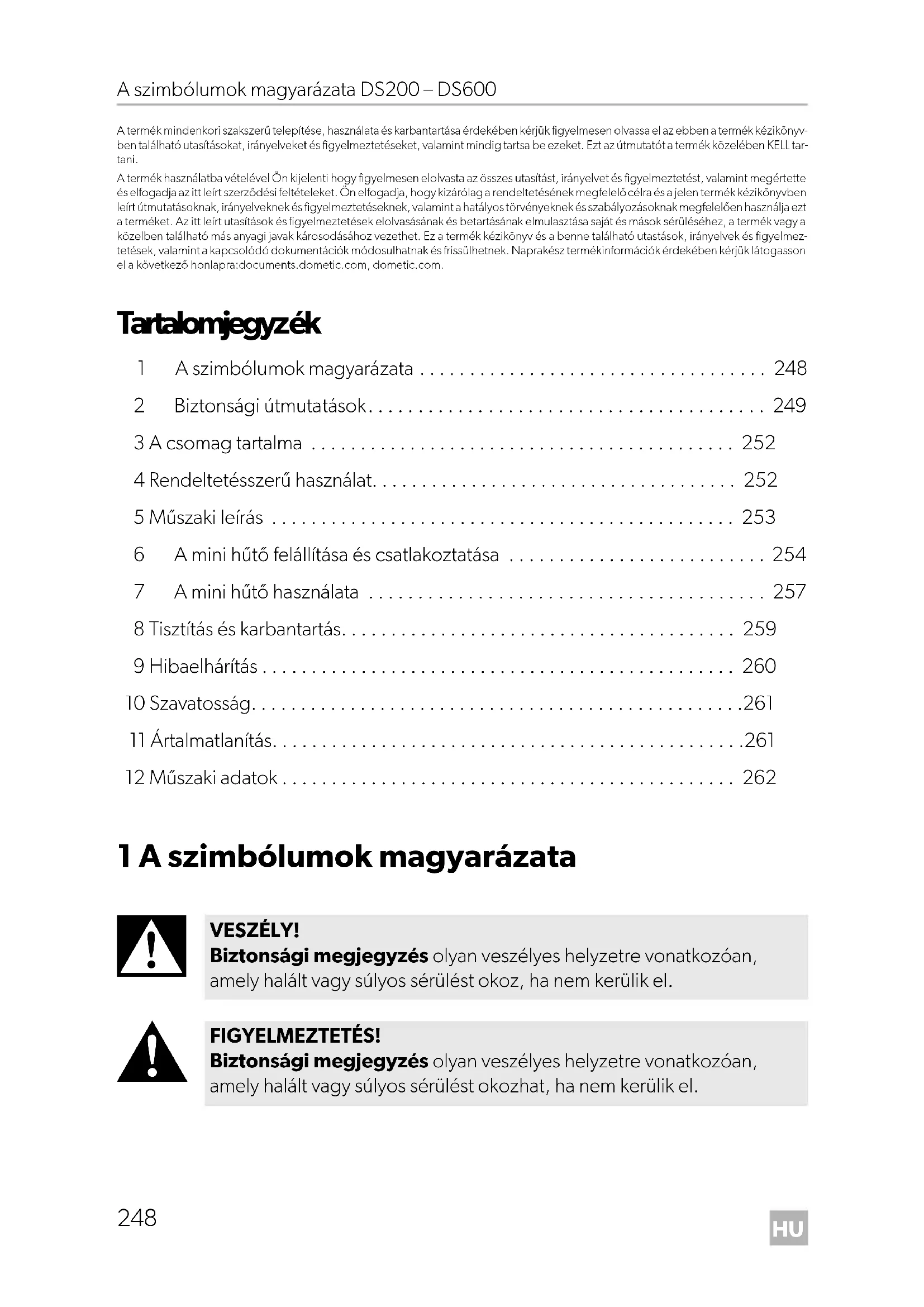 VESZÉLY! Biztonsági megjegyzés olyan veszélyes helyzetre vonatkozóan, amely halált vagy súlyos sérülést okoz, ha nem kerülik el. FIGYELMEZTETÉS! Biztonsági megjegyzés olyan veszélyes helyzetre vonatkozóan, amely halált vagy súlyos sérülést okozhat, ha nem kerülik el. DometicDS200-300-400-600_IOM_4445103315_EMEA16_2020-xx-xx.book Seite 248 Mittwoch, 3. März 2021 11:36 11HU DS200 – DS600 Biztonsági útmutatások