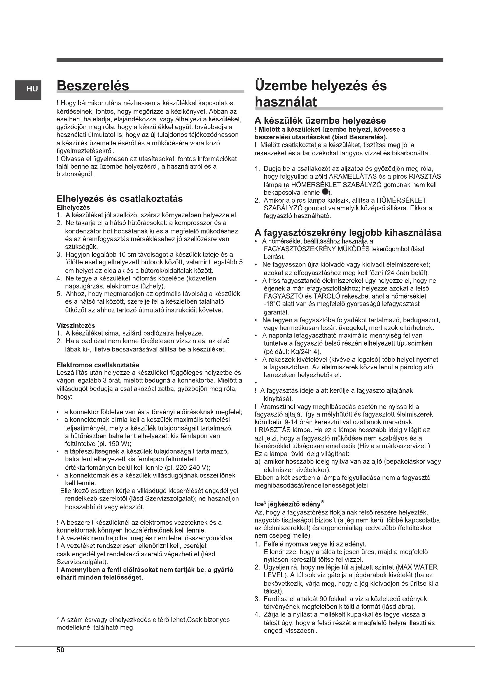 ! A fagyasztás ideje alatt kerülje a fagyasztó ajtajának kinyitását. ! Áramszünet vagy meghibásodás esetén ne nyissa ki a fagyasztó ajtaját: így a mélyhűtött és fagyasztott élelmiszerek körülbelül 9-14 órán keresztül változatlanok maradnak. ! RIASZTÁS lámpa. Ha ez a lámpa hosszabb ideig világít az azt jelzi, hogy a fagyasztó működése nem szabályos és a hőmérséklet túlságosan emelkedik (Hívja a márkaszervizet.) Ez a lámpa rövid ideig világíthat: a) amikor hosszabb ideig nyitva van az ajtó (bepakoláskor vagy élelmiszer kivételekor). Ebben a két esetben a lámpa felgyulladása nem a fagyasztó meghibásodását/rendellenességét jelzi Ice