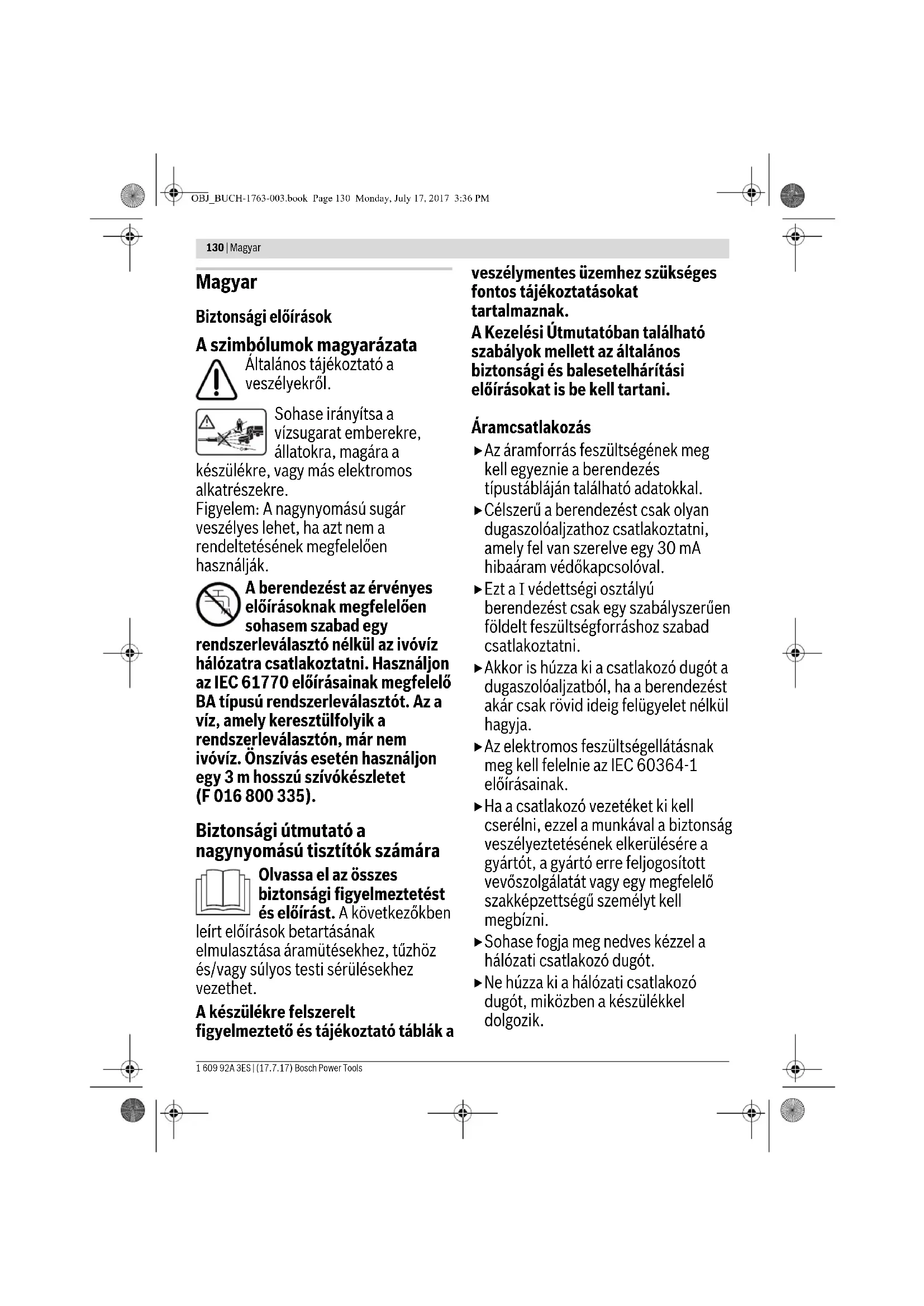Tlak je rovnomerný, ale príliš nízky Poznámka: Určité príslušenstvo spôsobuje nízky tlak Dýza je opotrebovaná Dýzu vymeňte Ventil štart/stop je opotrebovaný Spúšť 5 stlačte rýchlo niekoľkokrát za sebou Motor beží, ale tlak je obmedzený, alebo sa pracovný tlak nevytvoril Voda nie je pripojená Pripojte prívod vody Filter je upchatý Vyčistite filter Dýza je upchatá Vyčistite dýzu OBJ_BUCH-1763-003.book Page 128 Monday, July 17, 2017 3:36 PMSlovensky | 129 Bosch Power Tools 1 609 92A 3ES | (17.7.17) Údržba a servis Údržba Pred každou prácou na prístroji vytiahnite zástrčku prívodnej šnúry zo zásuvky a odpojte prívod vody. Upozornenie: Pravidelne vykonávajte nasledujúce práce na údržbe výrobku, aby ste zabezpečili jeho dlhodobé a spoľahlivé používanie. Náradie pravidelne kontrolujte, či nemá viditeľné poruchy, ako napr. uvoľnené spoje, alebo opotrebované prípadne poškodené súčiastky. Skontrolujte, či sú nepoškodené kryty a ochranné prvky a či sú správne namontované. Pred použitím vykonajte prípadne potrebnú údržbu alebo opravu produktu. Transport Keď chcete vysokotlakový čistič premiestniť, uchopte ho za hornú rukoväť a potiahnite ho na kolieskach na určené miesto. Keď chcete vysokotlakový čistič transportovať po schodoch alebo cez nejaké prekážky, uchopte ho za hornú rukoväť a preneste ho. Po použití/uskladnenie Vonkajšok vysokotlakového čističa dôkladne vyčistite pomocou mäkkej kefy a vyutierajte ho nejakou handrou. Nesmiete používať vodu ani žiadne rozpúšťadlá a leštiace prostriedky. Odstráňte všetky nečistoty, predovšetkým tie, ktoré sa usadili na vzduchových štrbinách motora. Skladovanie po skončení sezóny Vyprázdnite vodu z čerpadla takým spôsobom, že necháte motor niekoľko sekúnd bežať a podržíte stlačenú spúšť. Neklaďte na tento elektrický prístroj žiadne iné predmety. Zabezpečte, aby nebola sieťová šnúra počas uskladnenia produktu nejakým spôsobom zacviknutá. Vysokotlakovú hadicu nekrčte a nelámte. Servisné stredisko a poradenstvo pri používaní www.bosch-do-it.com Pri všetkých dopytoch a objednávkach náhradných súčiastok uvádzajte bezpodmienečne 10-miestne vecné číslo uvedené na typovom štítku výrobku. Slovakia Na www.bosch-pt.sk si môžete objednať opravu vášho stroja alebo náhradné diely online. Tel.: +421 2 48 703 800 Fax: +421 2 48 703 801 E-Mail: servis.naradia@sk.bosch.com www.bosch-pt.sk Ochrana životného prostredia Chemikálie, ktoré zaťažujú životné prostredie, sa nesmú dostať do pôdy ani do spodnej vody, do rybníkov, do riek a pod. V prípade použitia čistiacich prostriedkov presne dodržiavajte údaje uvedené na obale a predpísané riedenie. Pri čistení motorových vozidiel dodržiavajte miestne predpisy: Treba zabrániť tomu, aby sa ostriekaný olej dostal do spodnej vody. Likvidácia Vysokotlakový čistič, príslušenstvo a obal treba dať na recykláciu šetriacu životné prostredie. Neodhadzujte ručný vysokotlakový čistič do komunálneho odpadu! Len pre krajiny EÚ: Podľa Európskej smernice 2012/19/EÚ o starých elektrických a elektronických výrobkoch a podľa jej aplikácií v národnom práve Vášho štátu sa musia už nepoužiteľné elektrické a elektronické prístroje zbierať separovane a dávať na recykláciu zodpovedajúcu ochrane životného prostredia. Zmeny vyhradené. Vysokotlakový čistič sa spúšťa sám od seba Čerpadlo alebo striekacia pištoľ sú netesné Obráťte sa na autorizované servisné stredisko Bosch Prístroj je netesný Čerpadlo je netesné Malé netesnosti sú prípustné. V prípade väčších netesností sa obráťte na autorizované servisné stredisko Čistiaci prostriedok sa nenasáva Nastaviteľná dýza v polohe pre vysoký tlak Nastavte dýzu na „Lo“ Čistiaci prostriedok príliš hustý Zriediť vodou Vysokotlaková hadica bola predĺžená Pripojte originálnu hadicu V čistiacom okruhu sú zvyšky alebo zúžené miesto Vypláchnuť čistou vodou a odstrániť zúžené miesto Ak by problém pretrvával, obráťte sa na autorizované servisné stredisko Bosch. Symptómy Možná príčina Odstránenie príčiny OBJ_BUCH-1763-003.book Page 129 Monday, July 17, 2017 3:36 PM130 | Magyar 1 609 92A 3ES | (17.7.17) Bosch Power Tools Magyar Biztonsági előírások A szimbólumok magyarázata Általános tájékoztató a veszélyekről. Sohase irányítsa a vízsugarat emberekre, állatokra, magára a készülékre, vagy más elektromos alkatrészekre. Figyelem: A nagynyomású sugár veszélyes lehet, ha azt nem a rendeltetésének megfelelően használják. A berendezést az érvényes előírásoknak megfelelően sohasem szabad egy rendszerleválasztó nélkül az ivóvíz hálózatra csatlakoztatni. Használjon az IEC 61770 előírásainak megfelelő BA típusú rendszerleválasztót. Az a víz, amely keresztülfolyik a rendszerleválasztón, már nem ivóvíz. Önszívás esetén használjon egy 3 m hosszú szívókészletet (F 016 800 335). Biztonsági útmutató a nagynyomású tisztítók számára Olvassa el az összes biztonsági figyelmeztetést és előírást. A következőkben leírt előírások betartásának elmulasztása áramütésekhez, tűzhöz és/vagy súlyos testi sérülésekhez vezethet. A készülékre felszerelt figyelmeztető és tájékoztató táblák a veszélymentes üzemhez szükséges fontos tájékoztatásokat tartalmaznak. A Kezelési Útmutatóban található szabályok mellett az általános biztonsági és balesetelhárítási előírásokat is be kell tartani. Áramcsatlakozás Az áramforrás feszültségének meg kell egyeznie a berendezés típustábláján található adatokkal. Célszerű a berendezést csak olyan dugaszolóaljzathoz csatlakoztatni, amely fel van szerelve egy 30 mA hibaáram védőkapcsolóval. Ezt a I védettségi osztályú be
