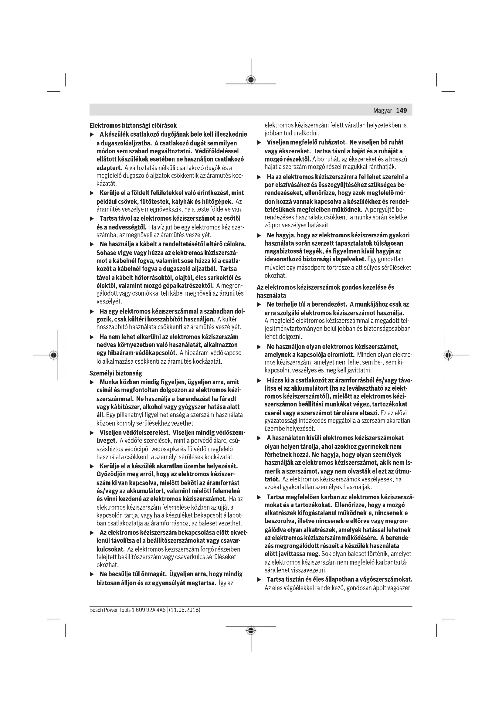 dĺžky skrutky. Údržba a servis Údržba a čistenie Vyberte akumulátor pred každou prácou na elektric- kom náradí (napr. údržba, výmena nástroja a pod.) ako aj pri preprave a úschove ručného elektrického nára- dia. V prípade neúmyselného zapnutia vypínača hrozí ne- bezpečenstvo poranenia. Ručné elektrické náradie a jeho vetracie štrbiny udržia- vajte vždy v čistote, aby ste mohli pracovať kvalitne a bezpečne. Keď akumulátor prestane správne fungovať, obráťte sa láska- vo na autorizované servisné stredisko ručného elektrického náradia Bosch. Servisné stredisko a poradenstvo pri používaní Servisné stredisko Vám odpovie na otázky týkajúce sa opravy a údržby Vášho produktu ako aj náhradných súčiastok. Rozlo- žené obrázky a informácie k náhradným súčiastkam nájdete aj na web-stránke: www.bosch-pt.com Tím poradcov Bosch Vám s radosťou poskytne pomoc pri otázkach týkajúcich sa našich produktov a ich príslušenstva. V prípade akýchkoľvek otázok a objednávok náhradných sú- čiastok uvádzajte bezpodmienečne 10-miestne vecné číslo uvedené na typovom štítku výrobku. Slovakia Na www.bosch-pt.sk si môžete objednať opravu vášho stroja alebo náhradné diely online. Tel.: (02) 48 703 800 Fax: (02) 48 703 801 E-Mail: servis.naradia@sk.bosch.com www.bosch.sk Transport Priložené lítiovo-iónové akumulátory podliehajú požiadavkám pre transport nebezpečného nákladu. Tieto akumulátory smie používateľ náradia prepravovať po cestách bez ďalších opat- rení. Pri zasielaní tretími osobami (napr.: leteckou dopravou alebo prostredníctvom špedície) treba rešpektovať osobitné požia- davky na obaly a označenie. V takomto prípade treba pri príp- rave zásielky bezpodmienečne konzultovať s expertom pre prepravu nebezpečného tovaru. Akumulátory zasielajte iba vtedy, ak nemajú poškodený obal. Otvorené kontakty prelepte a akumulátor zabaľte tak, aby sa v obale nemohol posúvať. Rešpektujte aj prípadné doplňujúce národné predpisy. Likvidácia Ručné elektrické náradie, príslušenstvo a obal treba dať na recykláciu zodpovedajúcu ochrane životného prostredia. Neodhadzujte ručné elektrické náradie ani akumulátory/baté- rie do komunálneho odpadu! Len pre krajiny EÚ: Podľa Európskej smernice 2012/19/EÚ sa musí nepoužiteľné ručné elektrické náradie (elektrospotrebiče) a podľa európskej smernice 2006/66/ES sa musia poškode- né alebo opotrebované akumulátory/baté- rie zbierať separovane a treba ich dávať na recykláciu zodpovedajúcu ochrane životné- ho prostredia. Akumulátory/batérie: Li-Ion: Všimnite si láskavo pokyny v odseku „Transport“, strana 87. Zmeny vyhradené. Magyar Biztonsági előírások Általános biztonsági előírások az elektromos kéziszerszámokhoz Olvassa el az összes bizton- sági figyelmeztetést és elő- írást. A következőkben leírt előírások betartásának elmulasz- tása áramütésekhez, tűzhöz és/vagy súlyos testi sérülésekhez vezethet. Kérjük a későbbi használatra gondosan őrizze meg ezeket az előírásokat. Az alább alkalmazott „elektromos kéziszerszám” fogalom a hálózati elektromos kéziszerszámokat (hálózati csatlakozó kábellel) és az akkumulátoros elektromos kéziszerszámokat (hálózati csatlakozó kábel nélkül) foglalja magában. Munkahelyi biztonság Tartsa tisztán és jól megvilágított állapotban a munka- helyét. A rendetlenség és a megvilágítatlan munkaterület balesetekhez vezethet. Ne dolgozzon a berendezéssel olyan robbanásveszé- lyes környezetben, ahol éghető folyadékok, gázok vagy porok vannak. Az elektromos kéziszerszámok szik- rákat keltenek, amelyek a port vagy a gőzöket meggyújt- hatják. FIGYELMEZTETÉS OBJ_BUCH-2907-001.book Page 87 Wednesday, July 27, 2016 9:32 AM88 | Magyar 1 609 92A 2P0 | (27.7.16) Bosch Power Tools Tartsa távol a gyerekeket és az idegen személyeket a munkahelytől, ha az elektromos kéziszerszámot hasz- nálja. Ha elvonják a figyelmét, elvesztheti az uralmát a be- rendezés felett. Elektromos biztonsági előírások A készülék csatlakozó dugójának bele kell illeszkednie a dugaszolóaljzatba. A csatlakozó dugót semmilyen módon sem szabad megváltoztatni. Védőföldeléssel el- látott készülékekkel kapcsolatban ne használjon csat- lakozó adaptert. A változtatás nélküli csatlakozó dugók és a megfelelő dugaszoló aljzatok csökkentik az áramütés kockázatát. Kerülje el a földelt felületek, mint például csövek, fűtő- testek, kályhák és hűtőgépek megérintését. Az áram- ütési veszély megnövekszik, ha a teste le van földelve. Tartsa távol az elektromos kéziszerszámot az esőtől vagy nedvességtől. Ha víz hatol be egy elektromos kézi- szerszámba, ez megnöveli az áramütés veszélyét. Ne használja a kábelt a rendeltetésétől eltérő célokra, vagyis a szerszámot soha ne hordozza vagy akassza fel a kábelnél fogva, és sohase húzza ki a hálózati csat- lakozó dugót a kábelnél fogva. Tartsa távol a kábelt hő- forrásoktól, olajtól, éles élektől és sarkoktól és mozgó gépalkatrészektől. Egy megrongálódott vagy csomókkal teli kábel megnöveli az áramütés veszélyét. Ha egy elektromos kéziszerszámmal a szabad ég alatt dolgozik, csak szabadban való használatra engedélye- zett hosszabbítót használjon. A szabadban való hasz- nálatra engedélyezett hosszabbító használata csökkenti az áramütés veszélyét. Ha nem lehet elkerülni az elektromos kéziszerszám nedves környezetben való használatát, alkalmazzon egy hibaáram-védőkapcsolót. Egy hibaáram-védőkap- csoló alkalmazása csökkenti az áramütés kockázatát. Személyi biztonság Munka közben mindig figyeljen, ügyeljen arra, amit csi- nál és meggondoltan dolgozzon az elektromos kézi- szerszámmal. Ha fáradt, ha káb