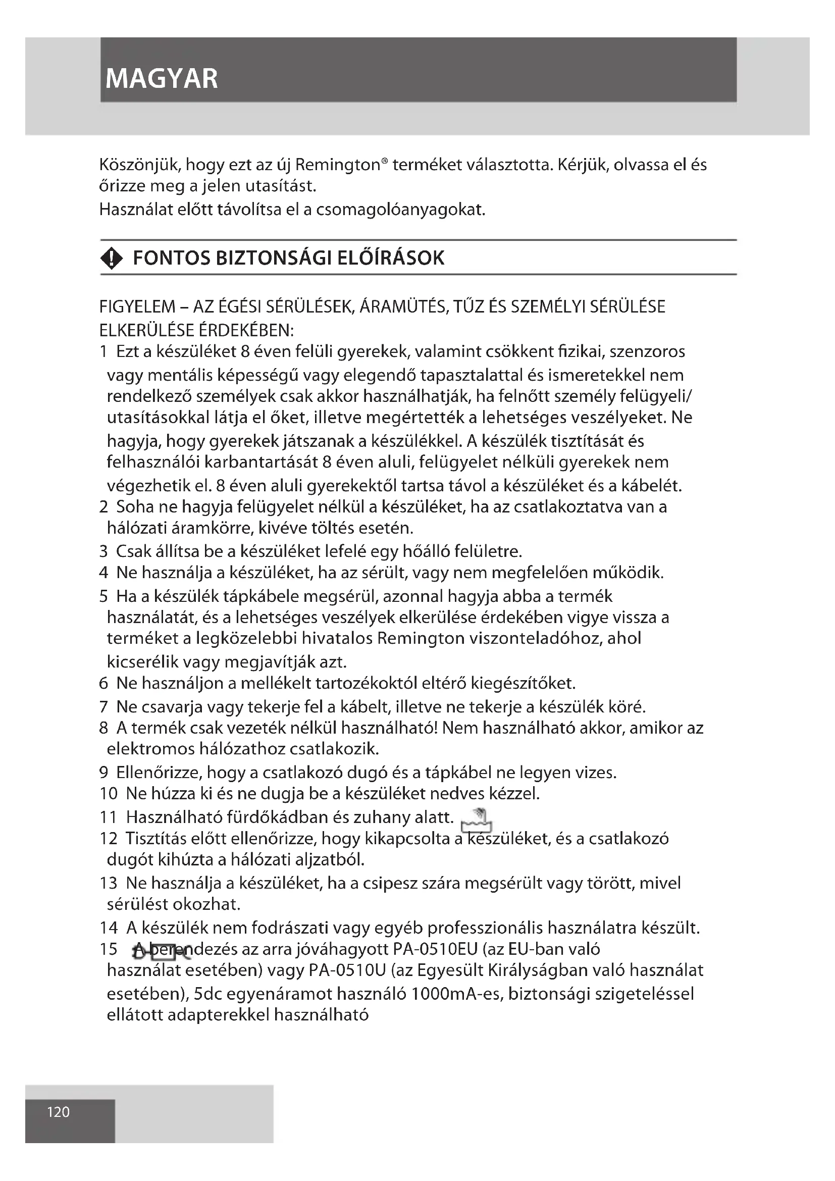 Aby uniknąć zagrożeń dla środowiska i zdrowia ze względu na niebezpieczne substancje znajdujące się w komponentach elektrycznych i elektronicznych, urządzeń oznaczonych tym symbolem nie wyrzucaj wraz z niesortowanymi odpadami komunalnymi - składniki urządzenia mogą być ponownie wykorzystane lub poddane recyklingowi. GBDNLFEIDKSFINPSKCZ HUN PLRUTRROGRSIBG HRUAAE POLSKI120 Köszönjük, hogy ezt az új Remington® terméket választotta. Kérjük, olvassa el és őrizze meg a jelen utasítást. Használat előtt távolítsa el a csomagolóanyagokat. F FONTOS BIZTONSÁGI ELŐÍRÁSOK FIGYELEM – AZ ÉGÉSI SÉRÜLÉSEK, ÁRAMÜTÉS, TŰZ ÉS SZEMÉLYI SÉRÜLÉSE ELKERÜLÉSE ÉRDEKÉBEN: 1 Ezt a készüléket 8 éven felüli gyerekek, valamint csökkent fizikai, szenzoros vagy mentális képességű vagy elegendő tapasztalattal és ismeretekkel nem rendelkező személyek csak akkor használhatják, ha felnőtt személy felügyeli/ utasításokkal látja el őket, illetve megértették a lehetséges veszélyeket. Ne hagyja, hogy gyerekek játszanak a készülékkel. A készülék tisztítását és felhasználói karbantartását 8 éven aluli, felügyelet nélküli gyerekek nem végezhetik el. 8 éven aluli gyerekektől tartsa távol a készüléket és a kábelét. 2 Soha ne hagyja felügyelet nélkül a készüléket, ha az csatlakoztatva van a hálózati áramkörre, kivéve töltés esetén. 3 Csak állítsa be a készüléket lefelé egy hőálló felületre. 4 Ne használja a készüléket, ha az sérült, vagy nem megfelelően működik. 5 Ha a készülék tápkábele megsérül, azonnal hagyja abba a termék használatát, és a lehetséges veszélyek elkerülése érdekében vigye vissza a terméket a legközelebbi hivatalos Remington viszonteladóhoz, ahol kicserélik vagy megjavítják azt. 6 Ne használjon a mellékelt tartozékoktól eltérő kiegészítőket. 7 Ne csavarja vagy tekerje fel a kábelt, illetve ne tekerje a készülék köré. 8 A termék csak vezeték nélkül használható! Nem használható akkor, amikor az elektromos hálózathoz csatlakozik. 9 Ellenőrizze, hogy a csatlakozó dugó és a tápkábel ne legyen vizes. 10 Ne húzza ki és ne dugja be a készüléket nedves kézzel. 11 Használható fürdőkádban és zuhany alatt. 12 Tisztítás előtt ellenőrizze, hogy kikapcsolta a készüléket, és a csatlakozó dugót kihúzta a hálózati aljzatból. 13 Ne használja a készüléket, ha a csipesz szára megsérült vagy törött, mivel sérülést okozhat. 14 A készülék nem fodrászati vagy egyéb professzionális használatra készült. 15 A berendezés az arra jóváhagyott PA-0510EU (az EU-ban való használat esetében) vagy PA-0510U (az Egyesült Királyságban való használat esetében), 5dc egyenáramot használó 1000mA-es, biztonsági szigeteléssel ellátott adapterekkel használható MAGYAR121