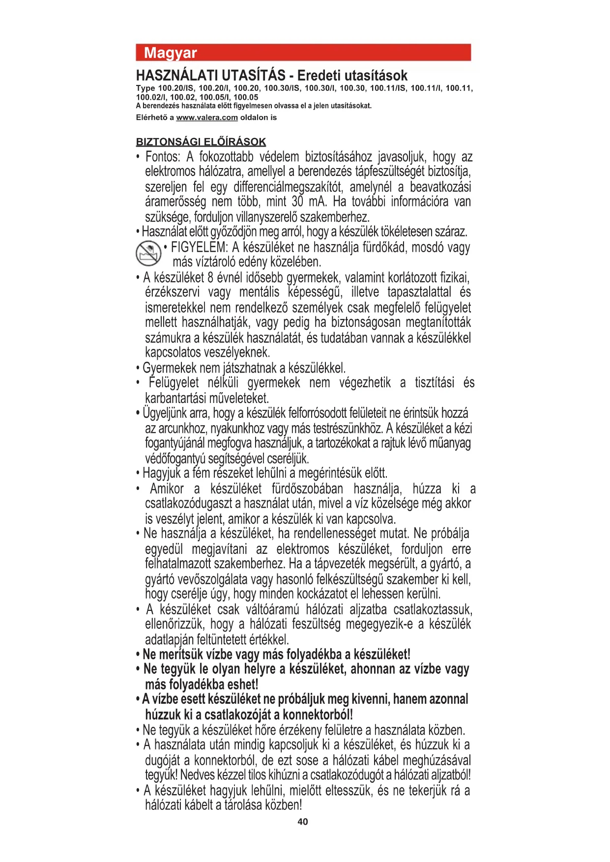- FIGYELEM: A készüléket ne használja fürdőkád, mosdó vagy más víztároló edény közelében.
