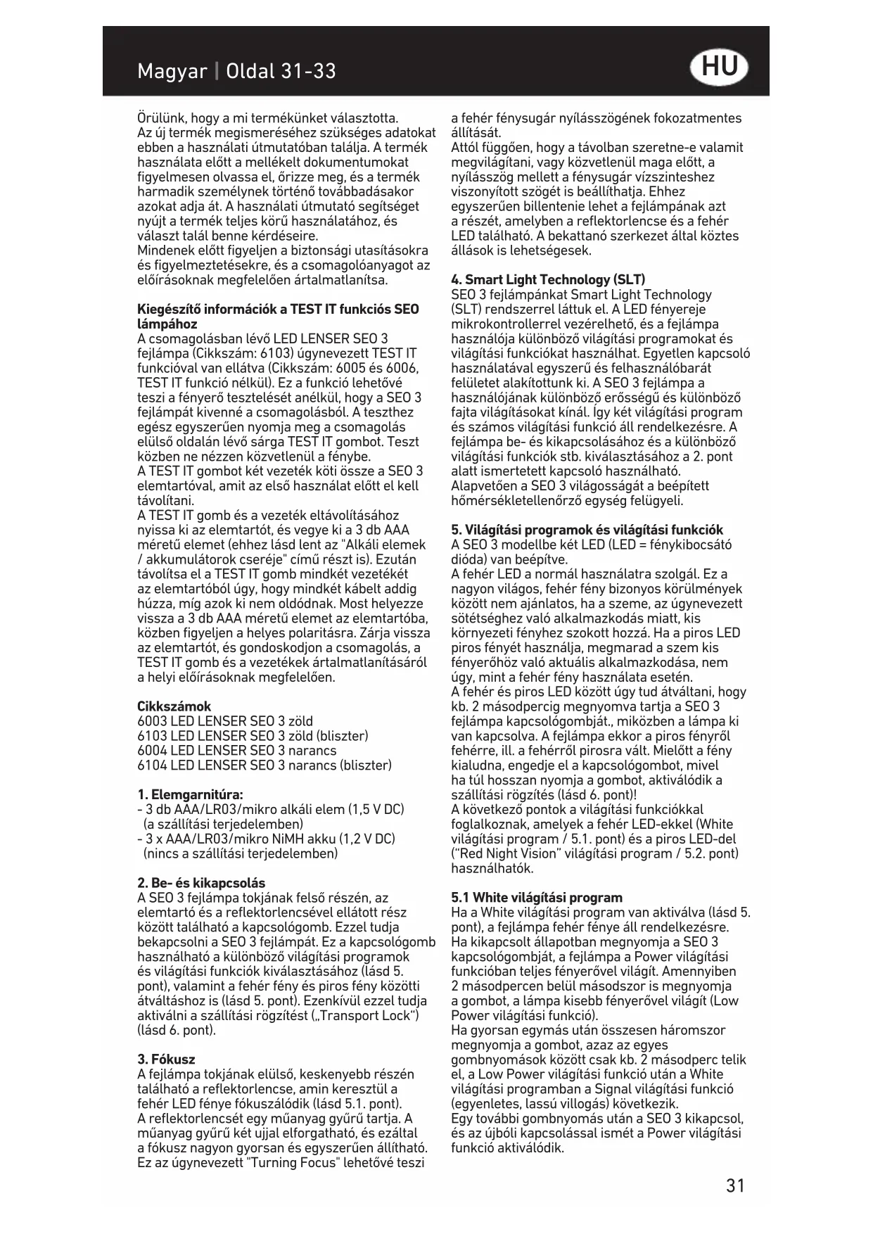A nem ujratolthet o elementek (pl. alkali element) nem szabad felttolteni. Soha ne hasznaljon egyszerre akkumulatorokat es elementek. Mindig egyszerre cserelje ki az osszes element. A SEO 3 fejlampaban kizarolag alkali elementek hasznaljon (AAA/LR03/mikro 1,5 V DC).
