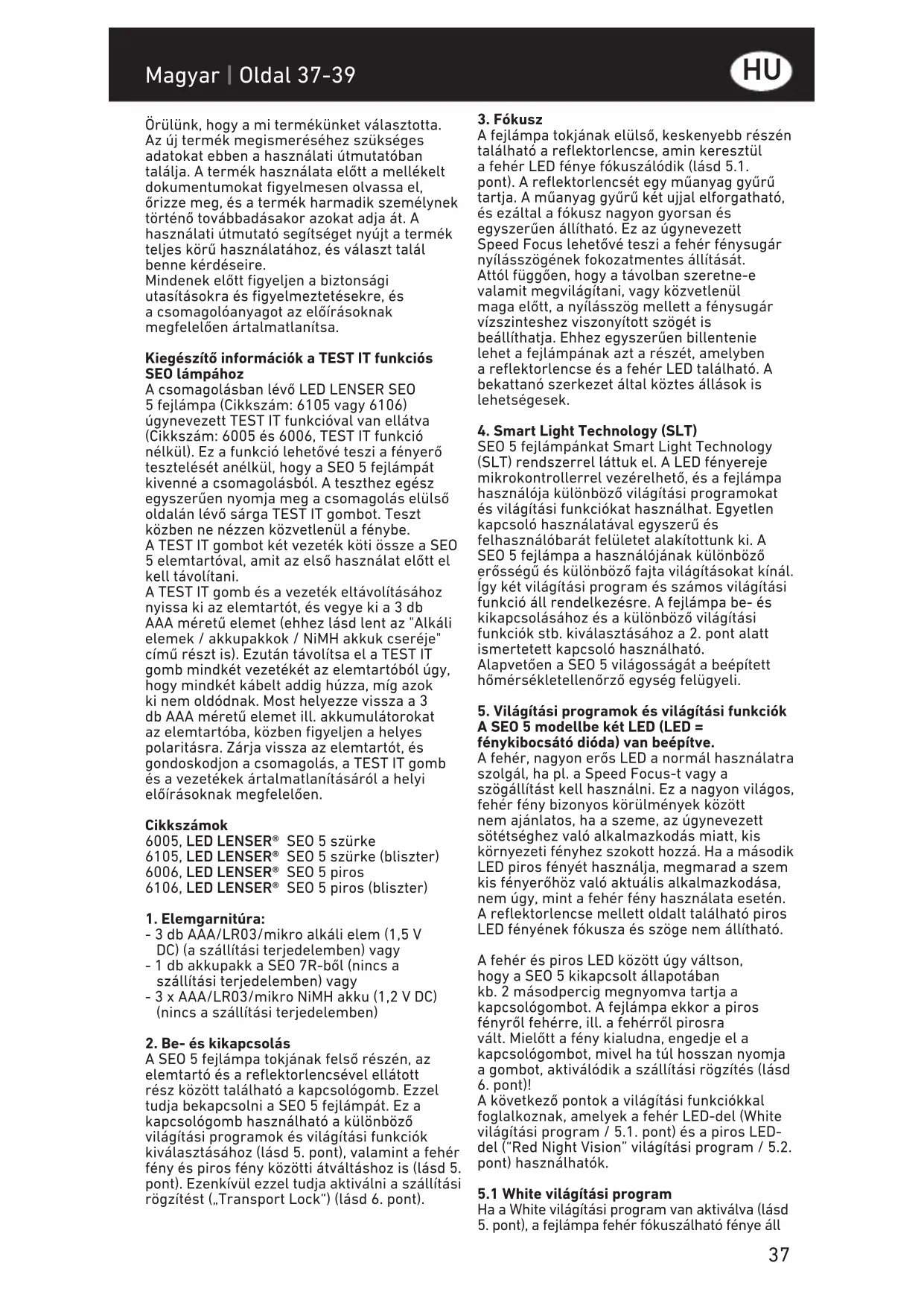 Magyar | Oldal 37-39 Örülünk, hogy a mi termékünket választotta. Az új termék megismeréséhez szükséges adatokat ebben a használati útmutatóban találja. A termék használata előtt a mellékelt dokumentumokat figyelmesen olvassa el, őrizze meg, és a termék harmadik személynek történő továbbadásakor azokat adja át. A használati útmutató segítséget nyújt a termék teljes körű használatához, és választ talál benne kérdéseire. Mindenek előtt figyeljen a biztonsági utasításokra és figyelmeztetésekre, és a csomagolóanyagot az előírásoknak megfelelően ártalmatlanítsa. Kiegészítő információk a TEST IT funkciós SEO lámpához A csomagolásban lévő LED LENSER SEO 5 fejlámpa (Cikkszám: 6105 vagy 6106) úgynevezett TEST IT funkcióval van ellátva (Cikkszám: 6005 és 6006, TEST IT funkció nélkül). Ez a funkció lehetővé teszi a fényerő tesztelését anélkül, hogy a SEO 5 fejlámpát kivenné a csomagolásból. A teszthez egész egyszerűen nyomja meg a csomagolás elülső oldalán lévő sárga TEST IT gombot. Teszt közben ne nézzen közvetlenül a fénybe. A TEST IT gombot két vezeték köti össze a SEO 5 elemtartóval, amit az első használat előtt el kell távolítani. A TEST IT gomb és a vezeték eltávolításához nyissa ki az elemtartót, és vegye ki a 3 db AAA méretű elemet (ehhez lásd lent az "Alkáli elemek / akkupakkok / NiMH akkuk cseréje" című részt is). Ezután távolítsa el a TEST IT gomb mindkét vezetékét az elemtartóból úgy, hogy mindkét kábelt addig húzza, míg azok ki nem oldódnak. Most helyezze vissza a 3 db AAA méretű elemet ill. akkumulátorokat az elemtartóba, közben figyeljen a helyes polaritásra. Zárja vissza az elemtartót, és gondoskodjon a csomagolás, a TEST IT gomb és a vezetékek ártalmatlanításáról a helyi előírásoknak megfelelően. Cikkszámok 6005, LED LENSER® SEO 5 szürke 6105, LED LENSER® SEO 5 szürke (bliszter) 6006, LED LENSER® SEO 5 piros 6106, LED LENSER® SEO 5 piros (bliszter)