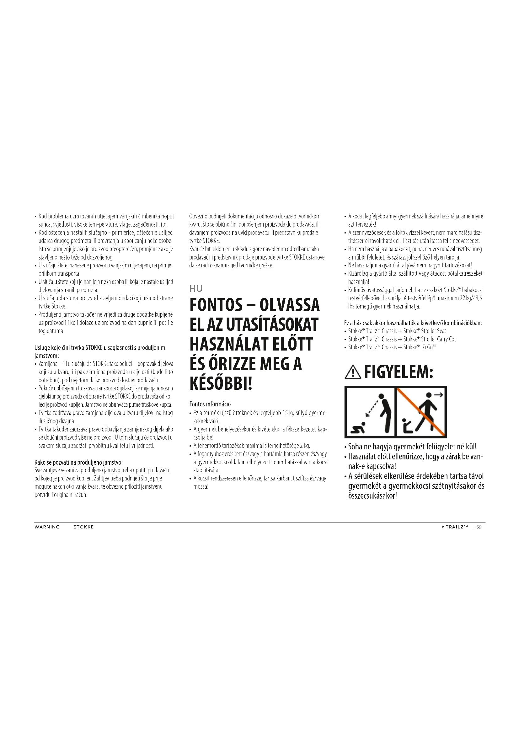 SOHA ne használja a babakocsit lépcsőn felfelé vagy lefelé úgy, hogy a gyermek a babakocsiban van. Váratlanul elveszítheti uralmát a babakocsi fölött vagy kieshet a gyermek a babakocsiból. Ha úgy használja a babakocsit a lépcsőn, hogy a gyermek benne van, a babakocsi is megsérülhet. Mielőtt lépcsőn használná a babakocsit, mindig vegye ki belőle a gyermeket. Reklamációs jog és kiterjesztett jótállás Világszerte alkalmazandó a Stokke® Trailz™, a továbbiakban „termék” néven említve.WARNING STOKKE