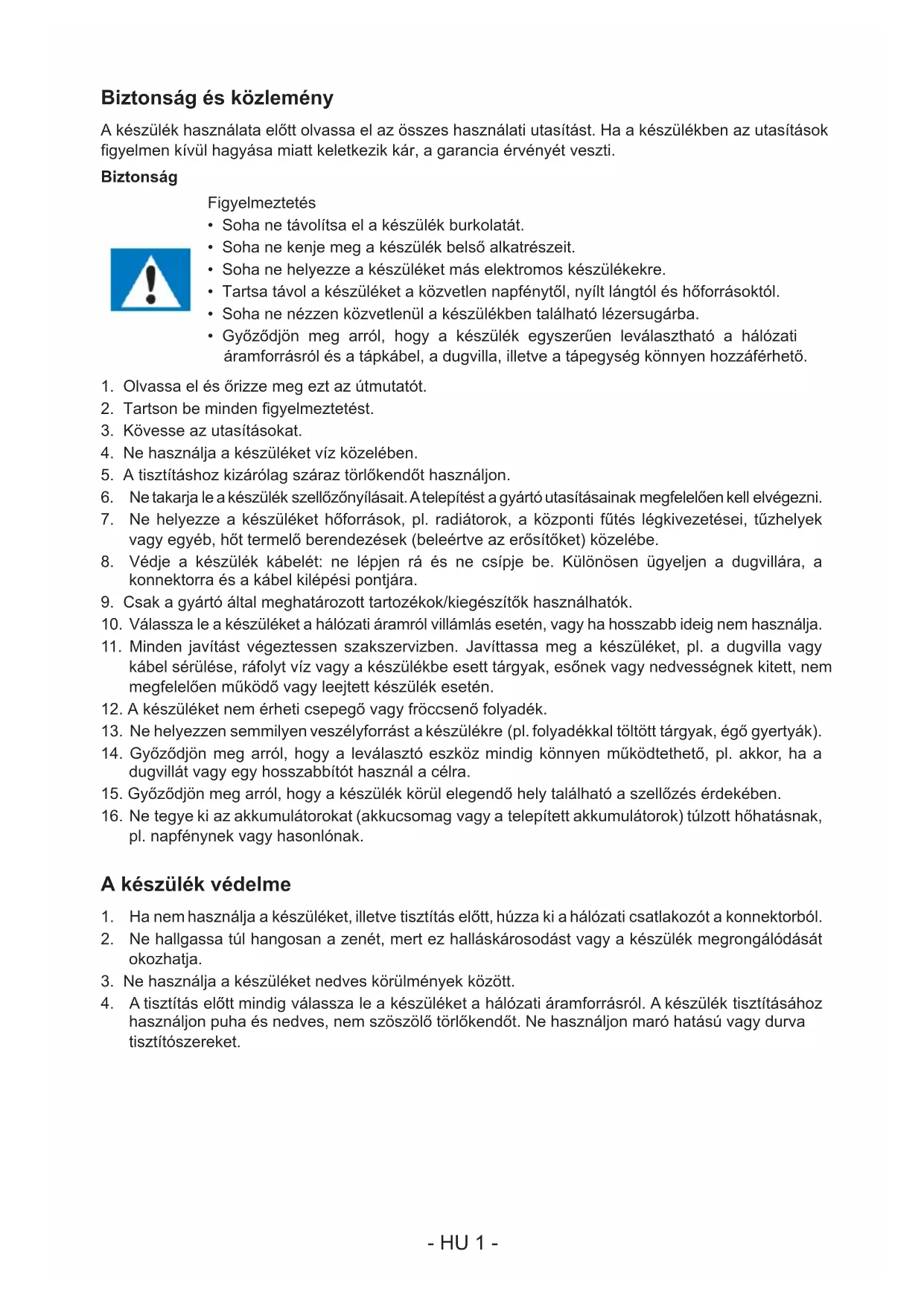 KÉRJÜK, A KÉSZÜLÉK MŰKÖDTETÉSE ELŐTT OLVASSA EL FIGYELMESEN EZT AZ ÚTMUTATÓT, ÉS ŐRIZZE MEG KÉSŐBBI FELHASZNÁLÁS CÉLJÁBÓL. HU- HU 1 - Biztonság és közlemény A készülék használata előtt olvassa el az összes használati utasítást. Ha a készülékben az utasítások gyelmen kívül hagyása miatt keletkezik kár, a garancia érvényét veszti. Biztonság Figyelmeztetés