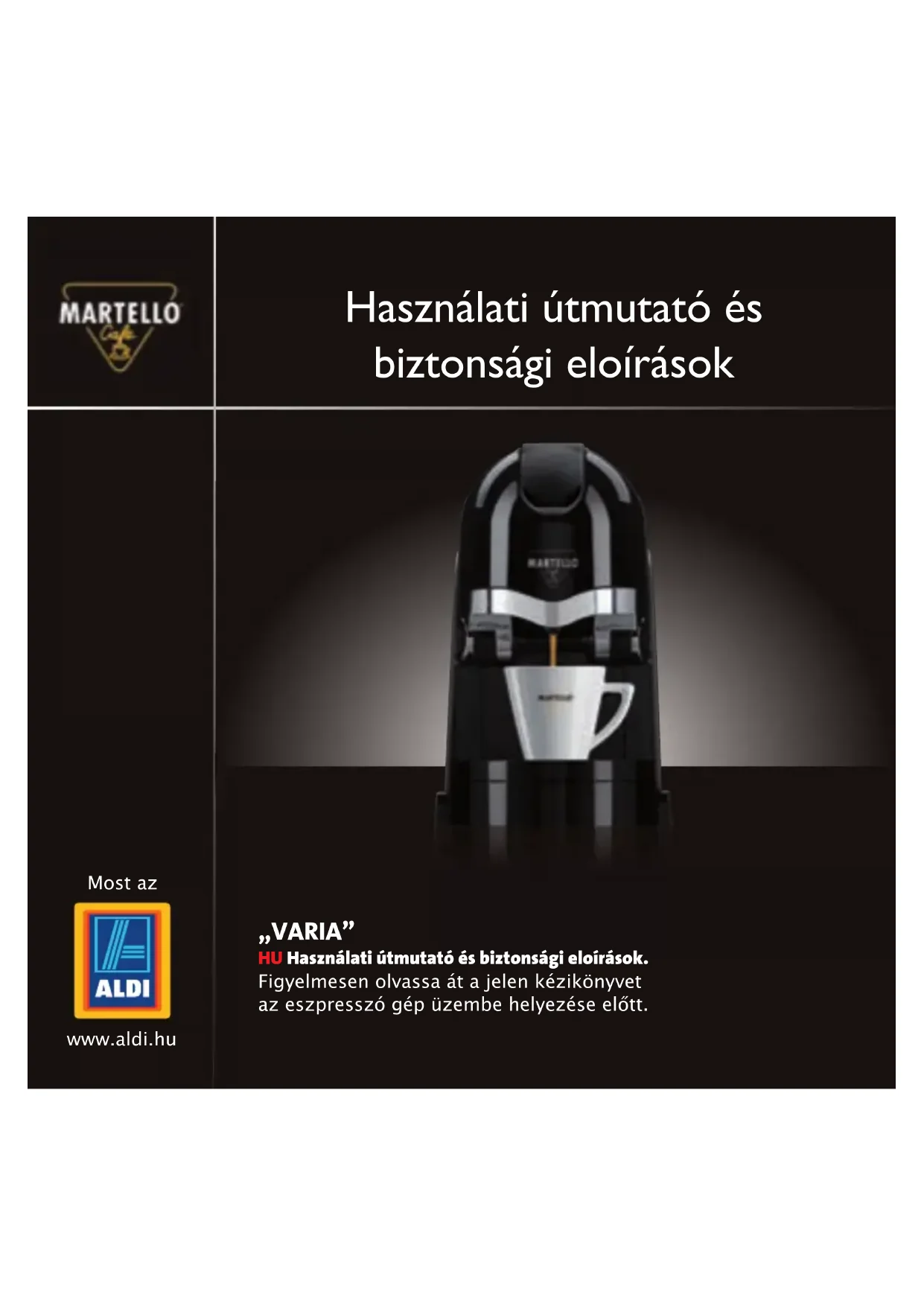 - MARTELLO_HoferVaria-2013_IM_IT_2013-08-27_IT 08.11.13 12:51 Seite 23Adesso disponibile in tutte le filiali ALDI SUISSE www.aldi-suisse.ch www.martello-cafe.com MARTELLO_HoferVaria-2013_IM_IT_2013-08-27_IT 08.11.13 12:51 Seite 24Használati útmutató és biztonsági eloírások „VARIA” HU Használati útmutató és biztonsági eloírások. Figyelmesen olvassa át a jelen kézikönyvet az eszpresszó gép üzembe helyezése előtt. Most az www.aldi.hu MARTELLO_HoferVaria-2013_IM_HU_2013-08-27_HU 08.11.13 12:59 Seite 1g MAGYAR TARTALOMJEGYZÉK Tartalomjegyzék p. 74