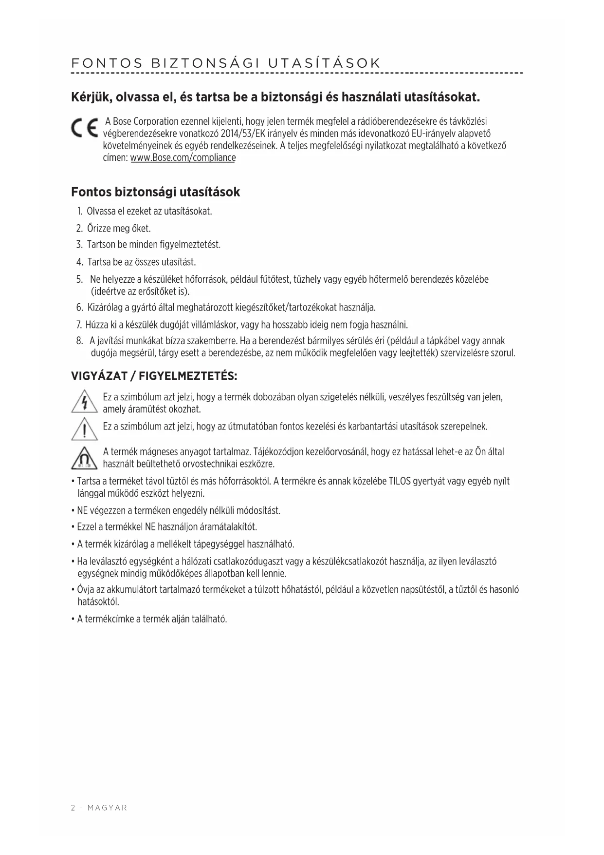 Kérjük, olvassa el, és tartsa be a biztonsági és használati utasításokat. A Bose Corporation ezennel kijelenti, hogy jelen termék megfelel a rádióberendezésekre és távközlési végberendezésekre vonatkozó 2014/53/EK irányelv és minden más idevonatkozó EU-irányelv alapvető követelményeinek és egyéb rendelkezéseinek. A teljes megfelelőségi nyilatkozat megtalálható a következő címen: www.Bose.com/compliance Fontos biztonsági utasítások