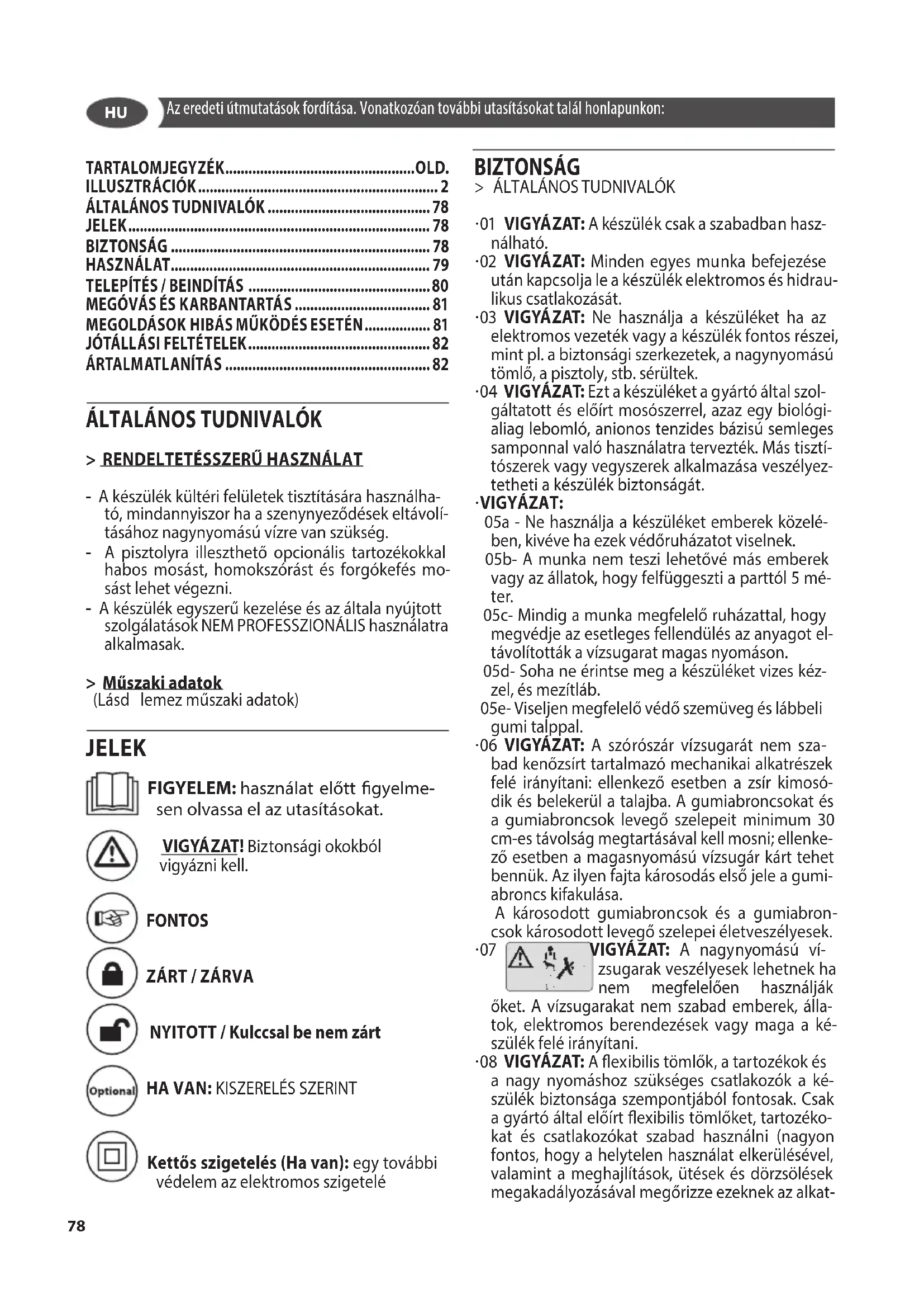 - 03 VIGYÁZAT: Ne használja a készüléket ha az elektromos vezeték vagy a készülék fontos részei, mint pl. a biztonsági szerkezetek, a nagynyomású tömlő, a pisztoly, stb. sérültek.
