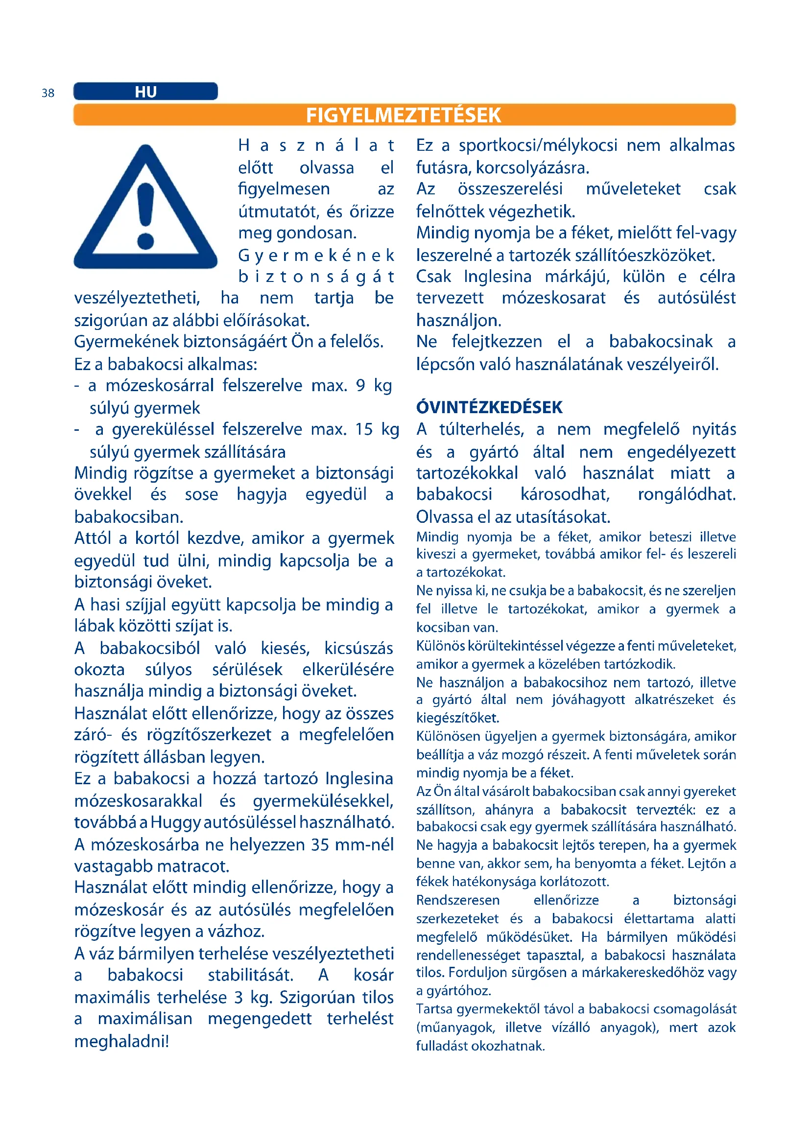 Használat előtt olvassa el gyelmesen az útmutatót, és őrizze meg gondosan. Gyermekének biztonságát veszélyeztetheti, ha nem tartja be szigorúan az alábbi előírásokat. Gyermekének biztonságáért Ön a felelős. Ez a babakocsi alkalmas: - a mózeskosárral felszerelve max. 9 kg súlyú gyermek - a gyereküléssel felszerelve max. 15 kg súlyú gyermek szállítására Mindig rögzítse a gyermeket a biztonsági övekkel és sose hagyja egyedül a babakocsiban. Attól a kortól kezdve, amikor a gyermek egyedül tud ülni, mindig kapcsolja be a biztonsági öveket. A hasi szíjjal együtt kapcsolja be mindig a lábak közötti szíjat is. A babakocsiból való kiesés, kicsúszás okozta súlyos sérülések elkerülésére használja mindig a biztonsági öveket. Használat előtt ellenőrizze, hogy az összes záró- és rögzítőszerkezet a megfelelően rögzített állásban legyen. Ez a babakocsi a hozzá tartozó Inglesina mózeskosarakkal és gyermekülésekkel, továbbá a Huggy autósüléssel használható. A mózeskosárba ne helyezzen 35 mm-nél vastagabb matracot. Használat előtt mindig ellenőrizze, hogy a mózeskosár és az autósülés megfelelően rögzítve legyen a vázhoz. A váz bármilyen terhelése veszélyeztetheti a babakocsi stabilitását. A kosár maximális terhelése 3 kg. Szigorúan tilos a maximálisan megengedett terhelést meghaladni! Ez a sportkocsi/mélykocsi nem alkalmas futásra, korcsolyázásra. Az összeszerelési műveleteket csak felnőttek végezhetik. Mindig nyomja be a féket, mielőtt fel-vagy leszerelné a tartozék szállítóeszközöket. Csak Inglesina márkájú, külön e célra tervezett mózeskosarat és autósülést használjon. Ne felejtkezzen el a babakocsinak a lépcsőn való használatának veszélyeiről.