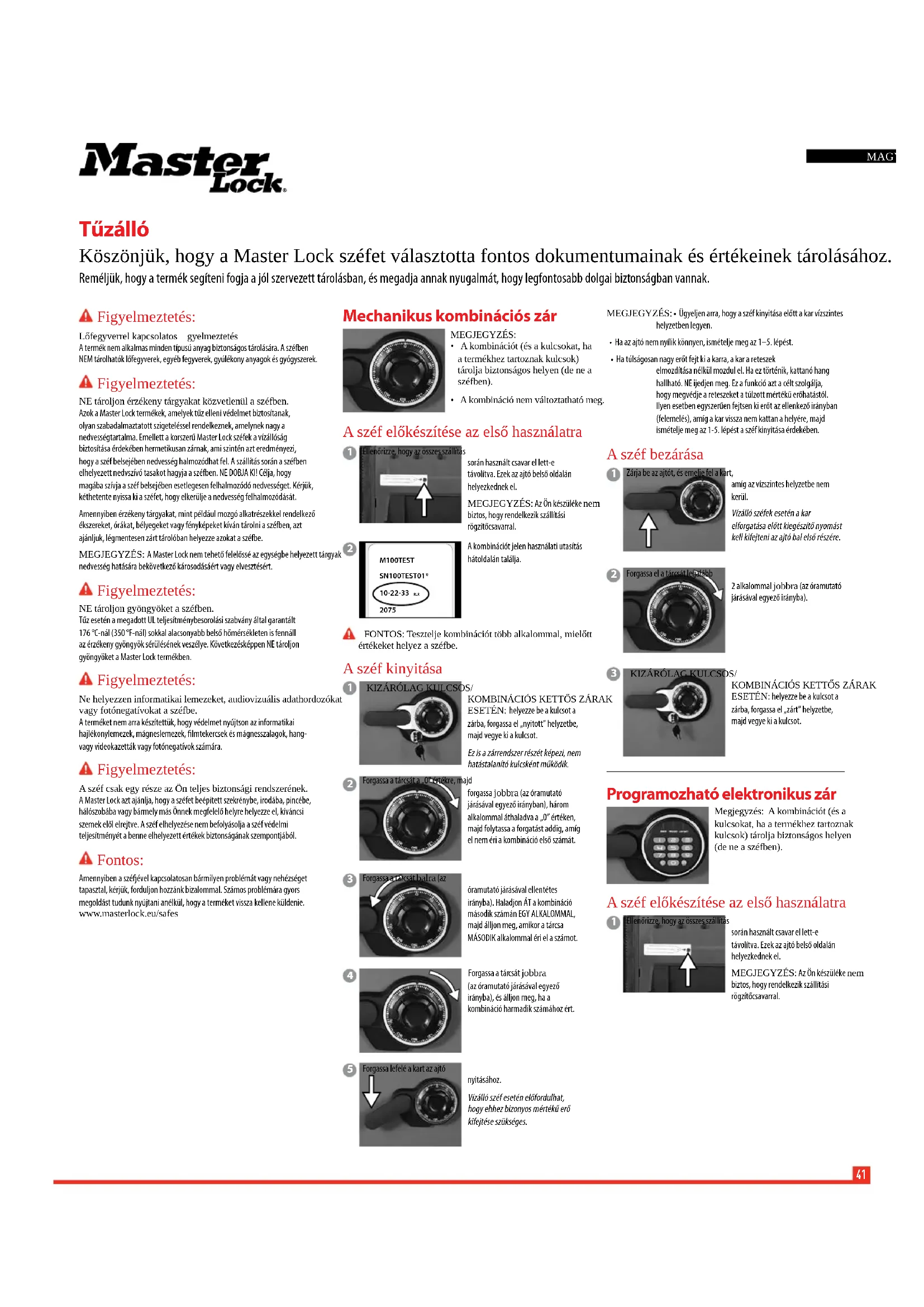 Ellenőrizze, hogy az összes szállítás során használt csavar el lett-e távolítva. Ezek az ajtó belső oldalán helyezkednek el.MEGJEGYZÉS: Az Ön készüléke nem biztos, hogy rendelkezik szállítási rögzítőcsavarral. Tűzálló Köszönjük, hogy a Master Lock széfet választotta fontos dokumentumainak és értékeinek tárolásához. Reméljük, hogy a termék segíteni fogja a jól szervezett tárolásban, és megadja annak nyugalmát, hogy legfontosabb dolgai biztonságban vannak. Figyelmeztetés: Lőfegyverrel kapcsolatos gyelmeztetésA termék nem alkalmas minden típusú anyag biztonságos tárolására. A széfben NEM tárolhatók lőfegyverek, egyéb fegyverek, gyúlékony anyagok és gyógyszerek. Figyelmeztetés: NE tároljon érzékeny tárgyakat közvetlenül a széfben.Azok a Master Lock termékek, amelyek tűz elleni védelmet biztosítanak, olyan szabadalmaztatott szigeteléssel rendelkeznek, amelynek nagy a nedvességtartalma. Emellett a korszerű Master Lock széfek a vízállóság biztosítása érdekében hermetikusan zárnak, ami szintén azt eredményezi, hogy a széf belsejében nedvesség halmozódhat fel. A szállítás során a széfben elhelyezett nedvszívó tasakot hagyja a széfben. NE DOBJA KI! Célja, hogy magába szívja a széf belsejében esetlegesen felhalmozódó nedvességet. Kérjük, kéthetente nyissa ki a széfet, hogy elkerülje a nedvesség felhalmozódását.Amennyiben érzékeny tárgyakat, mint például mozgó alkatrészekkel rendelkező ékszereket, órákat, bélyegeket vagy fényképeket kíván tárolni a széfben, azt ajánljuk, légmentesen zárt tárolóban helyezze azokat a széfbe.MEGJEGYZÉS: A Master Lock nem tehető felelőssé az egységbe helyezett tárgyak nedvesség hatására bekövetkező károsodásáért vagy elvesztésért. Figyelmeztetés: NE tároljon gyöngyöket a széfben.Tűz esetén a megadott UL teljesítménybesorolási szabvány által garantált 176 °C-nál (350 °F-nál) sokkal alacsonyabb belső hőmérsékleten is fennáll az érzékeny gyöngyök sérülésének veszélye. Következésképpen NE tároljon gyöngyöket a Master Lock termékben. Figyelmeztetés: Ne helyezzen informatikai lemezeket, audiovizuális adathordozókat vagy fotónegatívokat a széfbe.A terméket nem arra készítettük, hogy védelmet nyújtson az informatikai hajlékonylemezek, mágneslemezek, lmtekercsek és mágnesszalagok, hang- vagy videokazetták vagy fotónegatívok számára. Figyelmeztetés: A széf csak egy része az Ön teljes biztonsági rendszerének.A Master Lock azt ajánlja, hogy a széfet beépített szekrénybe, irodába, pincébe, hálószobába vagy bármely más Önnek megfelelő helyre helyezze el, kíváncsi szemek elől elrejtve. A széf elhelyezése nem befolyásolja a széf védelmi teljesítményét a benne elhelyezett értékek biztonságának szempontjából. Fontos: Amennyiben a széével kapcsolatosan bármilyen problémát vagy nehézséget tapasztal, kérjük, forduljon hozzánk bizalommal. Számos problémára gyors megoldást tudunk nyújtani anélkül, hogy a terméket vissza kellene küldenie. www.masterlock.eu/safes Mechanikus kombinációs zár MEGJEGYZÉS: • A kombinációt (és a kulcsokat, ha a termékhez tartoznak kulcsok) tárolja biztonságos helyen (de ne a széfben).• A kombináció nem változtatható meg. A széf előkészítése az első használatra