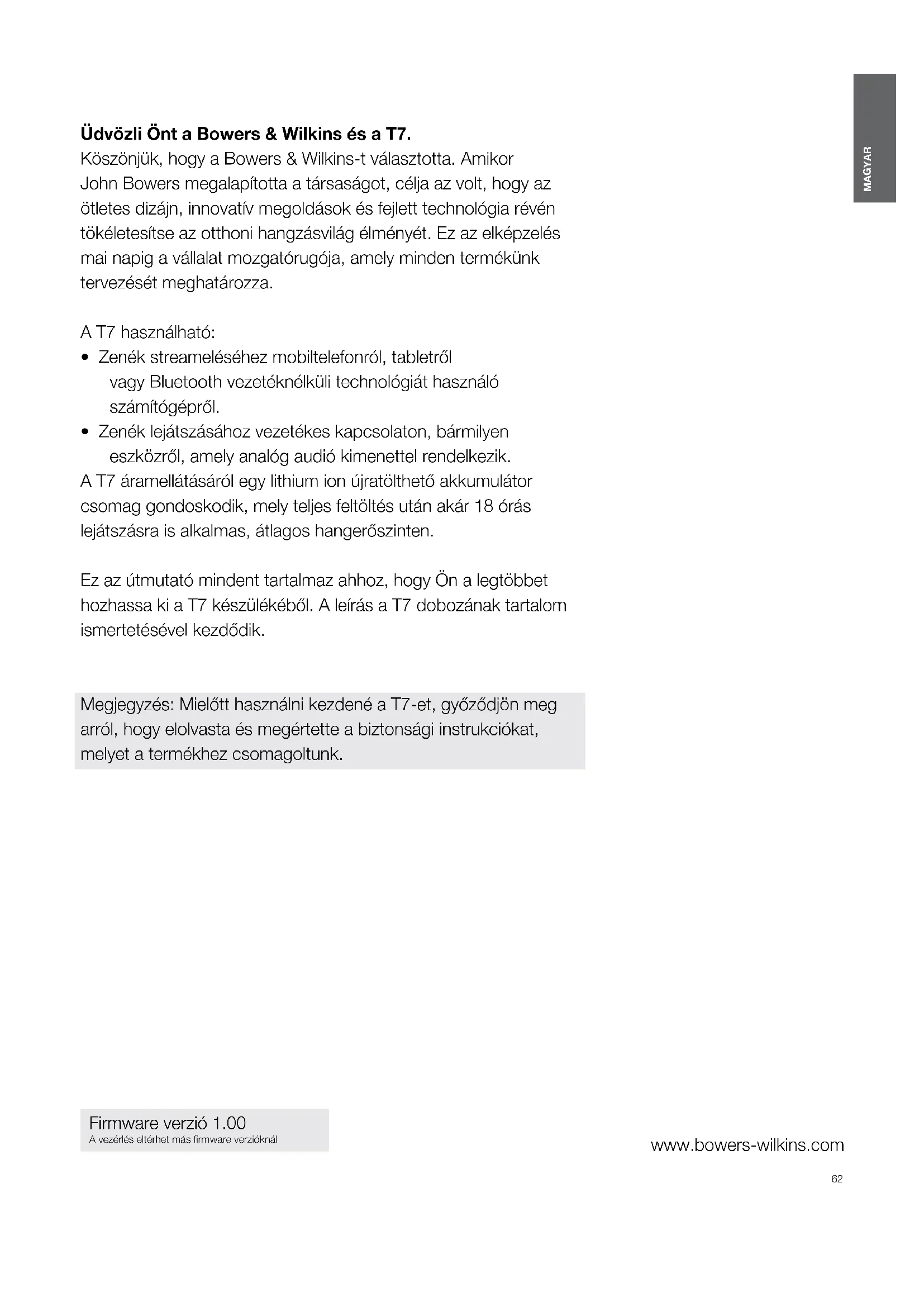 MAGYAR www.bowers-wilkins.com Üdvözli Önt a Bowers & Wilkins és a T7. Köszönjük, hogy a Bowers & Wilkins-t választotta. Amikor John Bowers megalapította a társaságot, célja az volt, hogy az ötletes dizájn, innovatív megoldások és fejlett technológia révén tökéletesítse az otthoni hangzásvilág élményét. Ez az elképzelés mai napig a vállalat mozgatórugója, amely minden termékünk tervezését meghatározza. A T7 használható: