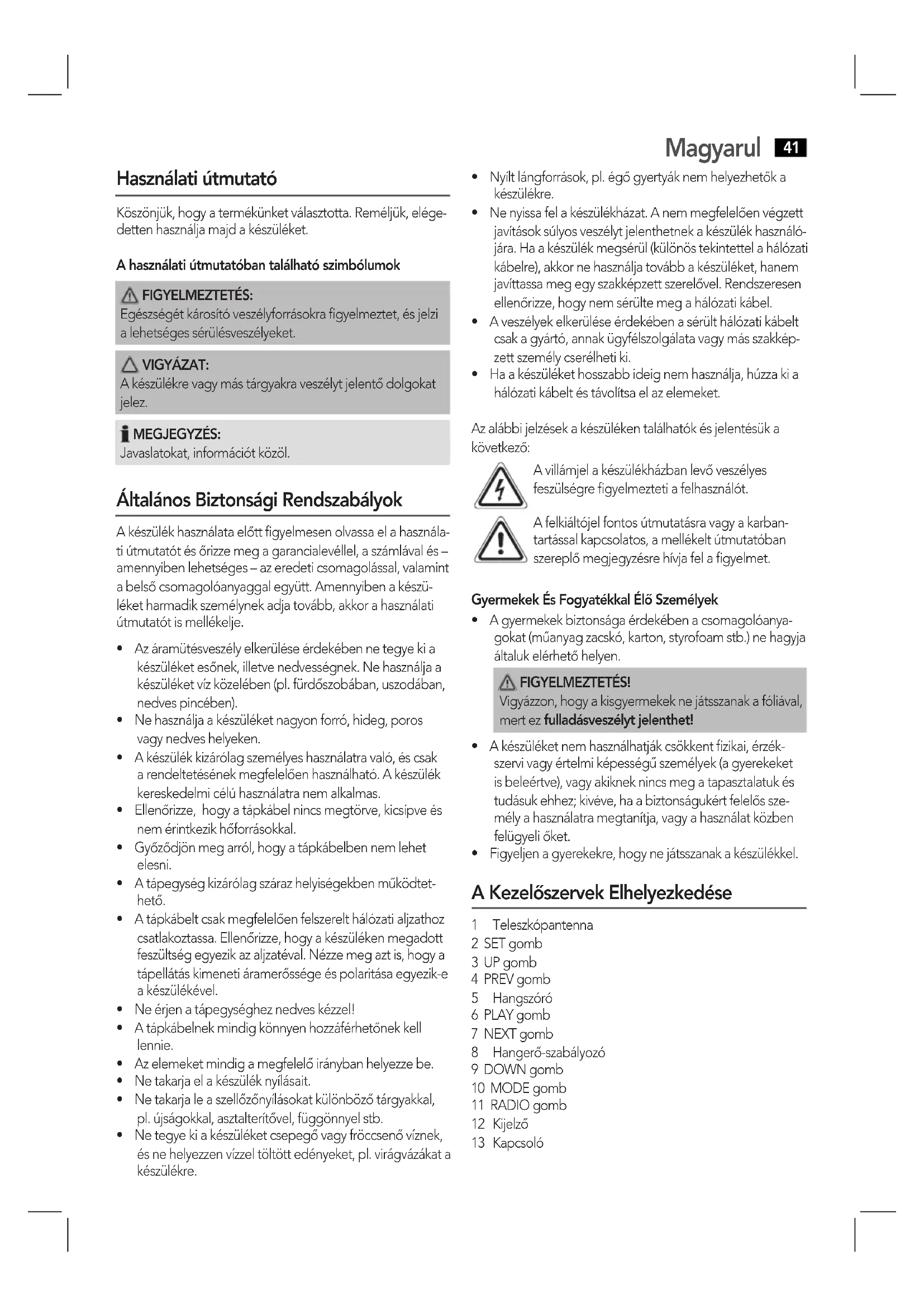 - Figyeljenagyerekekre,hogynejátsszanakakészülékkel. A Kezelőszervek Elhelyezkedése 1 Teleszkópantenna 2 SET gomb 3 UP gomb 4 PREV gomb 5 Hangszóró 6 PLAY gomb 7 NEXT gomb 8 Hangerő-szabályozó 9 DOWN gomb 10 MODE gomb 11 RADIO gomb 12 Kijelző 13 KapcsolóMagyarul