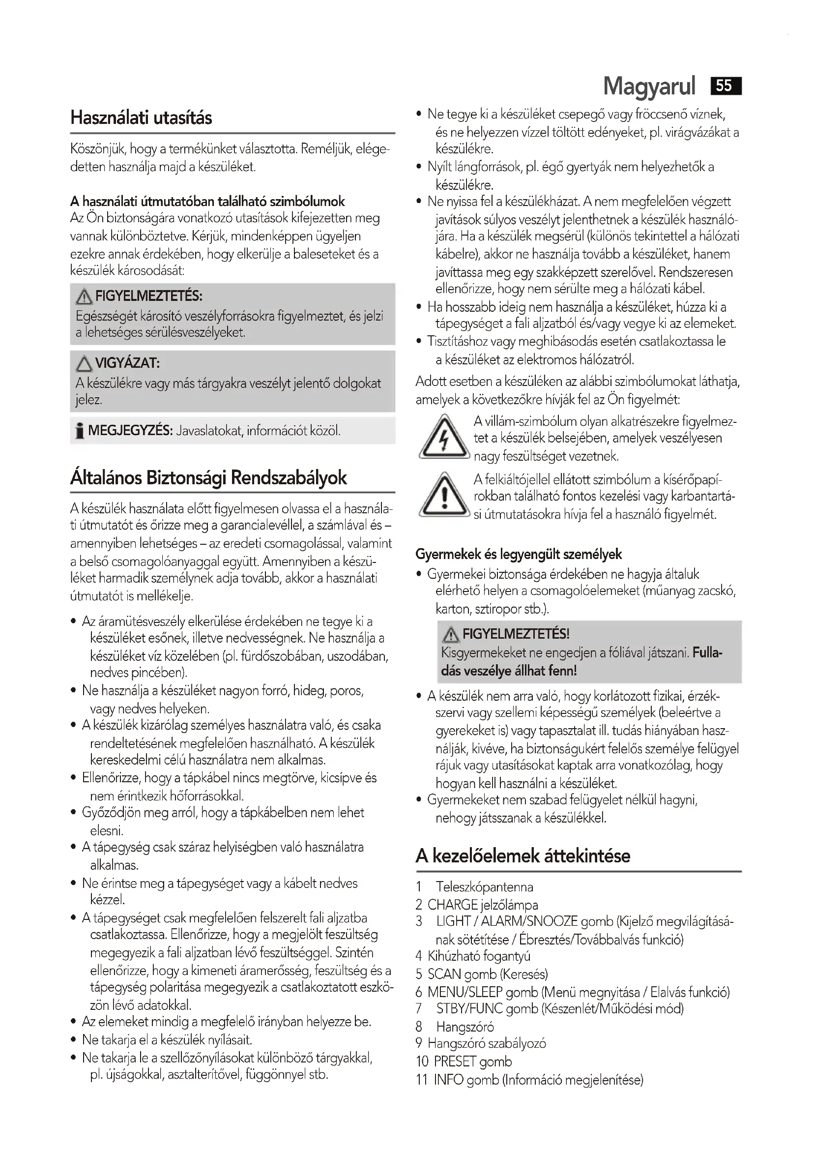 - Gyermekeket nem szabad felügyelet nélkül hagyni, nehogy játsszanak a készülékkel. A kezelőelemek áttekintése 1 Teleszkópantenna 2 CHARGE jelzőlámpa 3 LIGHT / ALARM/SNOOZE gomb (Kijelző megvilágításá- nak sötétítése / Ébresztés/Továbbalvás funkció) 4 Kihúzható fogantyú 5 SCAN gomb (Keresés) 6 MENU/SLEEP gomb (Menü megnyitása / Elalvás funkció) 7 STBY/FUNC gomb (Készenlét/Működési mód) 8 Hangszóró 9 Hangszóró szabályozó 10 PRESET gomb 11 INFO gomb (Információ megjelenítése)Magyarul